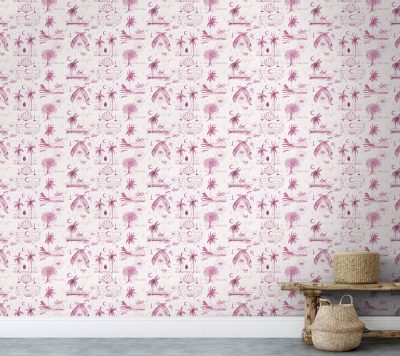 Lovers of all things nautical, this one’s for you. Covered in marine motifs, such as palmetto trees, tropical fish and seashells, this wallpaper is a great addition to any beach house. We also love the bright pink hue for a fun punch of color. Toile, Hot Lips, brierandbyrd.com
