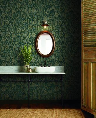 Who said toile couldn’t be dark and moody? This luxurious print is presented in bright metallic gold on a rich emerald background for a focal point design just begging to be put in a powder room. The moody palette is juxtaposed with playful peacock and tree drawings. Menagerie Toile, Emerald & Metallic Gold, yorkwallcoverings.com