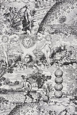 Reminiscent of Renaissance drawings, this large-scale print is full of layered mystical elements for a whimsical yet classic appeal. Pastoral elements overlapped with astrological icons make this head-turning print the perfect choice for a statement room. Modern Toile, Black, schumacher.com