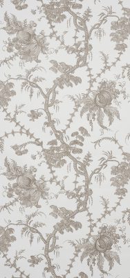 Airy and elegant, this print is full of twisting branches and flowers based on a copper plate engraving for a beautiful etched effect. The minimally saturated gray hue plays with a white background for a gorgeous, fresh paper perfect for a bedroom. Toile De Fleurs, Grosaille, kathykuohome.com