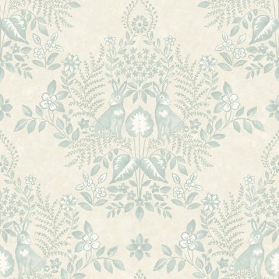 Bunnies and greenery, what more do you need? This peel-and-stick print provides a welcome symmetric take on toile balanced with curious rabbits and damask thickets of vines. The fi nishing touch: A watercolor eff ect. We particularly love this print for a bathroom. Cottontail Toile, Wicker, yorkwallcoverings.com