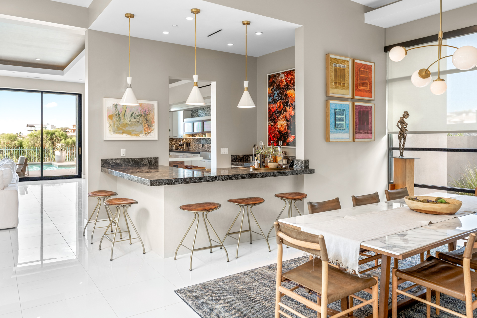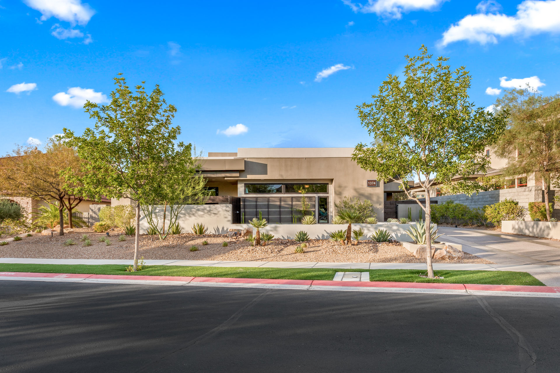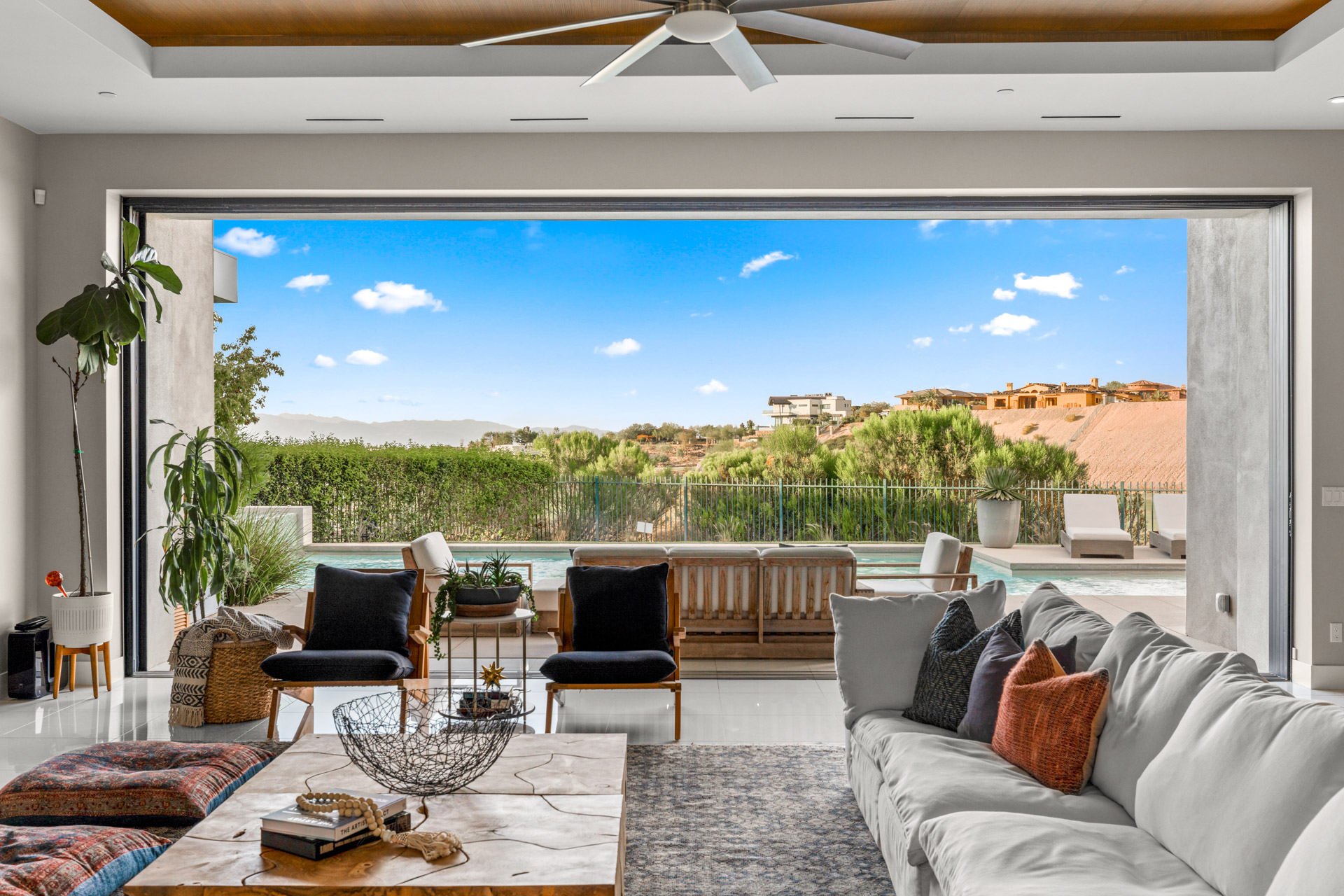 This warm, contemporary desert-designed home was inspired by some of the most spectacular views of the Las Vegas Strip, green double fairways, lake and mountain views. This 5-bedroom, 7-bath home with 6,100 square feet, has an abundance of natural light, which flows room to room. With a wall of pocketing glass sliders this home truly experiences that indoor/outdoor living. In addition, there is an interior courtyard that opens to adjoining rooms and gives the home a tranquil and peaceful feel.