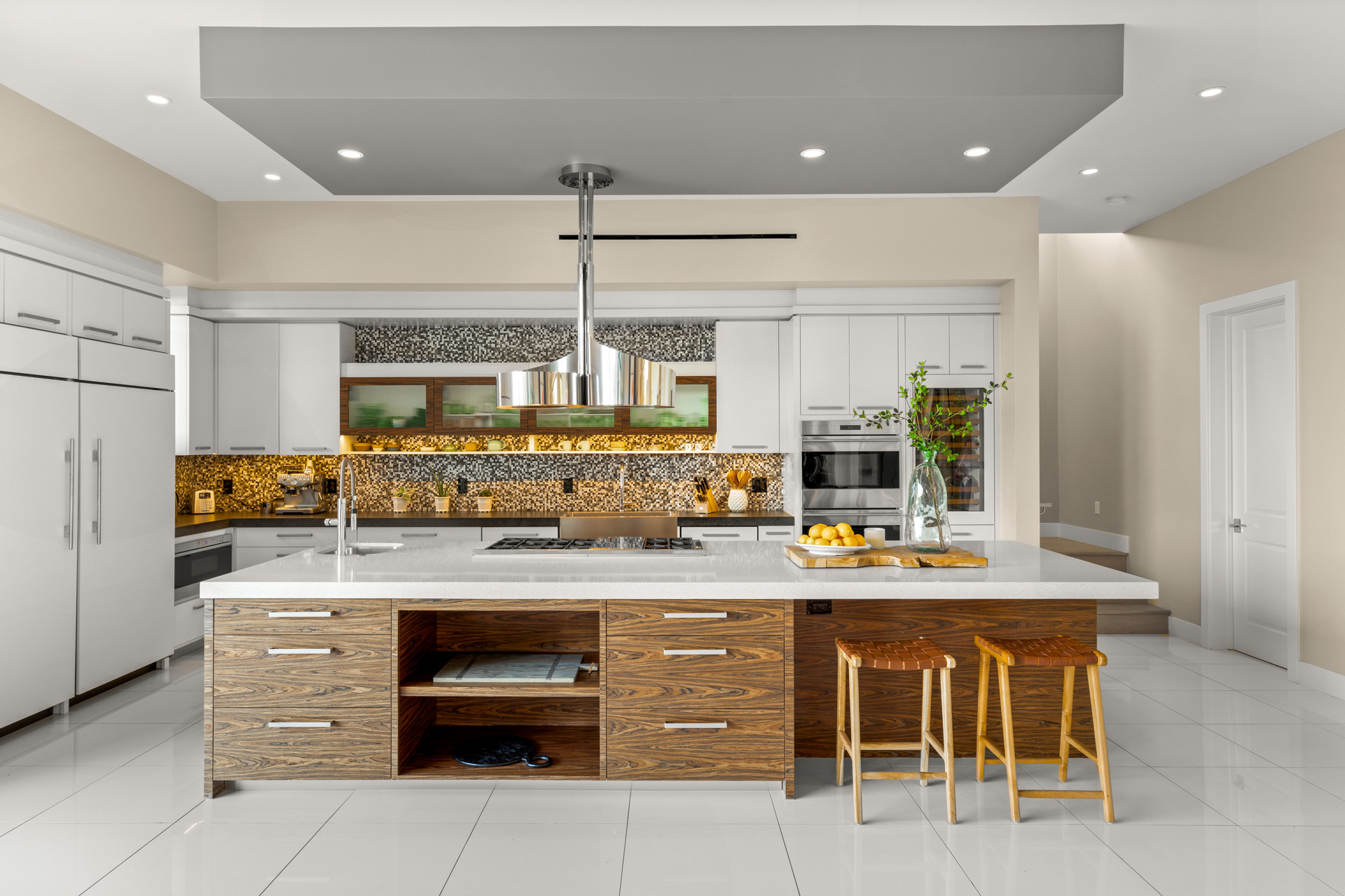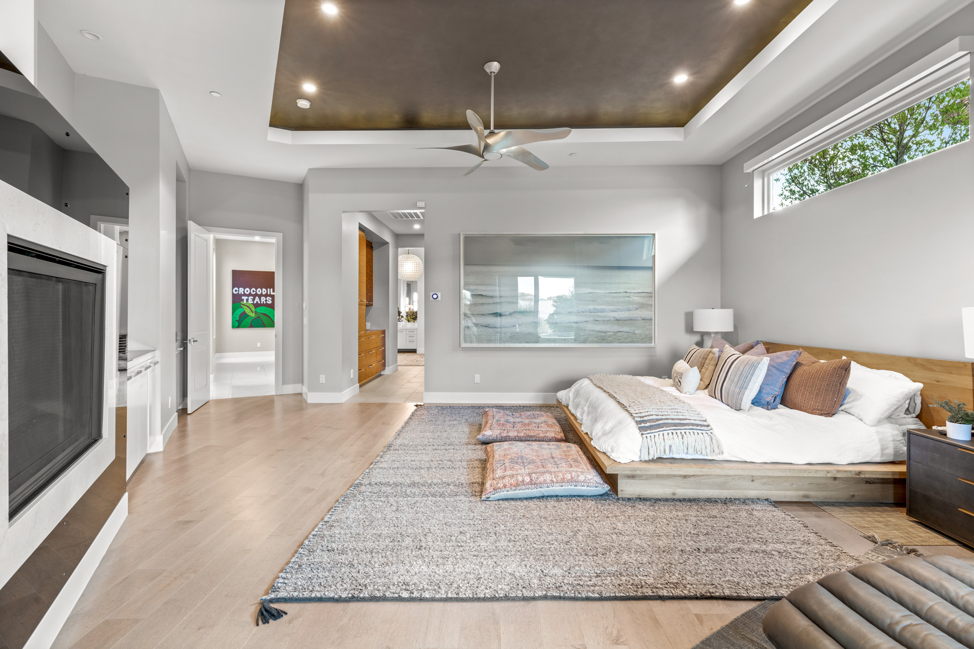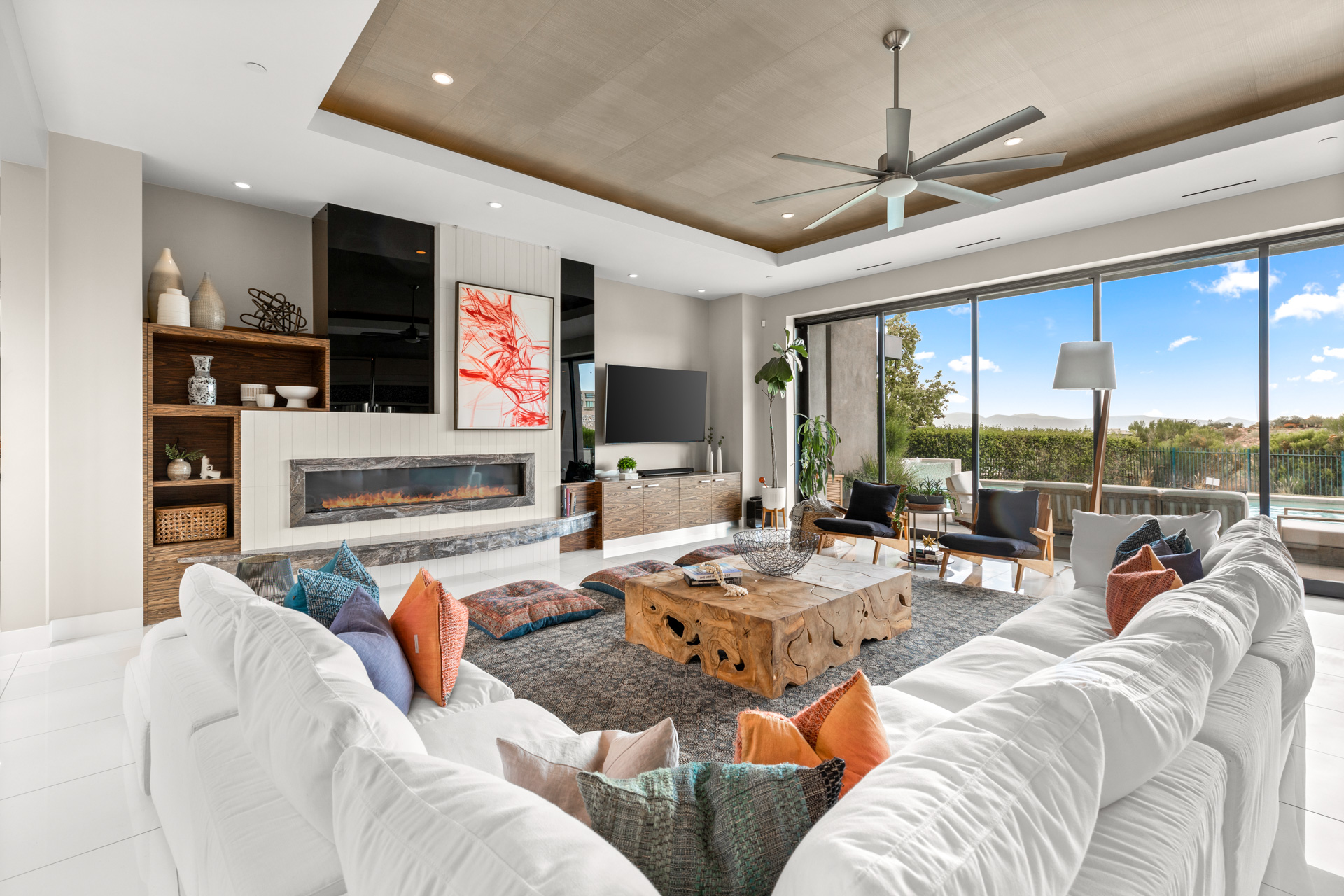 This warm, contemporary desert-designed home was inspired by some of the most spectacular views of the Las Vegas Strip, green double fairways, lake and mountain views. This 5-bedroom, 7-bath home with 6,100 square feet, has an abundance of natural light, which flows room to room. With a wall of pocketing glass sliders this home truly experiences that indoor/outdoor living. In addition, there is an interior courtyard that opens to adjoining rooms and gives the home a tranquil and peaceful feel.