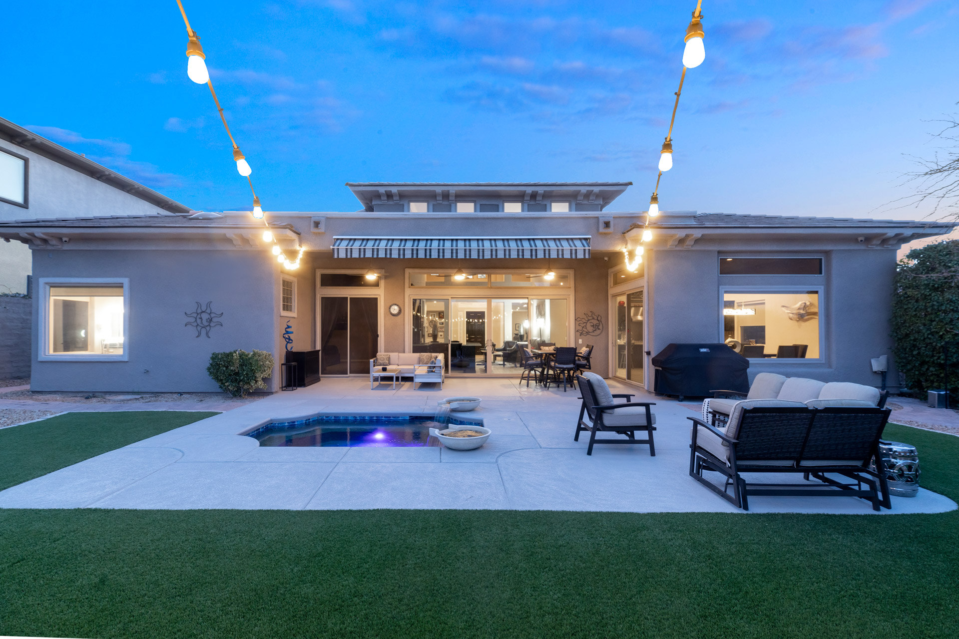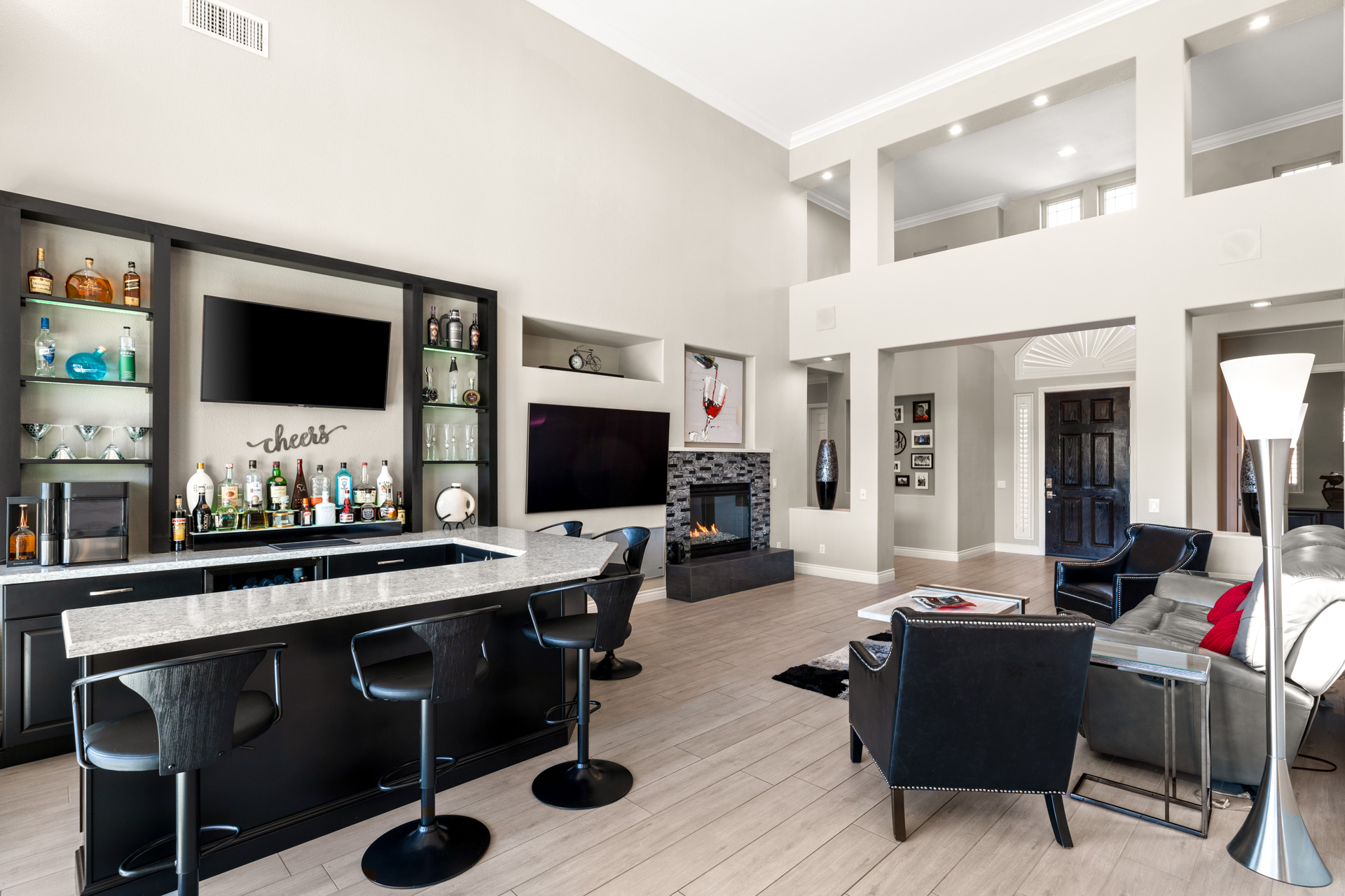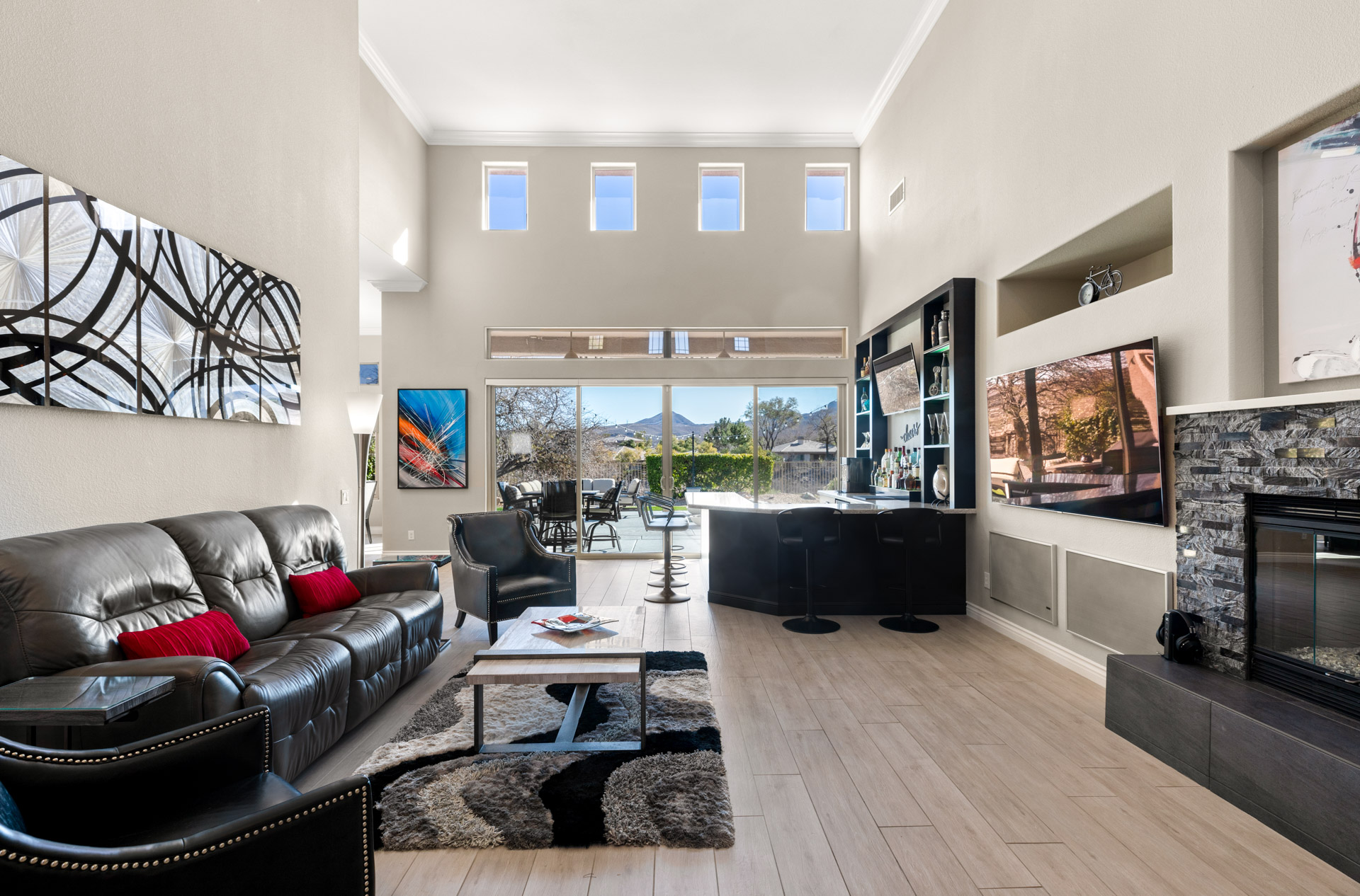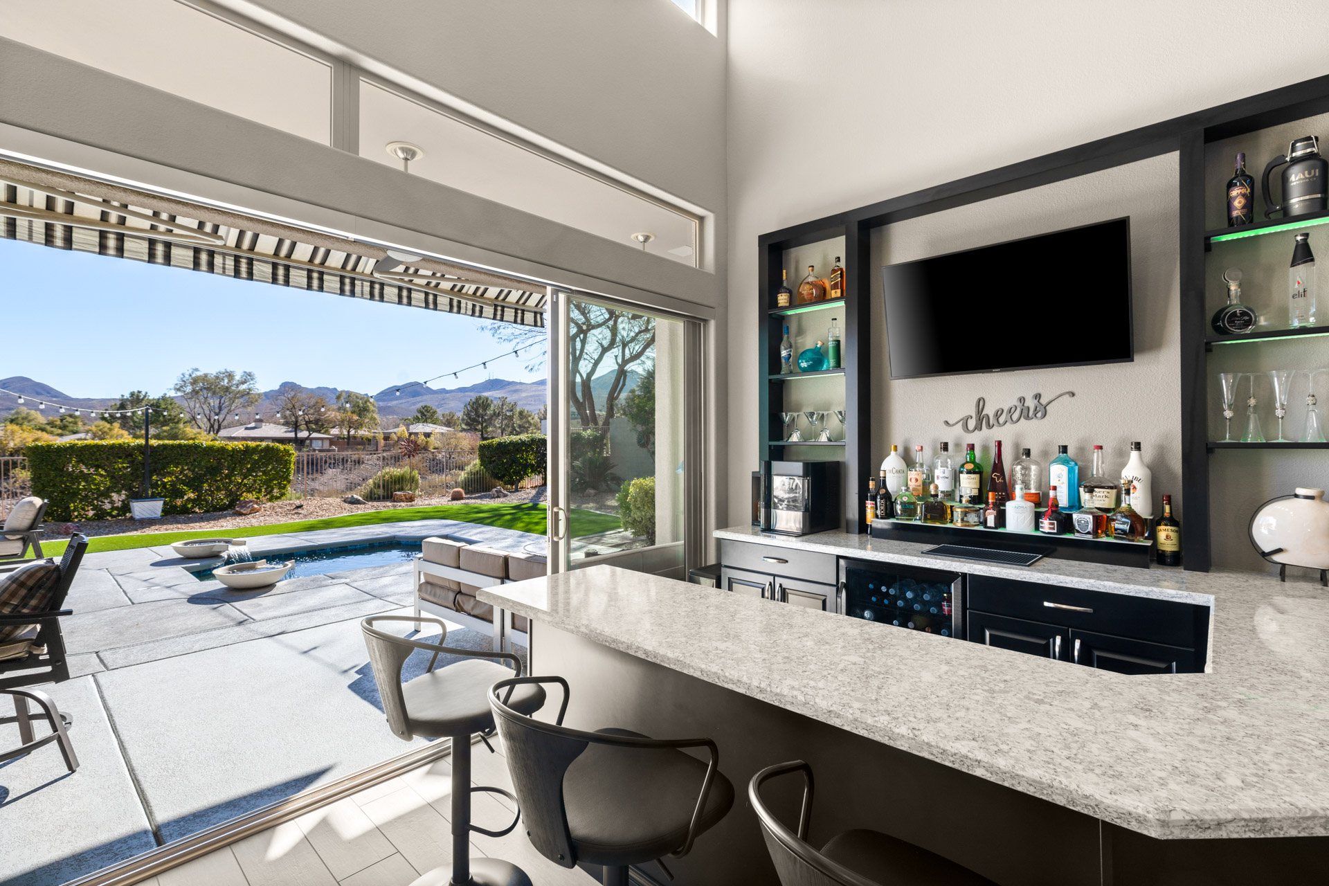 A custom-gated courtyard creates a graceful sense of arrival, leading into expansive interiors defined by soaring ceilings and an abundance of natural light. The great roomāanchored by a sleek, contemporary fireplace and a bespoke cocktail barāoffers the ideal setting for both intimate gatherings and large-scale entertaining. Seamlessly connected to the outdoors through wide sliding glass doors, the space opens onto a covered patio overlooking the desert arroyoāa rare backdrop that ensures both privacy and breathtaking, ever-changing scenery.