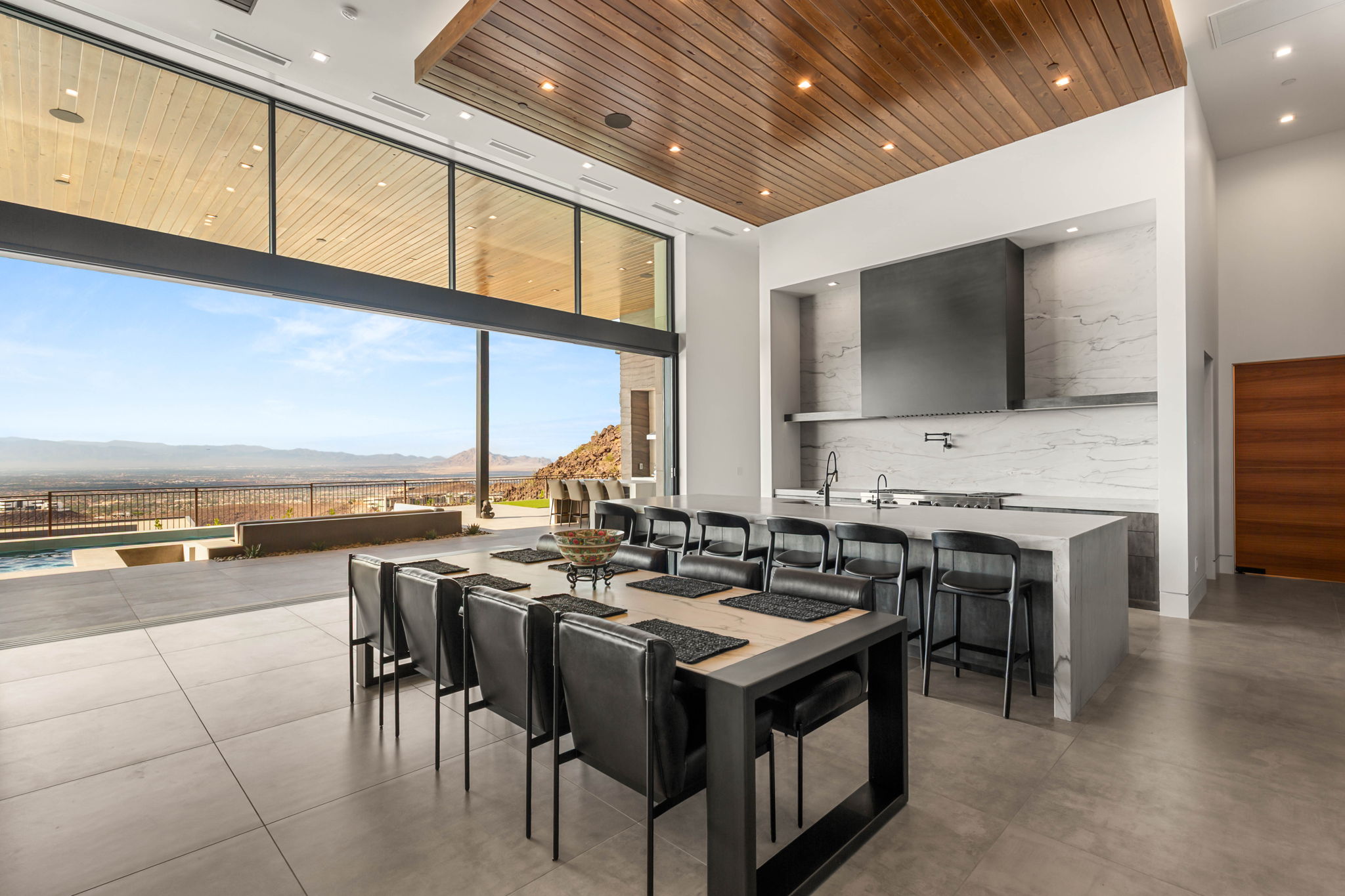 From the moment you arrive, this residence captivates. A massive pivoting glass front door welcomes you into a sophisticated open layout defined by soaring ceilings, designer finishes, and walls of pocketing glass that blur the lines between indoor and outdoor living. Rare architectural concrete has been thoughtfully incorporated into the front entryway and great room, adding a raw, sculptural elegance that sets this home apart. Wood ceilings in various rooms throughout bring warmth and dimension, creating a rich contrast to the clean modern lines. The heart of the home is a state-of-the-art chefās kitchen outfitted with top-of-the-line stainless steel appliances, an oversized waterfall island with seating, and ample storage for both form and function. Adjacent to the kitchen is an elegant bar area that serves both the interior and exterior entertaining spaces, complete with a wine fridge, ice maker, mini fridge, and bar seatingāperfect for hosting gatherings in any season. Thoughtfully designed for modern living, the home includes 6 spacious ensuite bedrooms, with the 6th currently used as a home office. The primary suite is a private retreat featuring its own fireplace, wet bar, dual custom closets (one with a center island), a walk-in steam shower, standalone soaking tub, two separate vanities, and dual water closets. Automated blackout shades in all bedrooms offer comfort and convenience at the touch of a button. This home is built for more than just relaxationāitās also a haven for wellness and entertainment. A dedicated gym room, private theater, and separate media/game area ensure thereās something for everyone. For convenience, the home includes two separate laundry rooms and a 4-car side-loading garage with additional storage. Outside, the resort-style backyard invites you to unwind in true Nevada style. Enjoy the pool with adjacent spa featuring an infinity edge that cascades into the water below, a sunken lounge with built-in fire pit, and a covered patio with space to relax or entertain. A separate outdoor zen area with a sauna offers a peaceful place to recharge. Located in the ultra-luxury community of Ascaya, residents enjoy 24/7 guard-gated security and access to world-class amenities including a clubhouse, fitness center, tennis and pickleball courts, and curated social events. Homes of this caliber, in this setting, are exceedingly rare. 6 Hidden Heights Court is more than a homeāitās a private sanctuary above the city, combining bold design, privacy, and unmatched views in one exceptional offering.