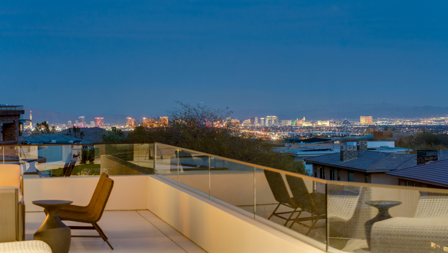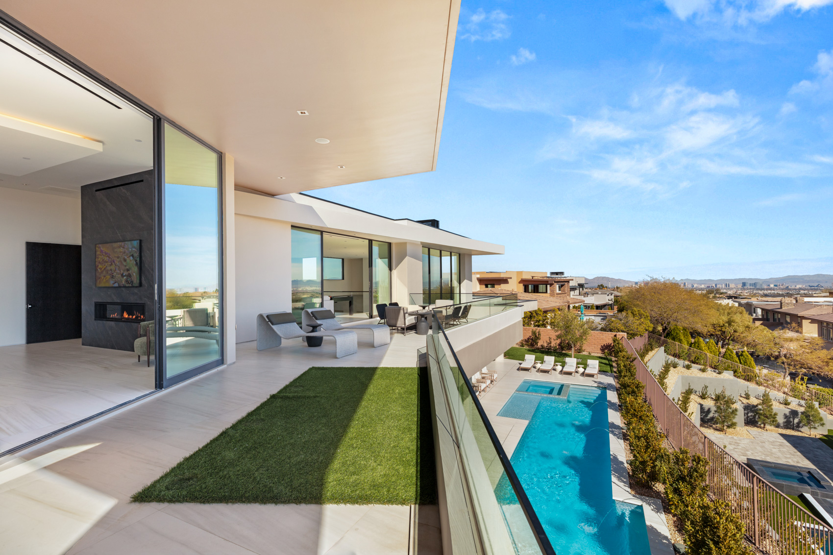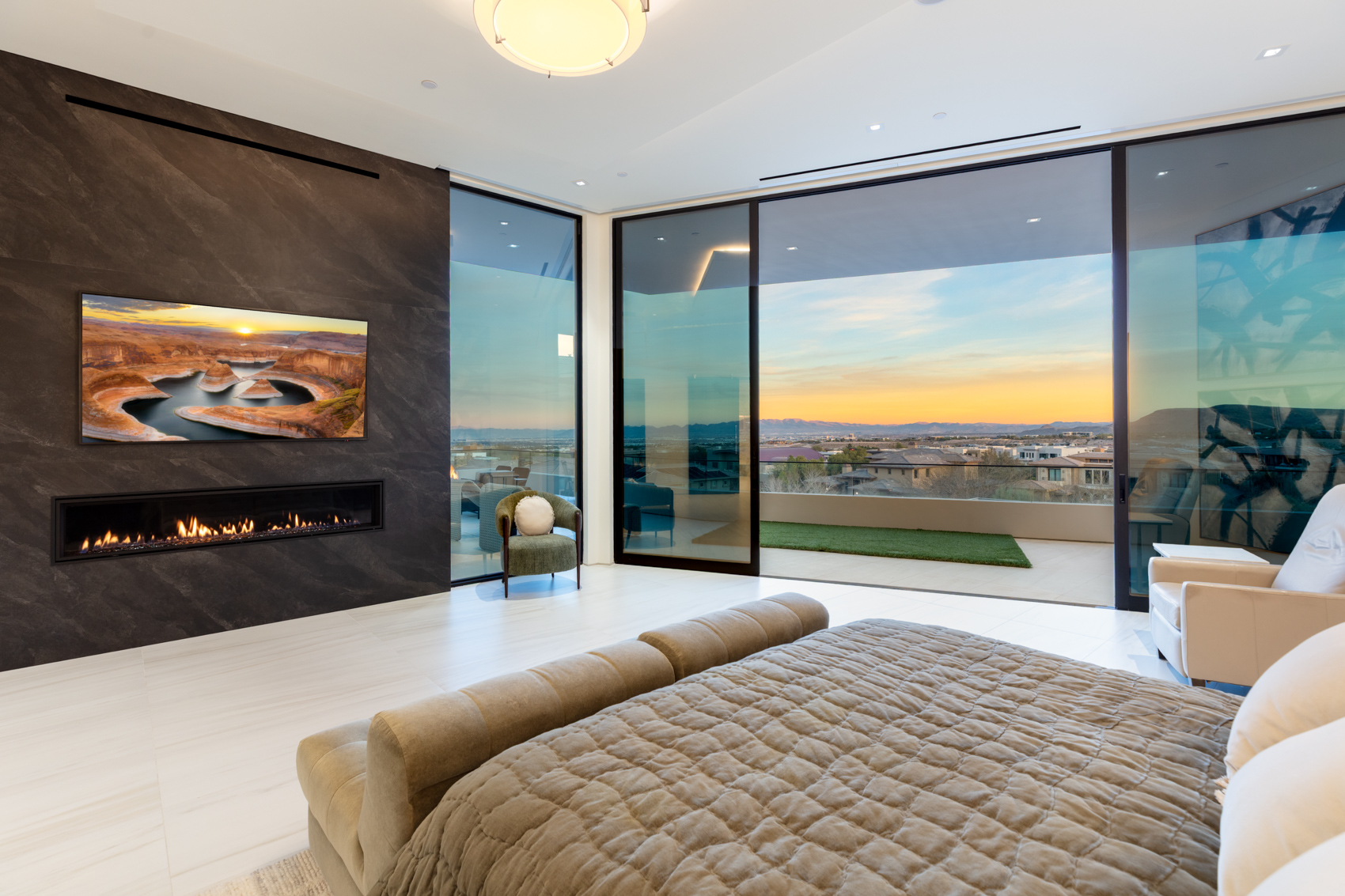 The chef’s kitchen is a true centerpiece, appointed with a striking waterfall island, top-of-the-line stainless steel appliances, and a separate butler’s pantry for effortless entertaining. Designer finishes are carried throughout the home, elevating every room with a cohesive, contemporary aesthetic. The residence offers four bedrooms and five baths, including three bedrooms on the main level. A junior suite downstairs features its own beverage station with wine bar and a spa-inspired bath complete with a freestanding soaking tub and oversized walk-in shower with body jets. A dedicated gym/wellness guest room includes a dry sauna, creating a private retreat within the home. Upstairs, the primary suite is a sanctuary unto itself. Panoramic views stretch toward the Las Vegas Strip, best enjoyed from the wraparound balcony with fire pit. The spa-like primary bath features a freestanding soaking tub, oversized walk-in shower with waterfall rain head and multiple body jets, dual vanities, and two custom walk-in closets with built-in lighting—one thoughtfully designed with a full-size washer and dryer for added convenience. Set on a generous 0.46-acre homesite, the backyard is curated for year-round enjoyment. A covered patio with embedded ceiling heaters overlooks the pool and spa with water features, expansive sun lounge areas, and a separate outdoor dining space adjacent to the built-in BBQ. Located within the guard-gated community of The Ridges, one of Las Vegas’ most prestigious enclaves, residents enjoy privacy, security, and proximity to world-class golf, dining, and recreation. Opportunities to acquire a nearly new custom home of this caliber—designed, built, and maintained by its original owner—are exceptionally rare.