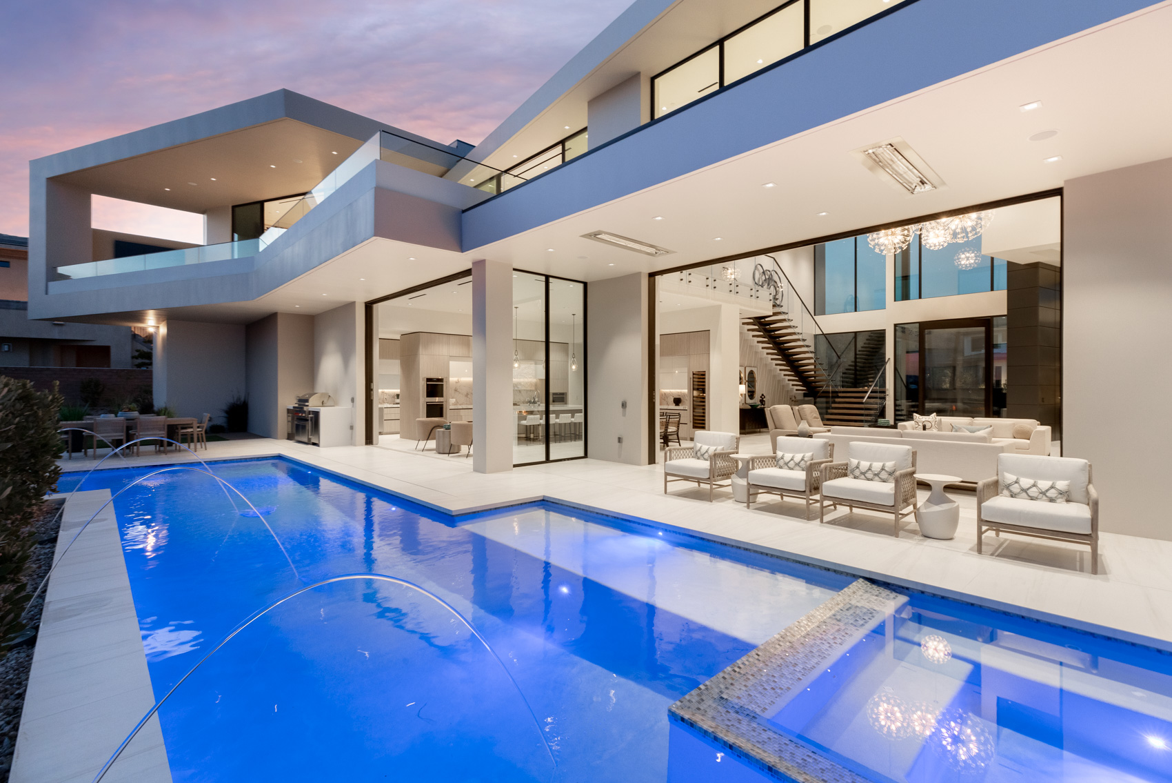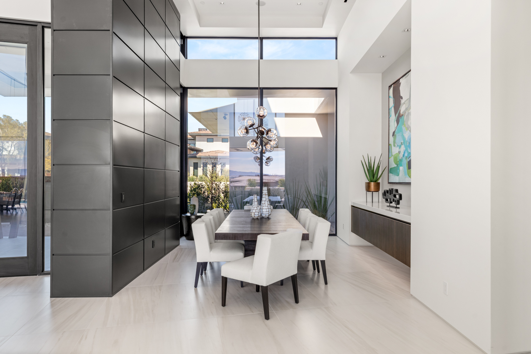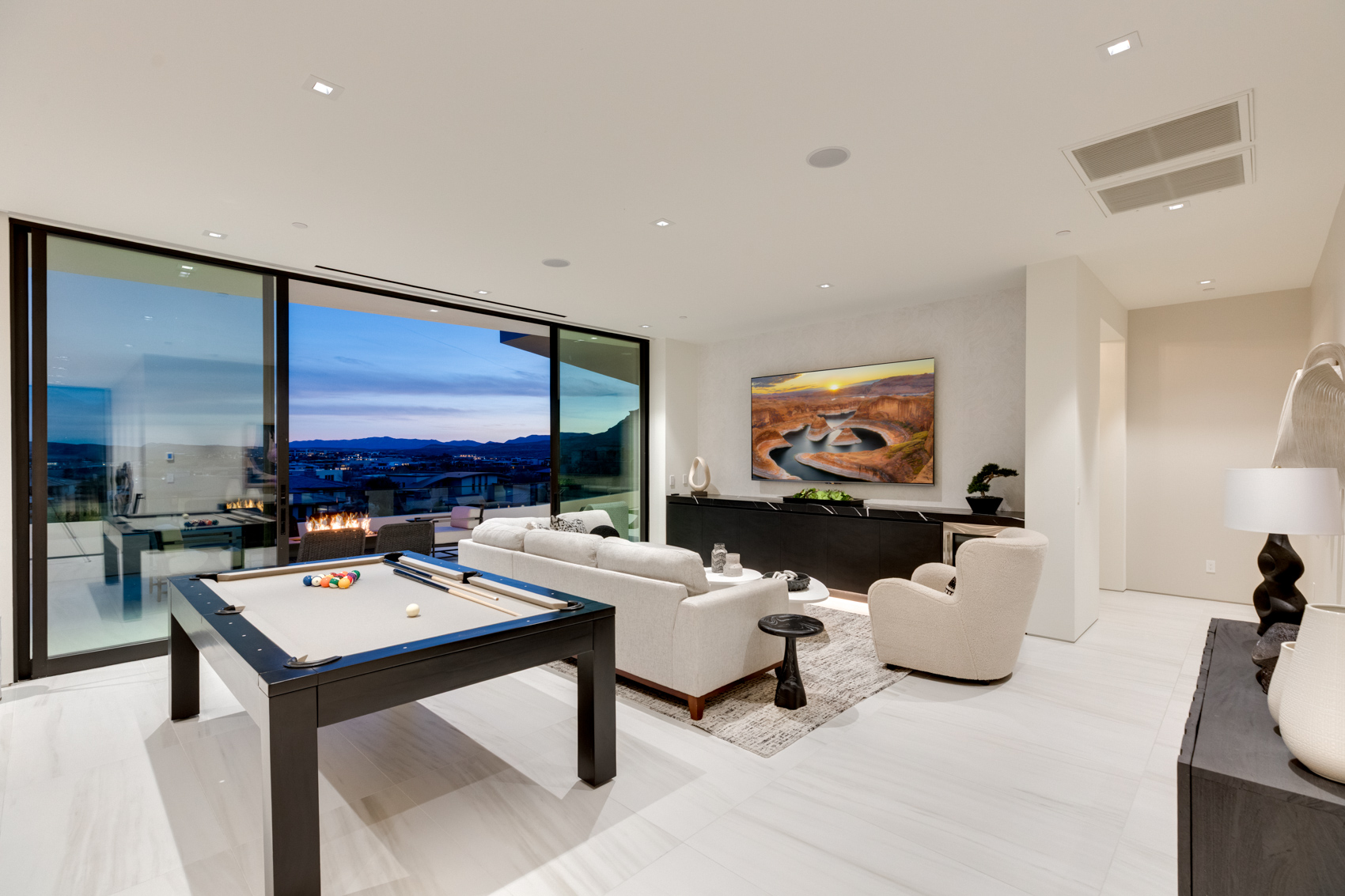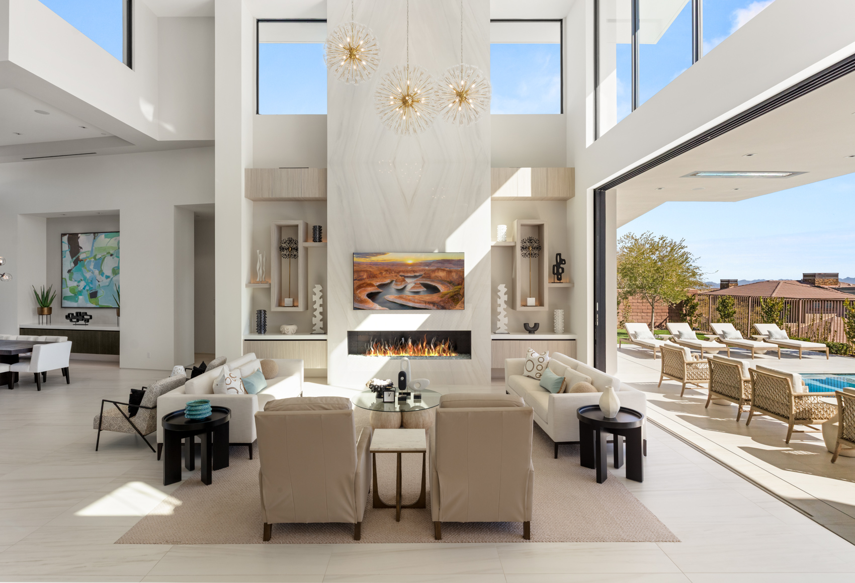The chef’s kitchen is a true centerpiece, appointed with a striking waterfall island, top-of-the-line stainless steel appliances, and a separate butler’s pantry for effortless entertaining. Designer finishes are carried throughout the home, elevating every room with a cohesive, contemporary aesthetic. The residence offers four bedrooms and five baths, including three bedrooms on the main level. A junior suite downstairs features its own beverage station with wine bar and a spa-inspired bath complete with a freestanding soaking tub and oversized walk-in shower with body jets. A dedicated gym/wellness guest room includes a dry sauna, creating a private retreat within the home. Upstairs, the primary suite is a sanctuary unto itself. Panoramic views stretch toward the Las Vegas Strip, best enjoyed from the wraparound balcony with fire pit. The spa-like primary bath features a freestanding soaking tub, oversized walk-in shower with waterfall rain head and multiple body jets, dual vanities, and two custom walk-in closets with built-in lighting—one thoughtfully designed with a full-size washer and dryer for added convenience. Set on a generous 0.46-acre homesite, the backyard is curated for year-round enjoyment. A covered patio with embedded ceiling heaters overlooks the pool and spa with water features, expansive sun lounge areas, and a separate outdoor dining space adjacent to the built-in BBQ. Located within the guard-gated community of The Ridges, one of Las Vegas’ most prestigious enclaves, residents enjoy privacy, security, and proximity to world-class golf, dining, and recreation. Opportunities to acquire a nearly new custom home of this caliber—designed, built, and maintained by its original owner—are exceptionally rare.