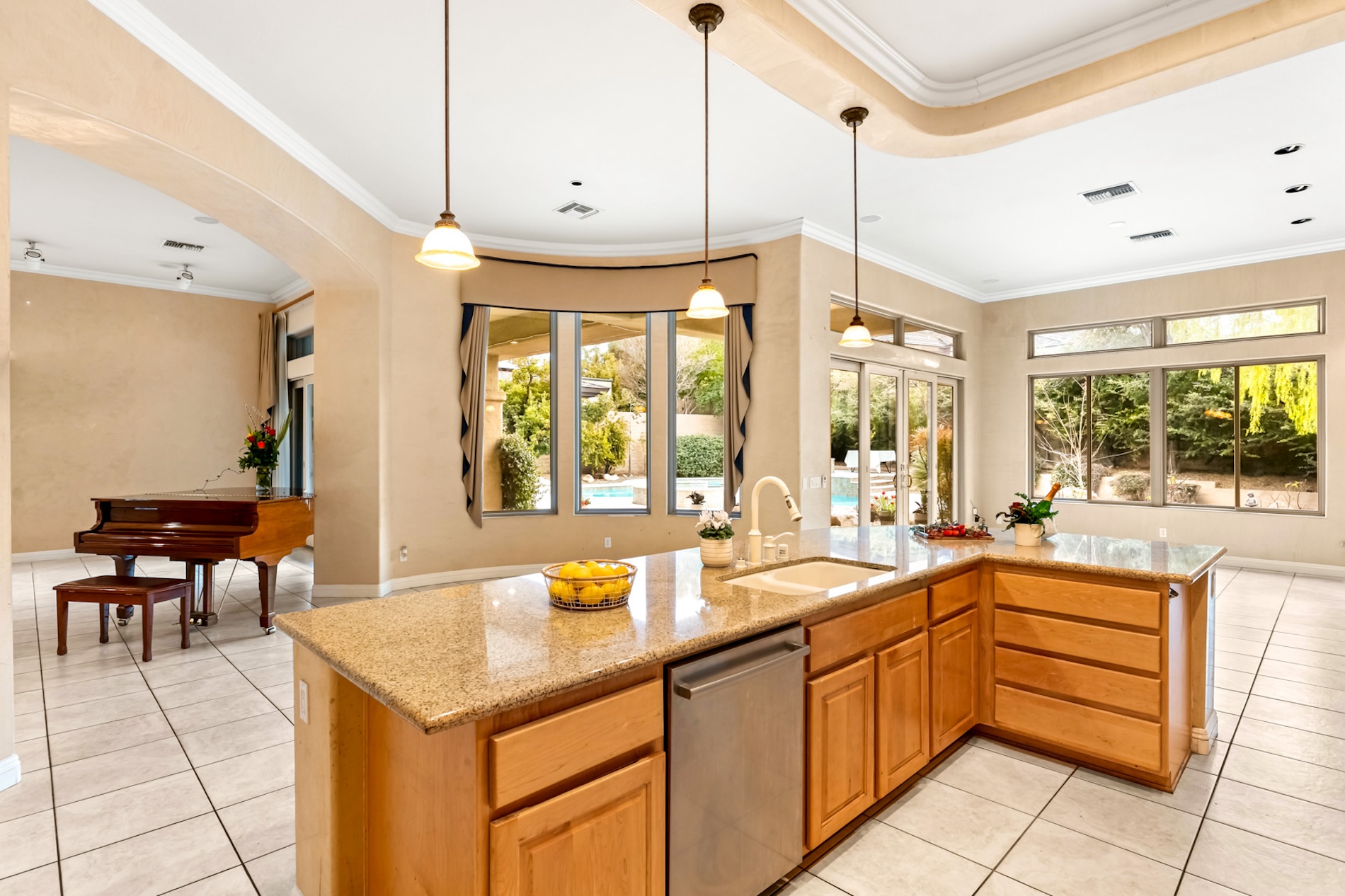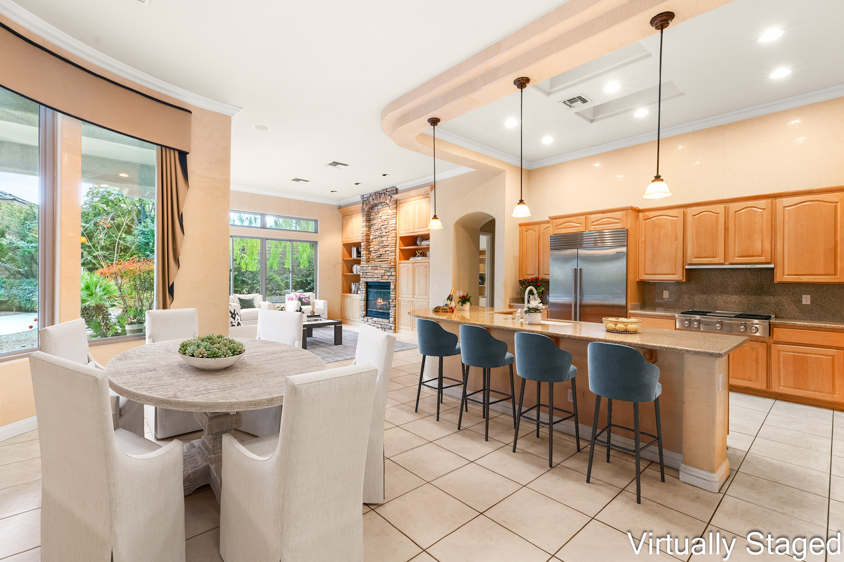 Skylights further brighten the living areas, creating an inviting atmosphere throughout. The heart of this home is the awesome cook's kitchen, complete with a convenient island breakfast bar, a large pantry, pendant lights, and an inviting casual eat-in area. There is a formal dining room for large parties or family dinners. The family room is adorned with a stone-enhanced fireplace and a built-in entertainment cabinet, creating a cozy atmosphere.