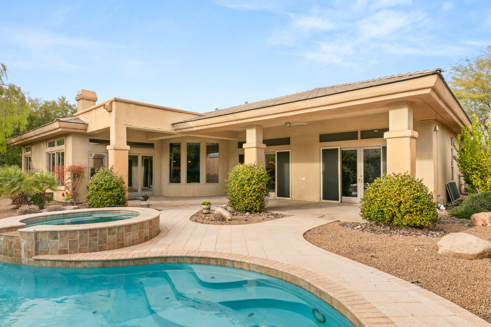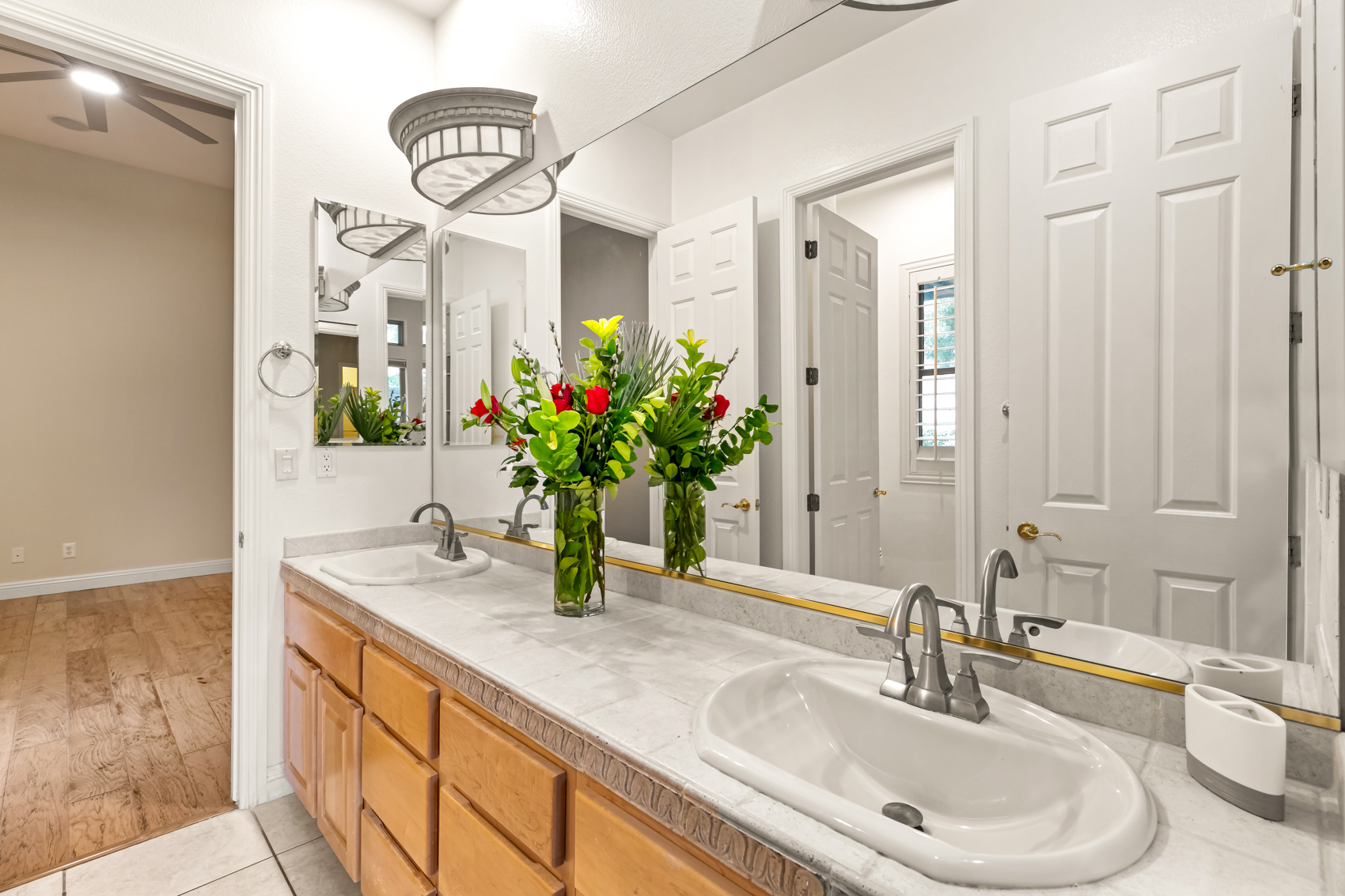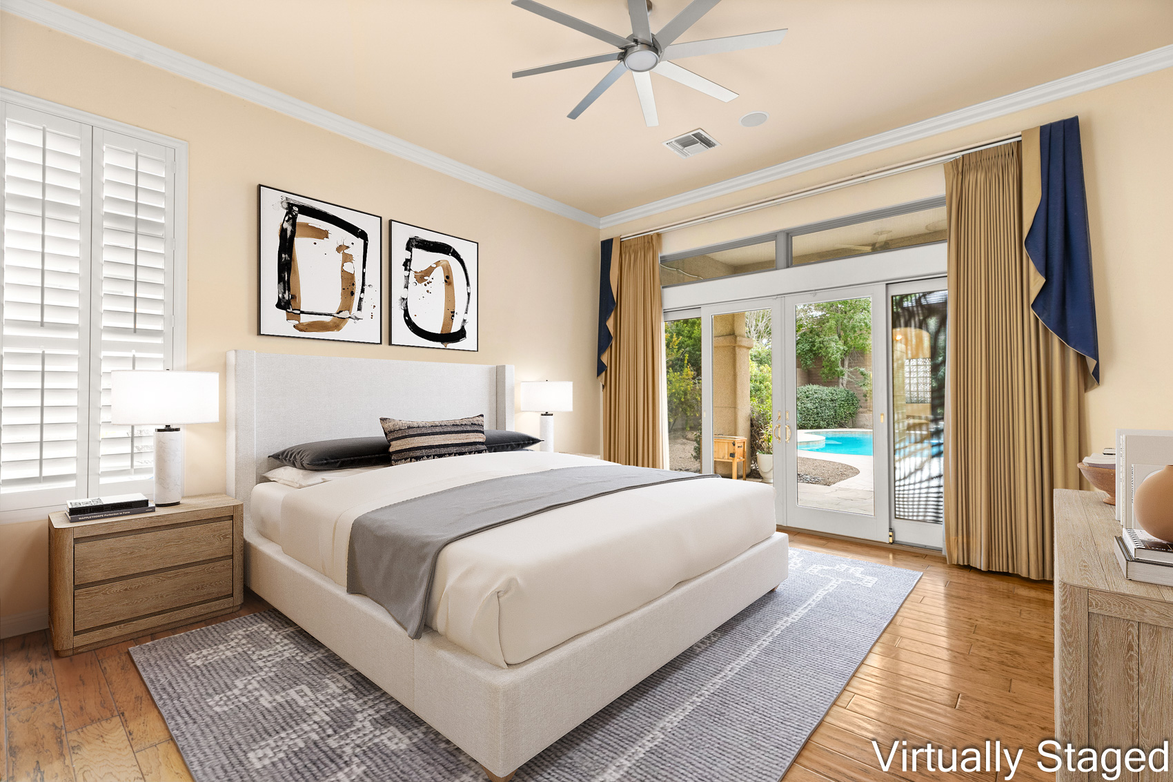 The primary suite, located on the opposite side of the home for privacy, welcomes you with a vestibule double door entry. The spa-like bathroom offers a large shower, a deep soaking tub, a separate vanity, and large customized walk-in closets. Additional features include oversized secondary bedrooms downstairs with a shared Jack and Jill bath and real hardwood floors in every bedroom, including the large detached casita with a full bath, bedroom, and walk-in closet. Spacious laundry room with plenty of counter space and sink. Backyard paradise with extended covered patio for year-round enjoyment around the large sparkling pool spa and outdoor BBQ Don't miss the chance to make this home a dream of yours!
