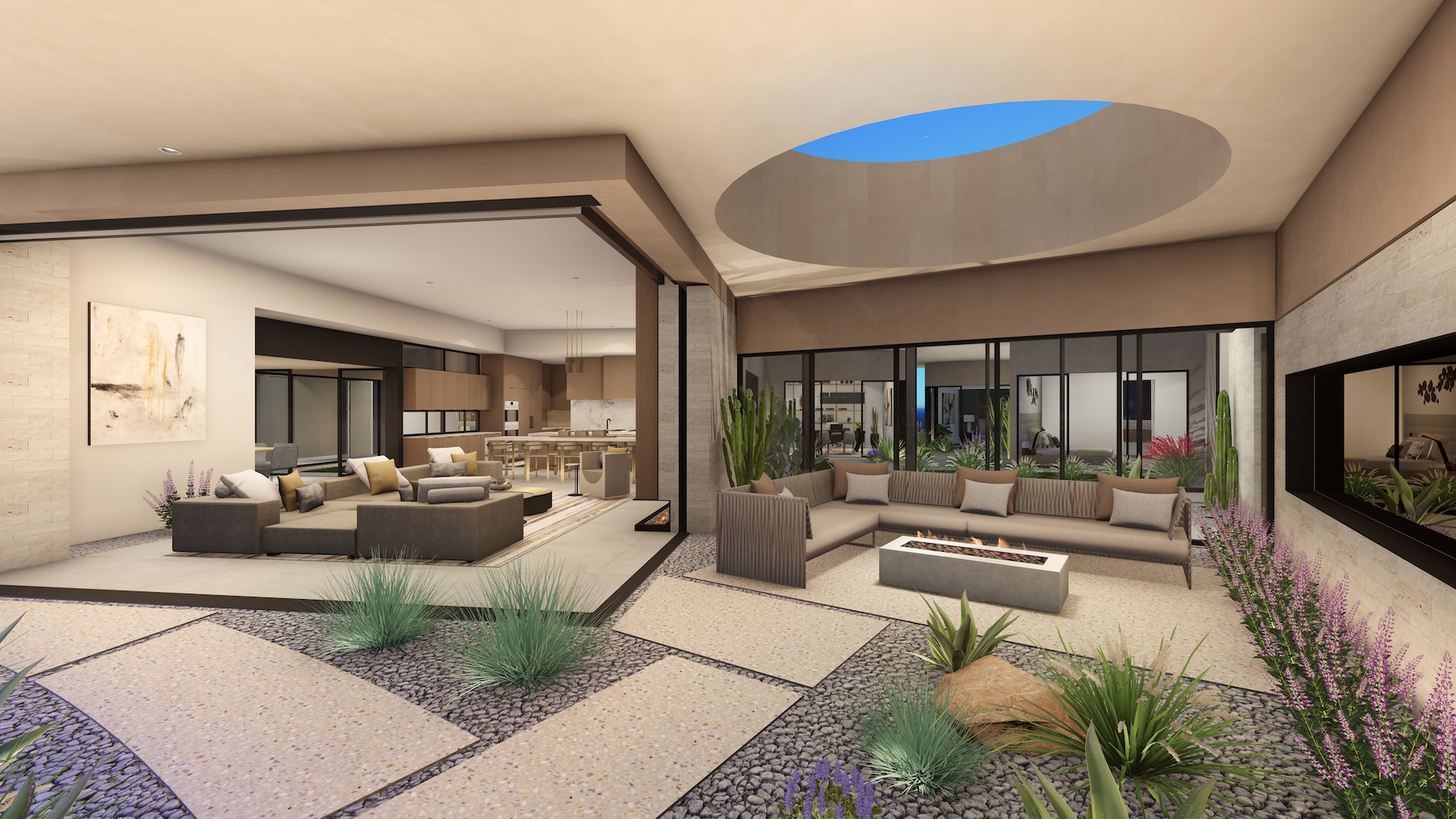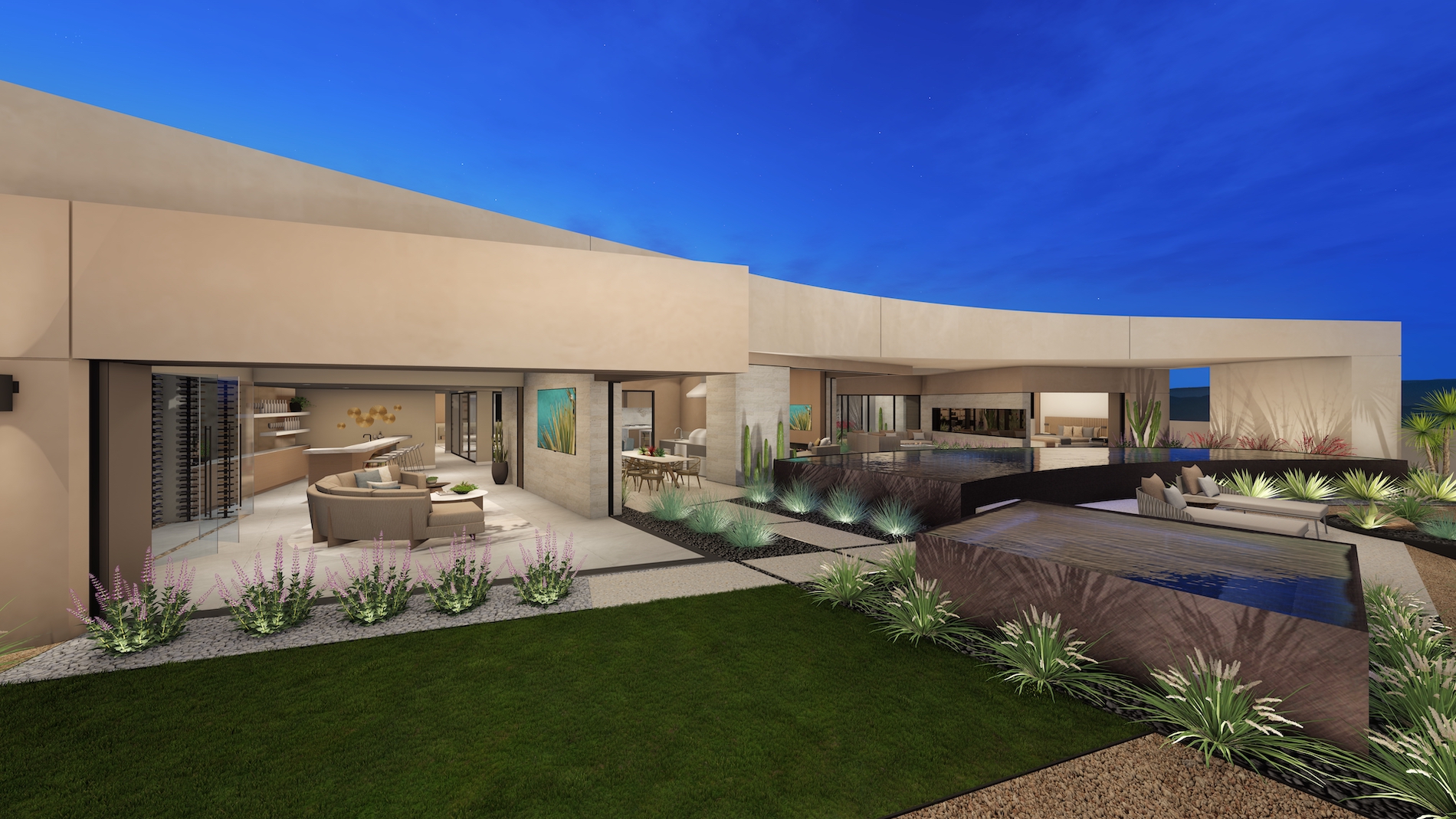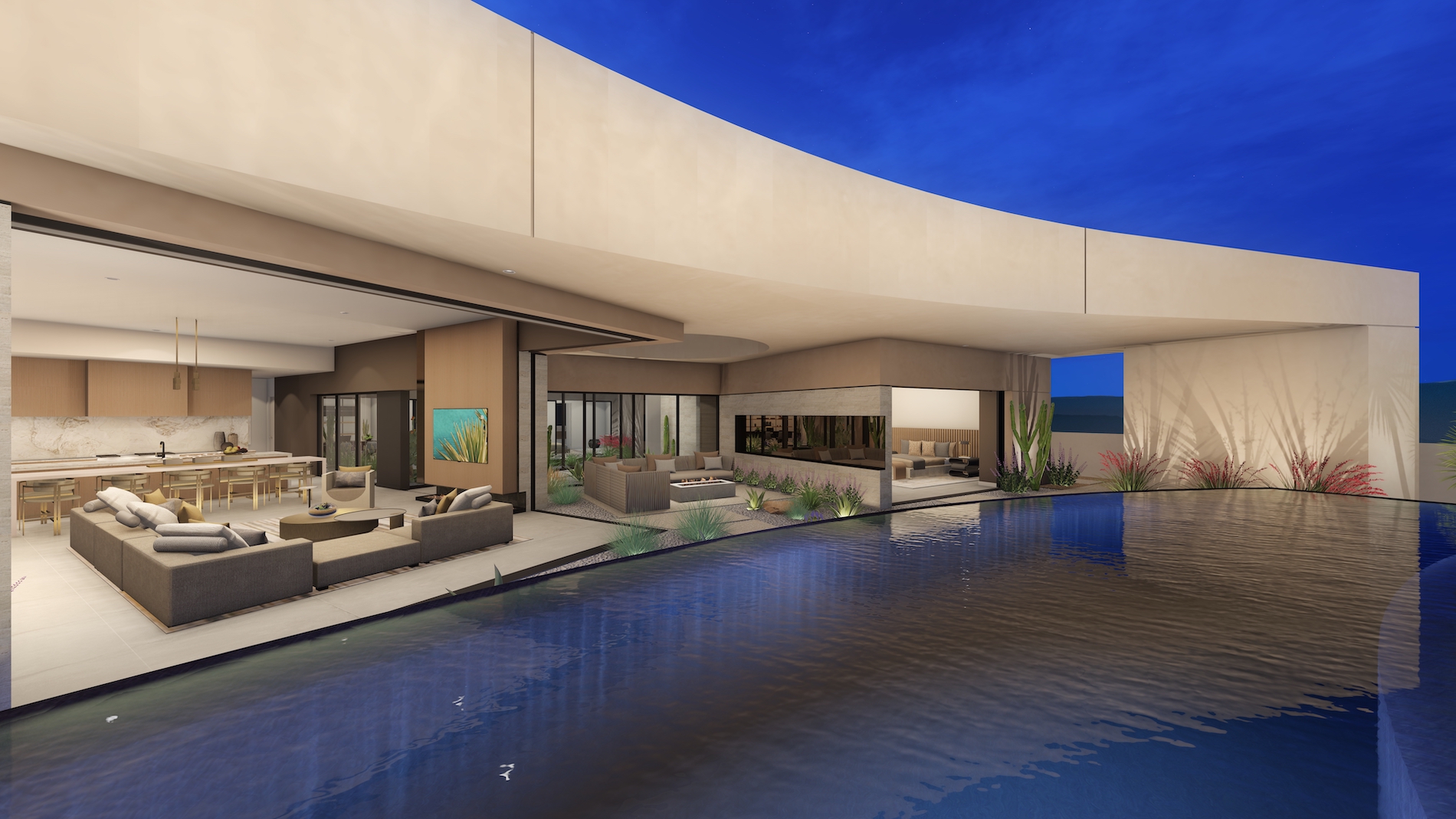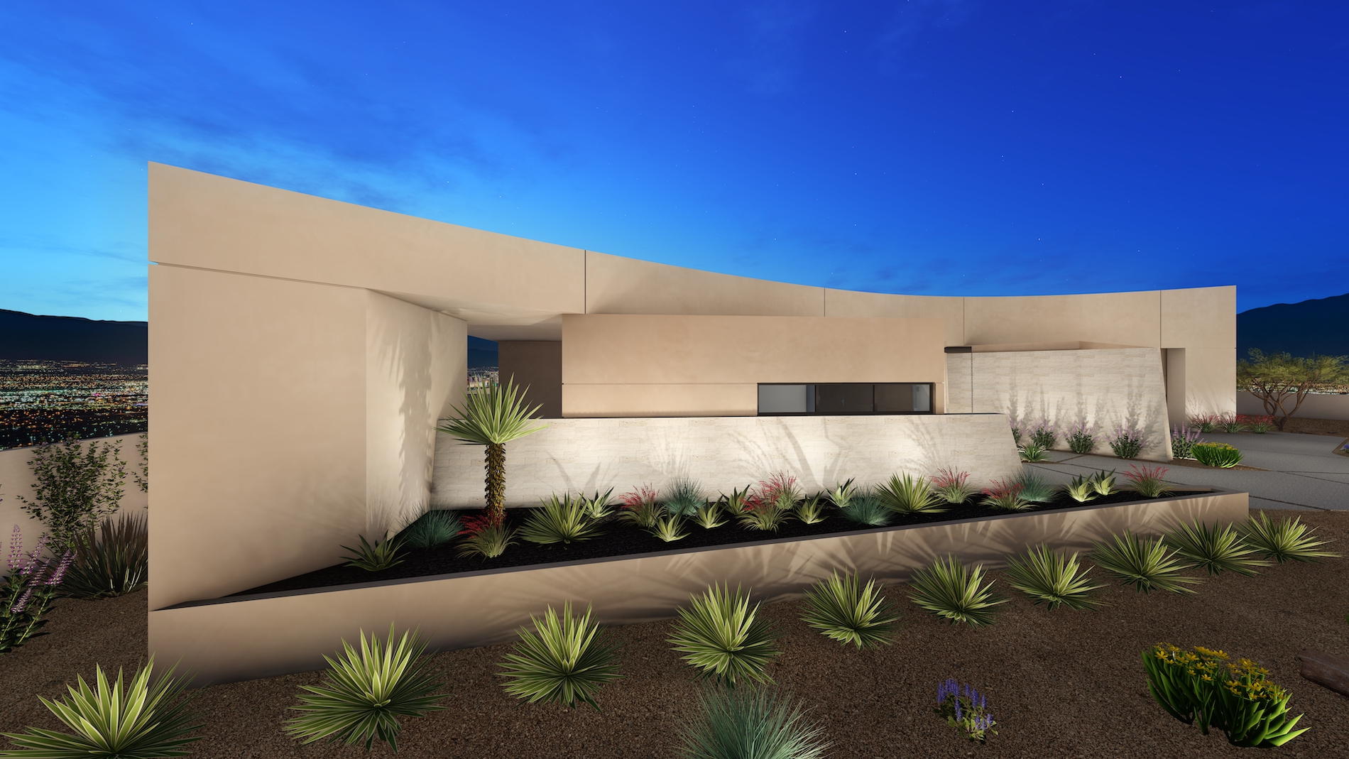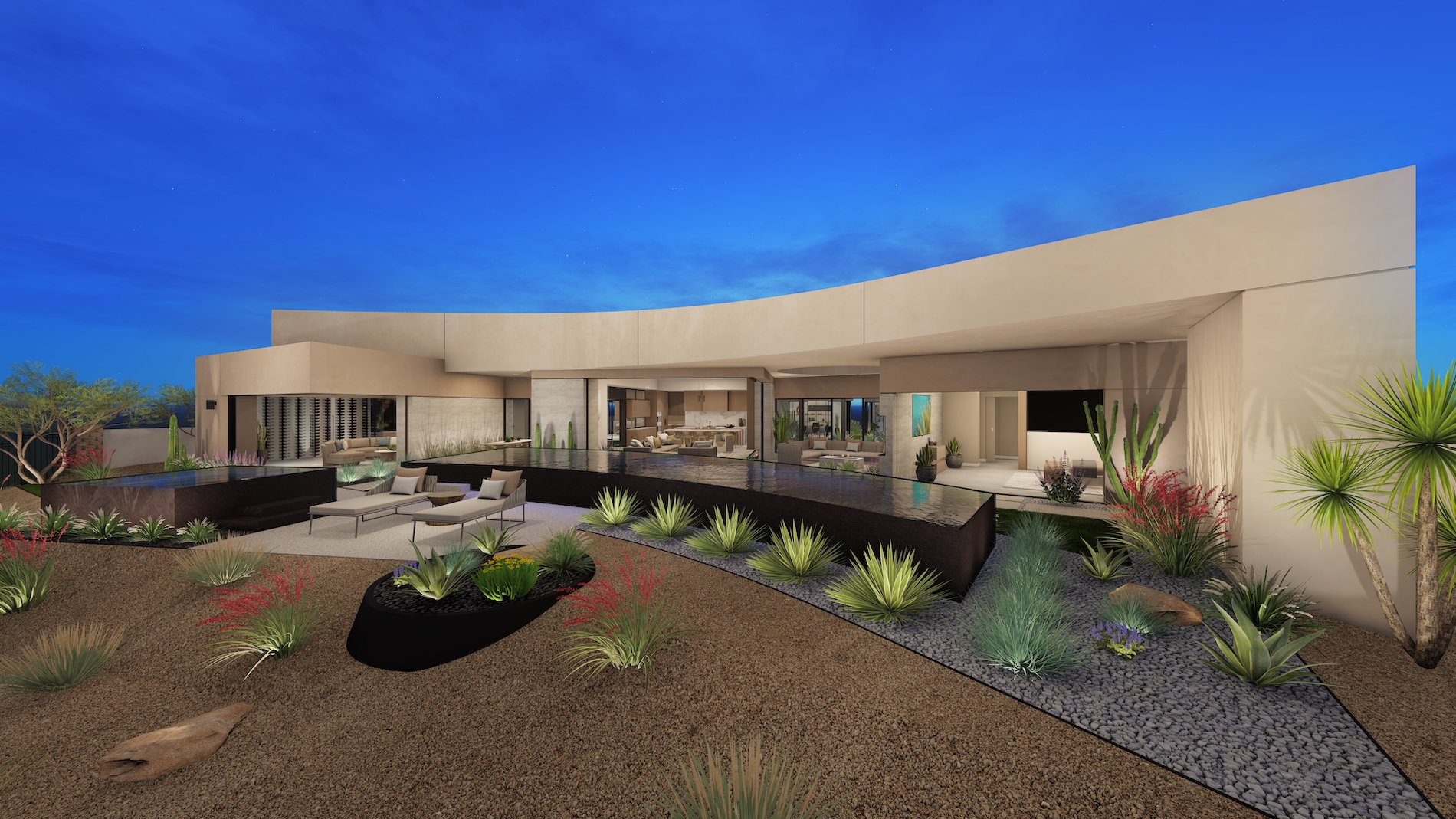 Meet Ellipse, a custom ready-to-build Home by Blue Heron Elite in Ascaya. This linear contemporary desert Home showcases the beauty of natural stone, creating a striking contrast against the vibrant desert landscaping surrounding it. A marvel in modern desert architecture, Ellipse is named for its swooping curvature, circular skylights, and internal courtyard activated by a portal of light.