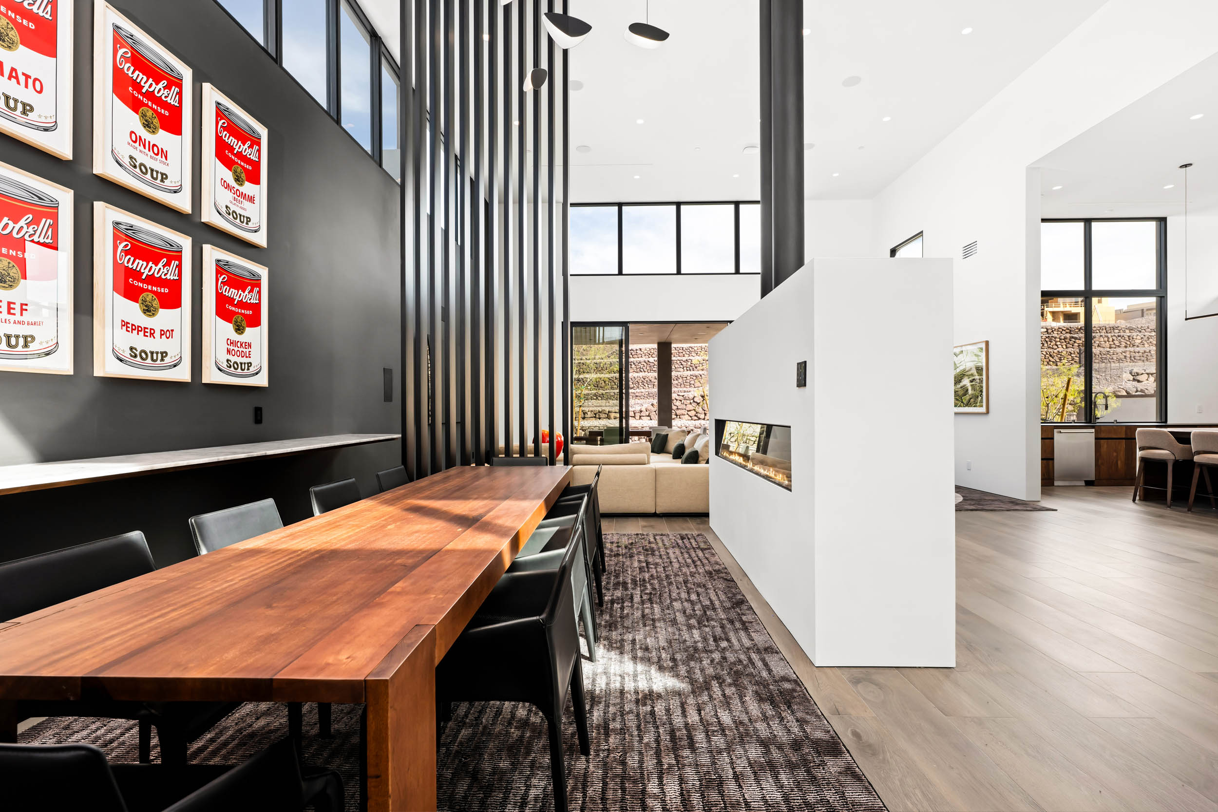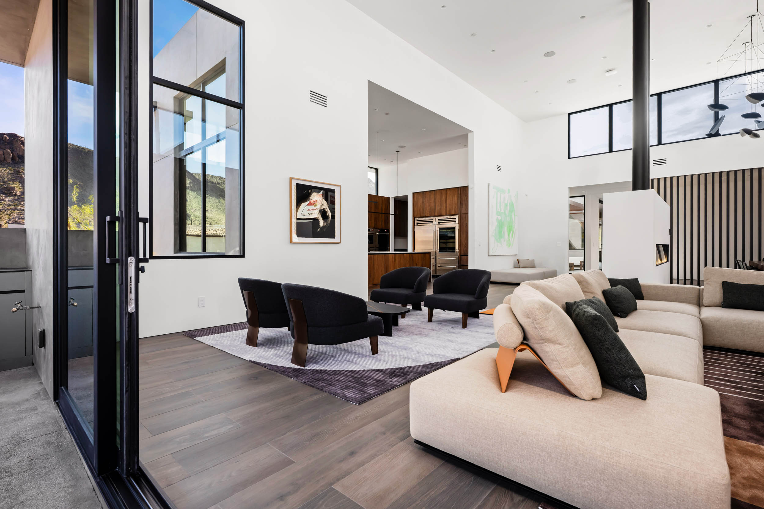 Refined detailing defines the interiors. Trimless doors, flush vents, linear air diffusers,mudded lighting, and Level 5 wall finishes create uninterrupted surfaces throughout. Solid walnut cabinetry and solid-core doors add warmth to the minimalist palette, while seamless zero-threshold tile continues throughout the home and bathrooms for a perfectly flush architectural finish. Motorized shades disappear into the ceiling line,maintaining the clean visual language of the design. The kitchen functions as both centerpiece and gathering space, anchored by an extended quartzite island and equipped with Sub-Zero and Wolf Professional appliances, including an additional induction cooktop. Adjacent, a fully appointed wet bar connects seamlessly for entertaining, complete with wine refrigeration, ice maker, and sink. A secondary kitchenette serving two guest suites provides Sub-Zero and Wolf appliances as well, reinforcing the home’s thoughtful functionality. The dining room is strategically placed within sculptural metal slats that define the space while maintaining openness, centered around a contemporary fireplace that enhances the intimate setting. Custom fabricated furniture and curated art pieces were designed specifically for the home, further reinforcing its identity as a livable work of architecture. The primary suite is expansive and serene, offering a private lounge area and fireplace, creating a retreat within the home. All bedrooms are en suite, each thoughtfully designed with 10-foot ceilings and refined finishes. Practical considerations were equally prioritized, including waterproof bases beneath every sink, silent whisper bathroom fans, integrated cabinet shelving systems, and carefully concealed construction details such as the absence of cabinet top fillers for perfectly aligned ceiling transitions. Outdoor spaces continue the architectural narrative. A tranquil Zen garden provides a moment of calm near the interior corridors, while the rear grounds unfold as a resort-style retreat. The pool and spa feature elegant water elements, complemented by a fire pit, covered patio lounge areas, and an outdoor kitchen equipped with grill, refrigerator,sink, and weather-resistant audio. Technology and comfort are seamlessly integrated through a Savant home automation system controlling lighting, climate, and shading throughout the residence. The four-car garage is insulated and climate-controlled with its own dedicated HVAC system and connects to a private motor court for additional parking and arrival space. Positioned conveniently across from Ascaya’s family park, the home offers immediate access to one of the community’s most desirable outdoor spaces. With 5,601 square feet of single-level living, four bedrooms, and five baths, this residence represents a rare opportunity to acquire a thoughtfully designed architectural home where minimalism, light, materials, and precision converge. Every detail reflects an uncompromising commitment to design integrity, creating a residence that feels both timeless and quietly extraordinary.