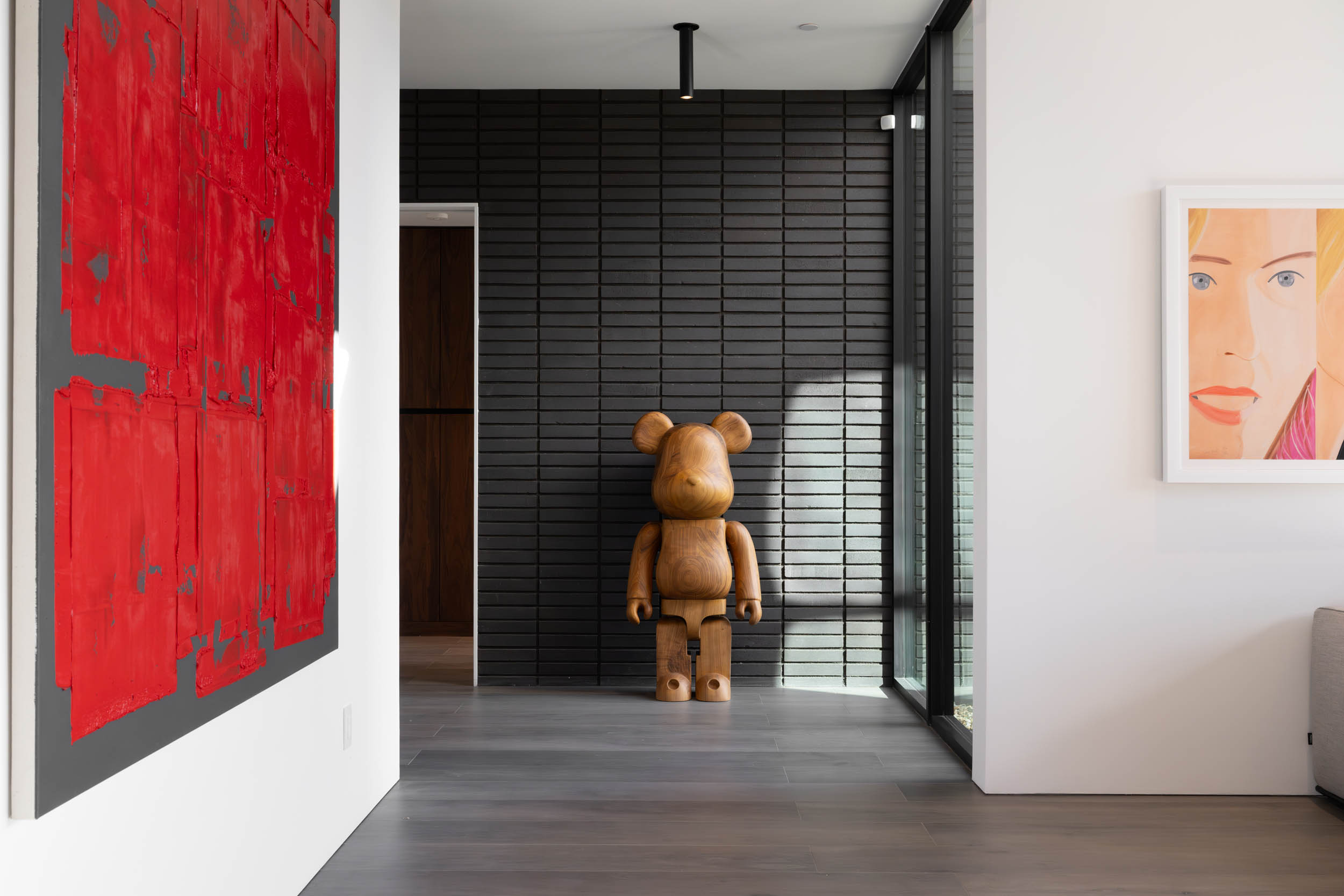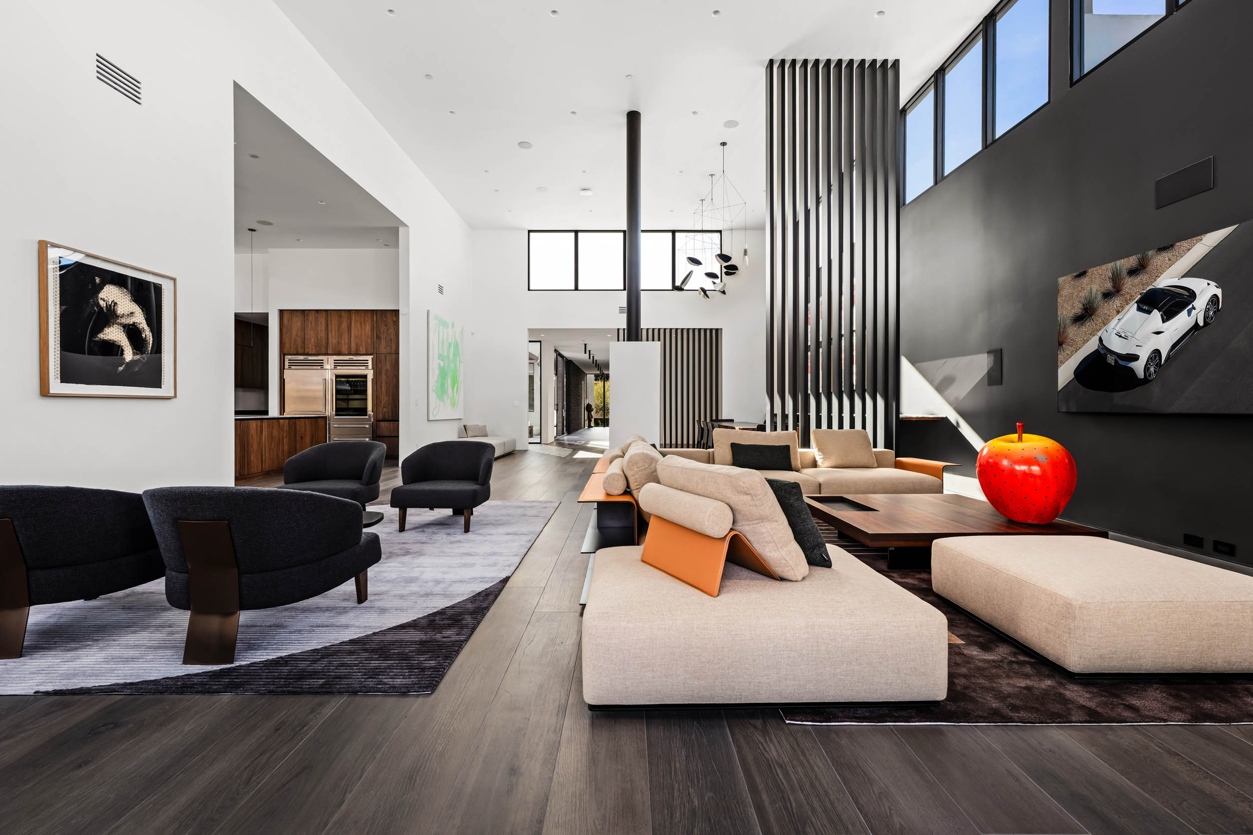 Inside, the architecture unfolds through long, wide hallways designed for art display and visual continuity. An 18-foot ceiling crowns the great room, while 14-foot ceilings in the kitchen and den and 10-foot ceilings throughout the bedroom wings create a natural hierarchy of space. Floor-to-ceiling glass aligns perfectly with the ceiling plane, dissolving the boundary between interior and exterior while filling the home with natural light.