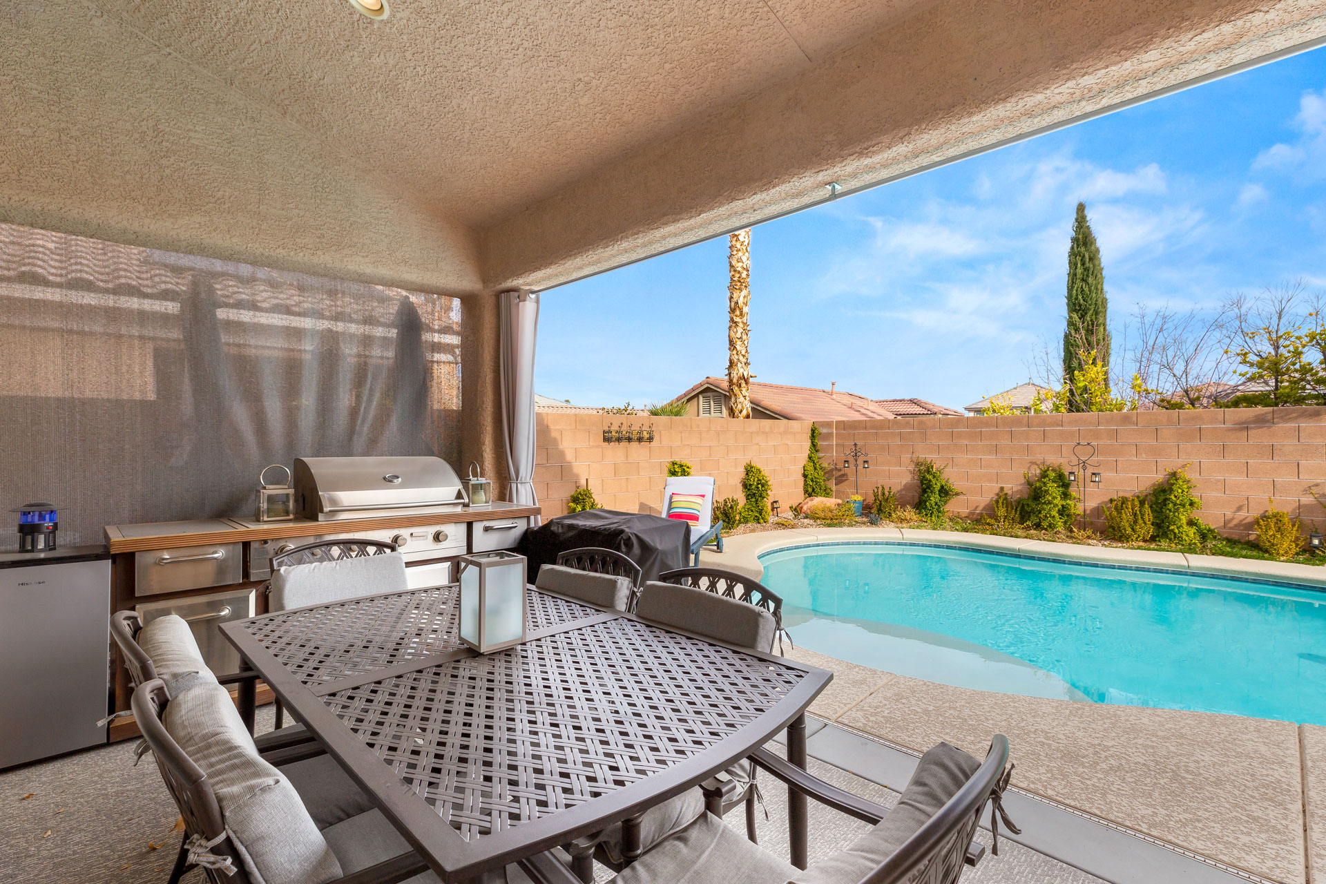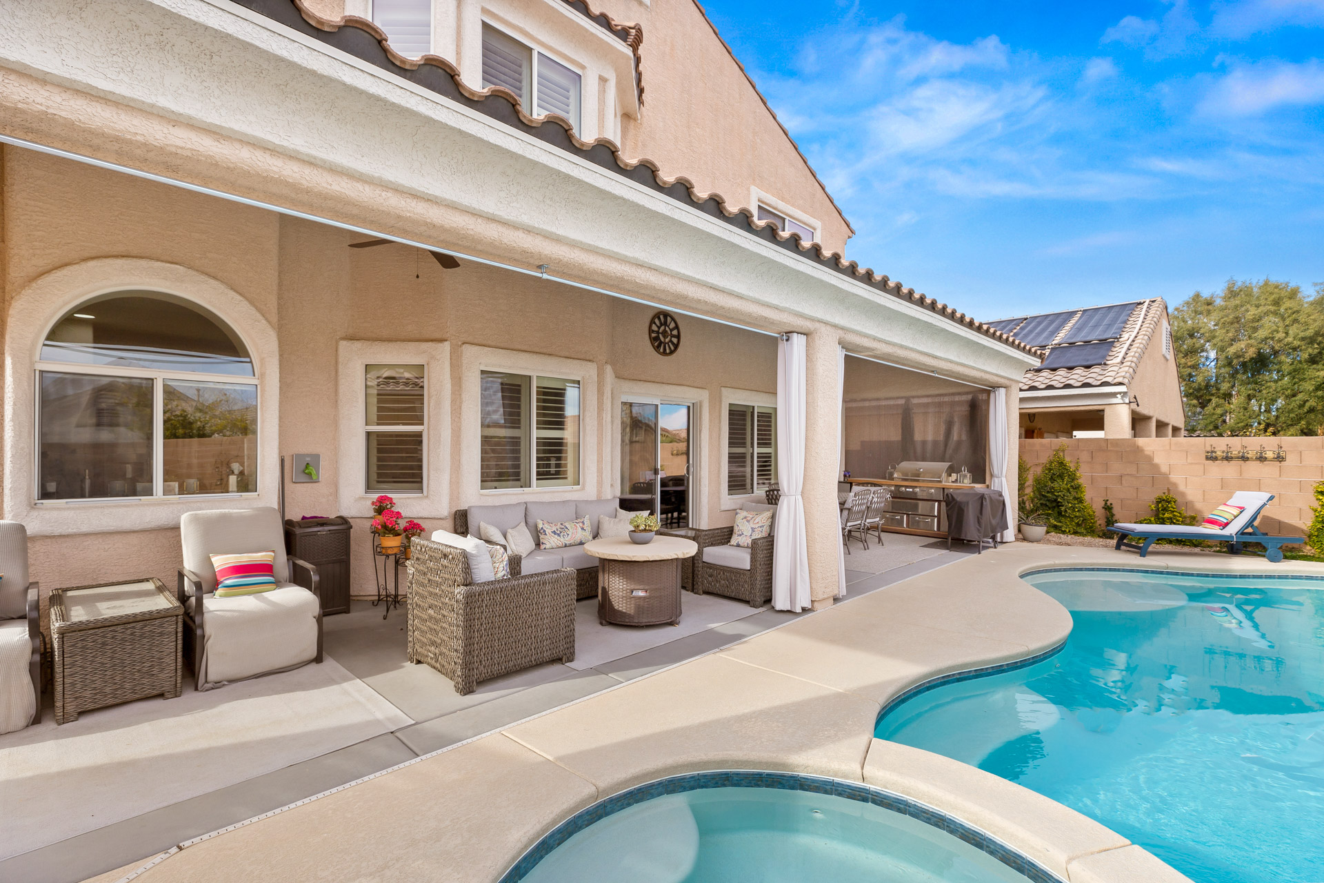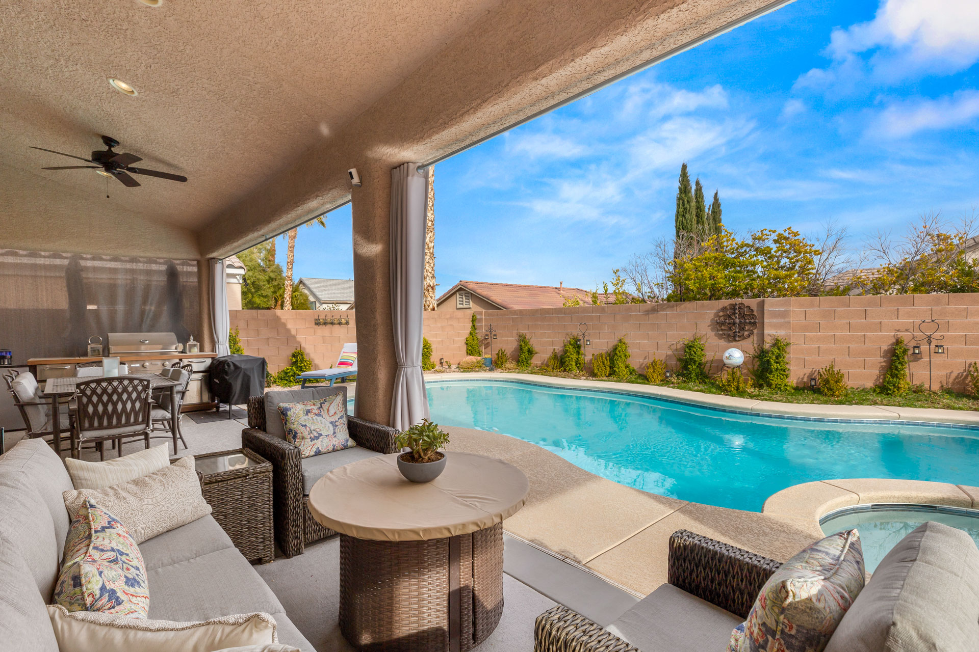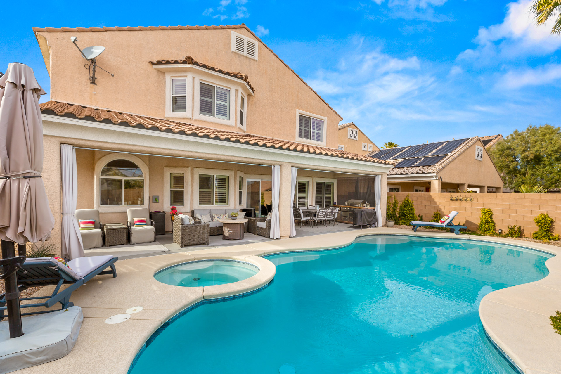 This beautifully updated home is situated in the gated Casa Rosa community with a pool and spa. Entertain with ease in this magnificent Summerlin home. Enter with grand high ceilings and a custom bar to entertain with ease! This is one-of-a-kind!