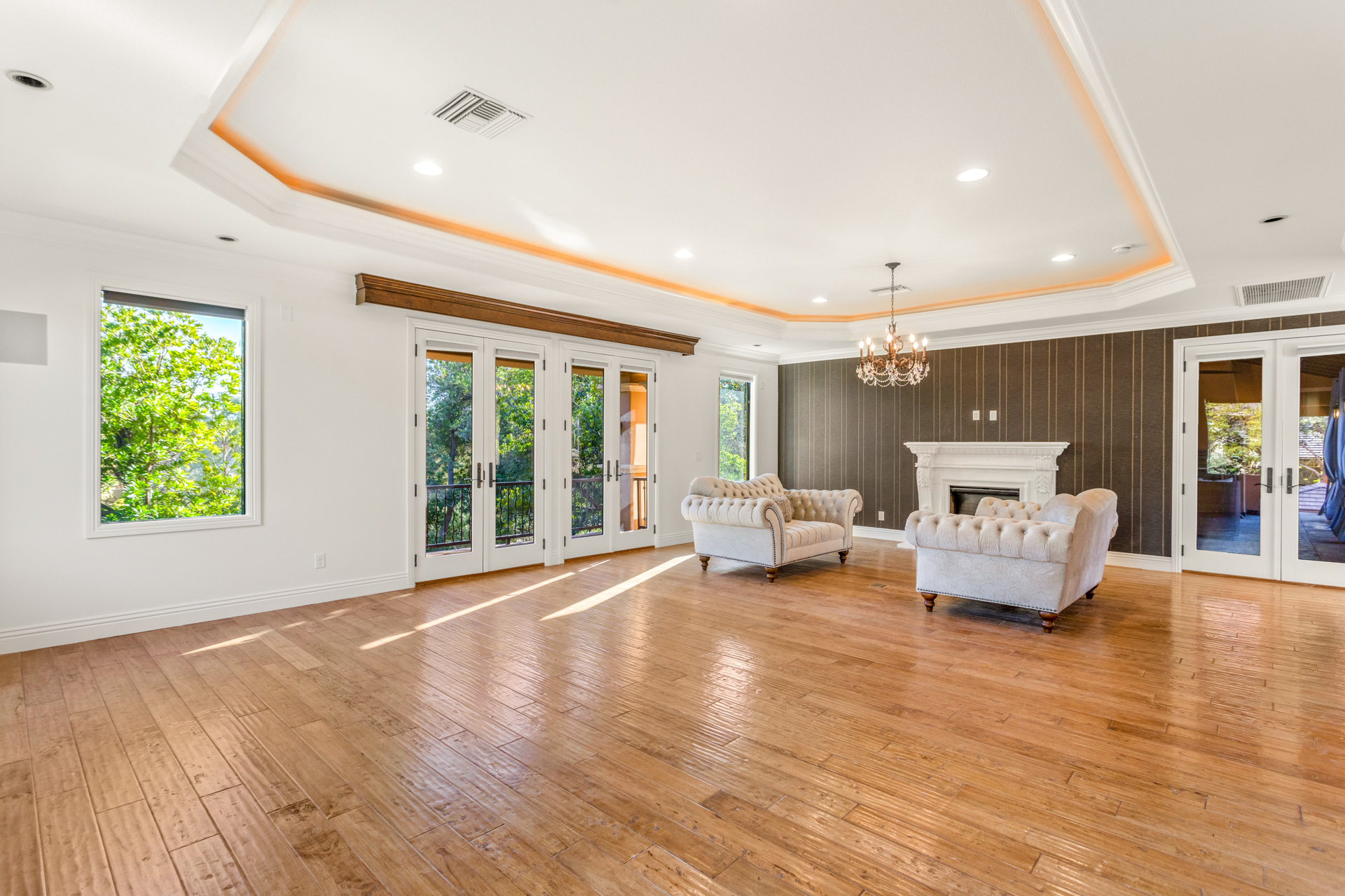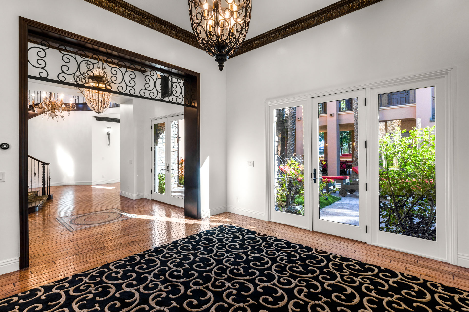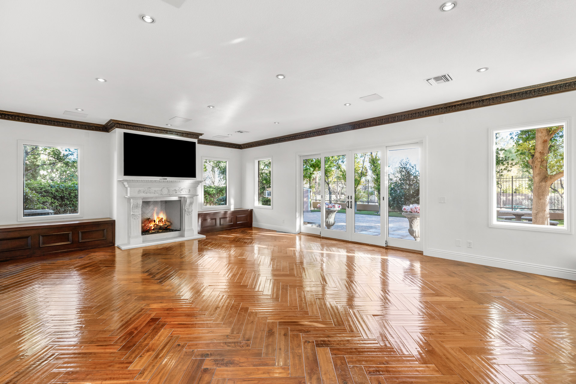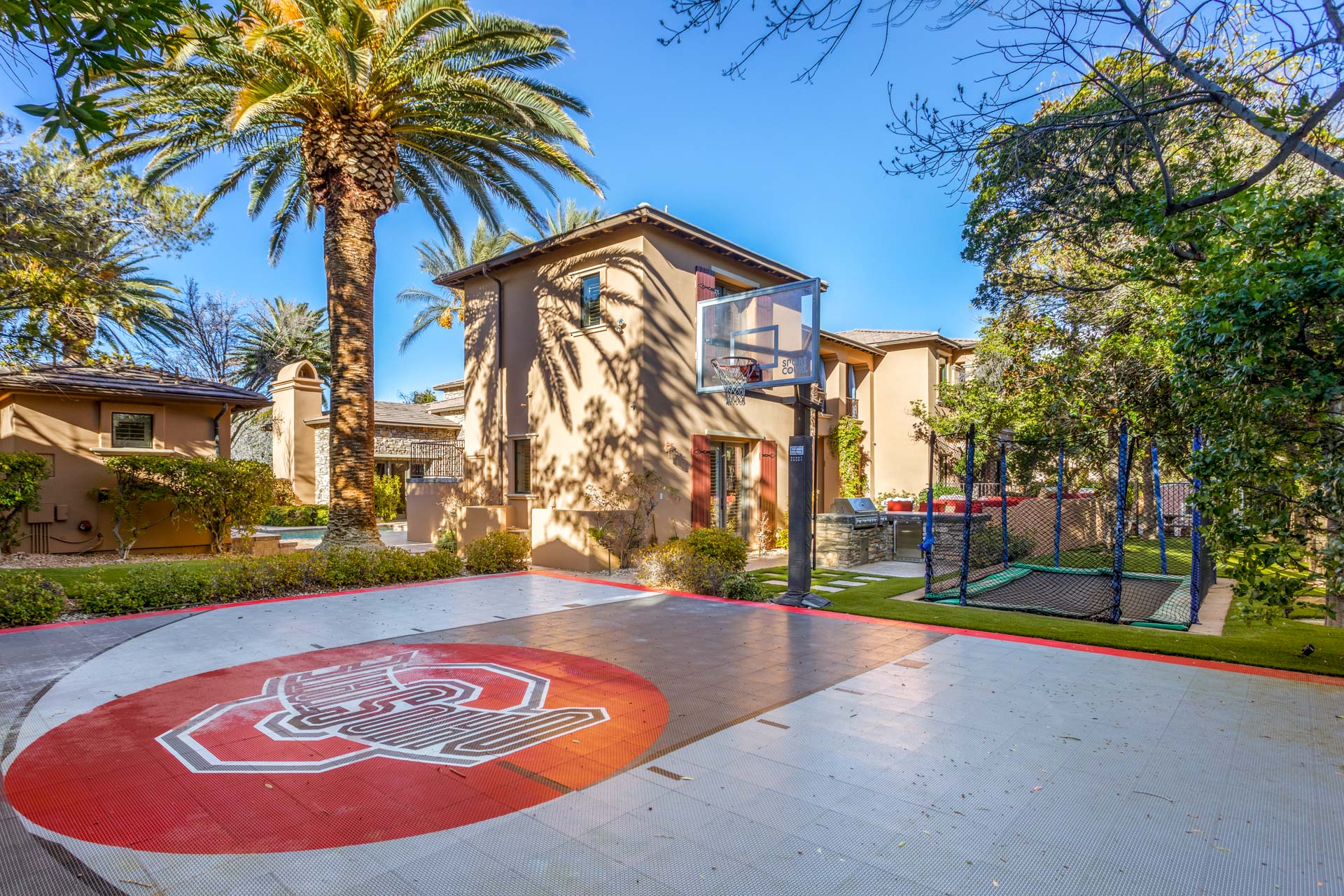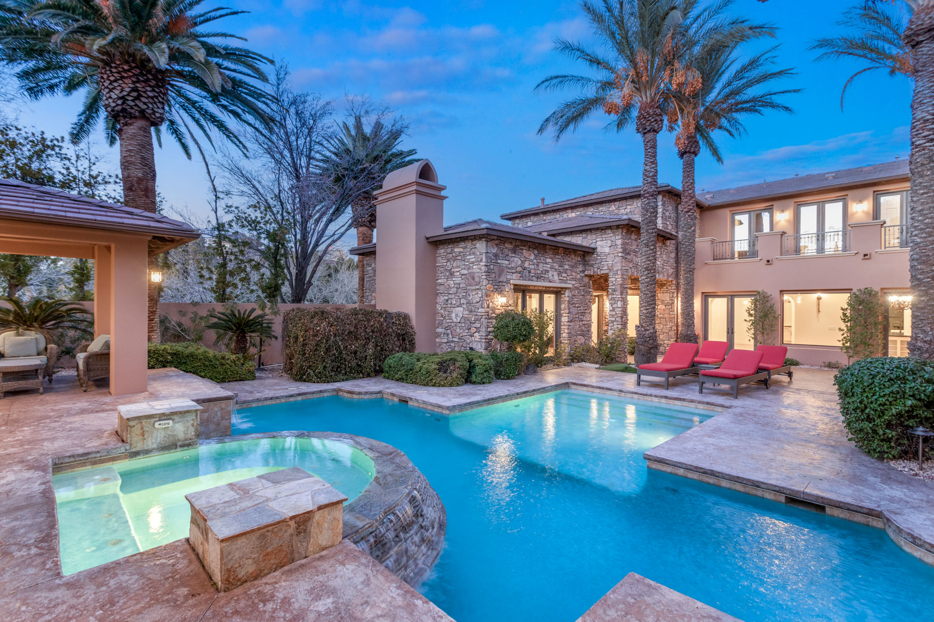 French doors positioned all around creates an openness and provides light that dances around the high ceilings of this grand home. Your gorgeous kitchen, with top-of-the-line appliances and an enormous island, is attached to a spacious living room and built- bar area. A majestic, curved staircase carries you upstairs. The oversized master suite walks out to large, covered veranda with fireplace, where you can lounge and take in the magical lights of the highly sought after Las Vegas Strip. Your backyard is paradise! With your tranquil, villa style pool and hot tub, custom built high-end outdoor kitchen grill, built in fire pit, sports area with an in the ground trampoline, basketball net, and multiple areas for relaxing.