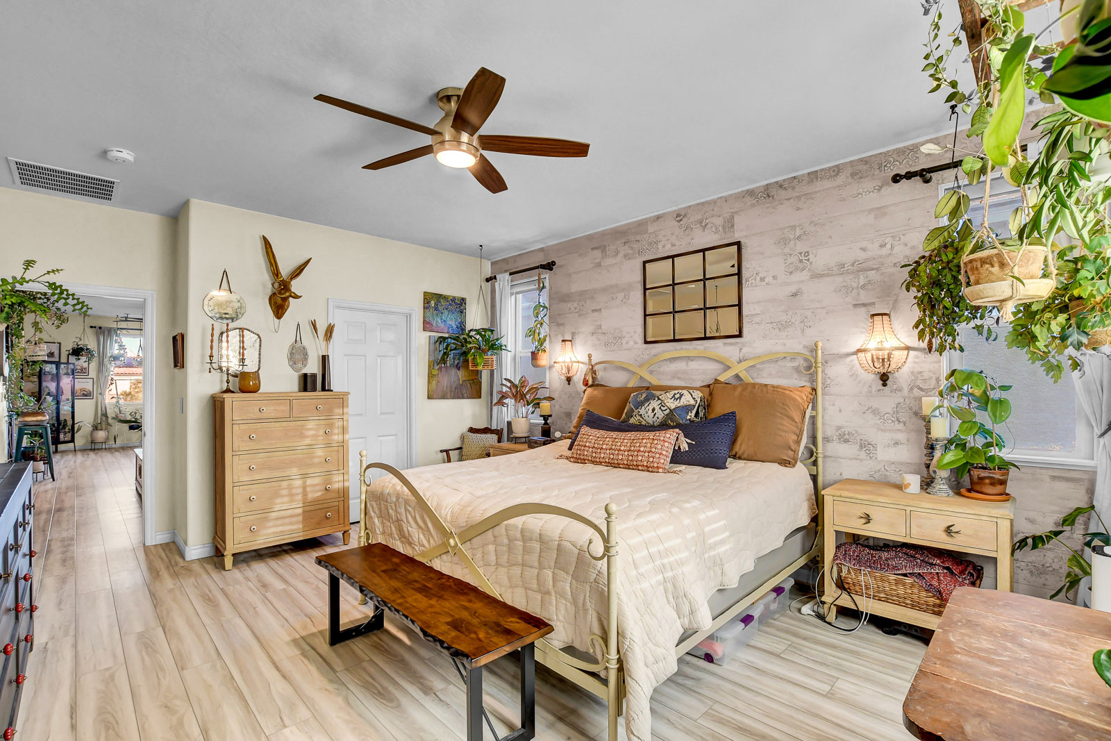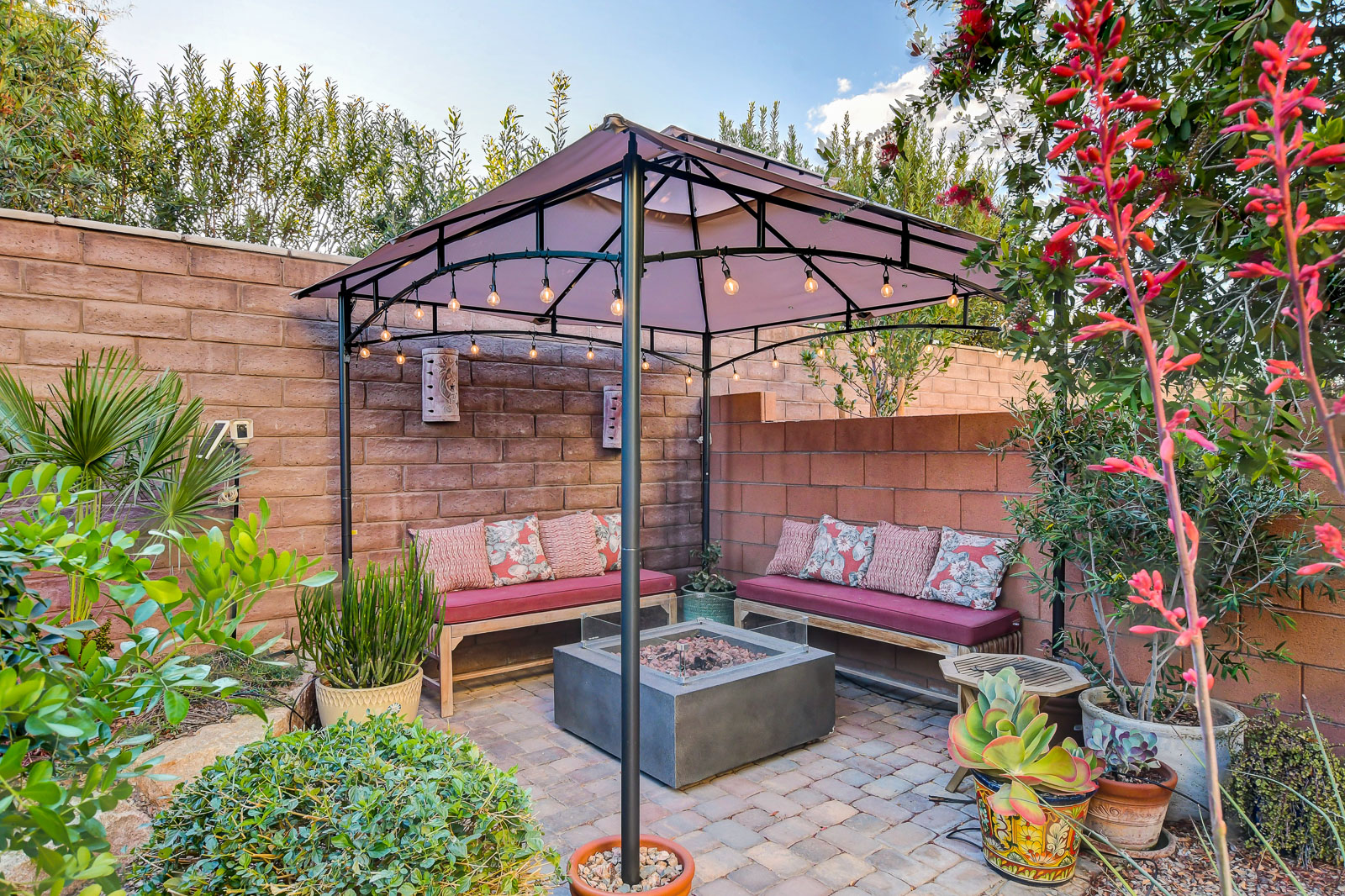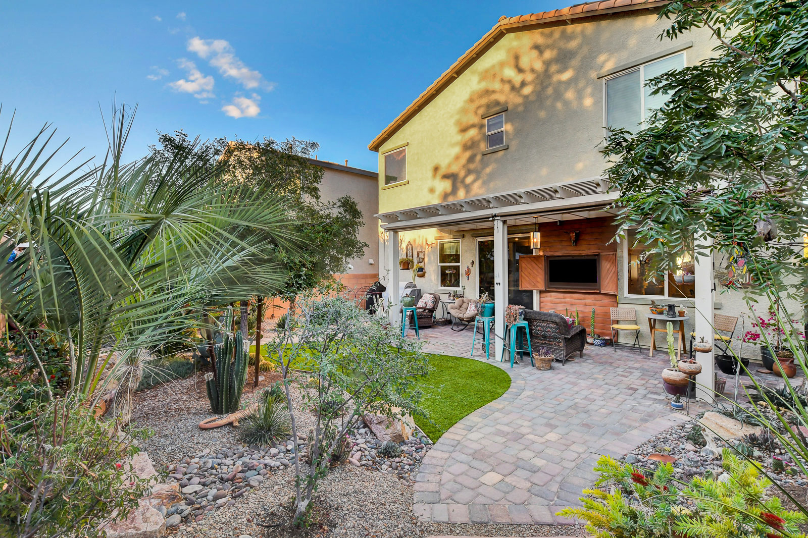 The kitchen features granite countertops, a massive pantry, GE Cafe Line appliances designed for everyday living and gathering. Upstairs, tiled bathrooms and a tiled laundry room with sink add function, while ceiling fans are found in every bedroom. The primary suite is a retreat, complete with designer tile, dual sinks, a soaking tub, wraparound mirror, a seated vanity, and a with two closets - a must see! Outdoors, pavers, turf, and custom mature landscaping throughout, with a covered, wall-mounted TV area for relaxed evenings under the Vegas sky w/no direct rear neighbors - privacy.