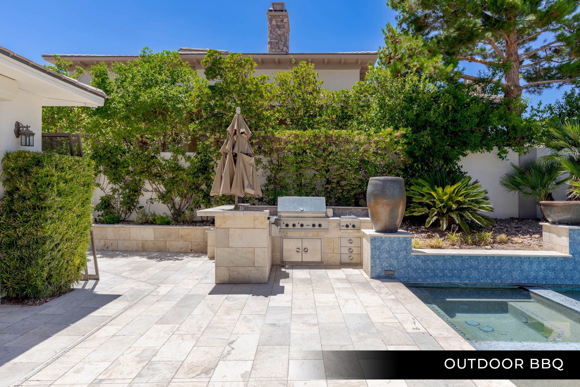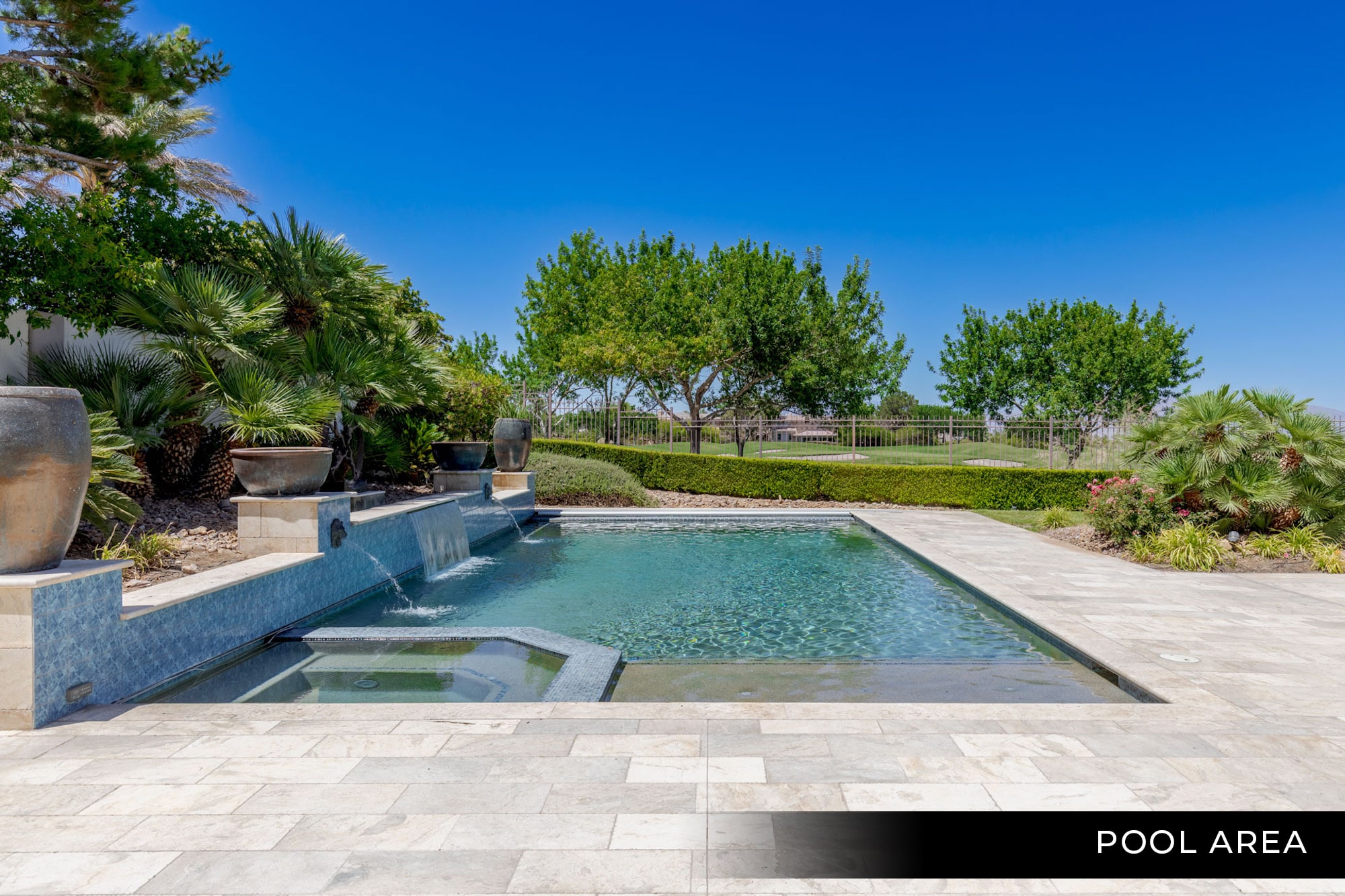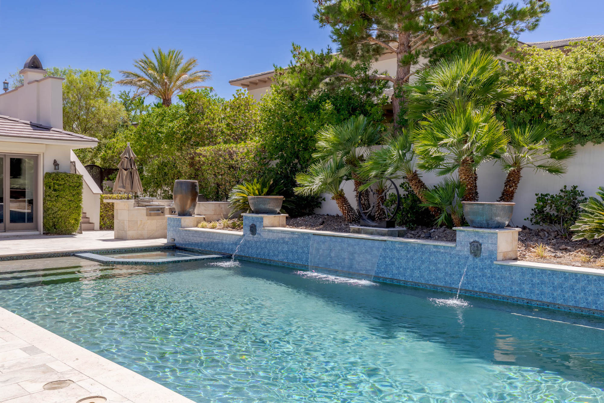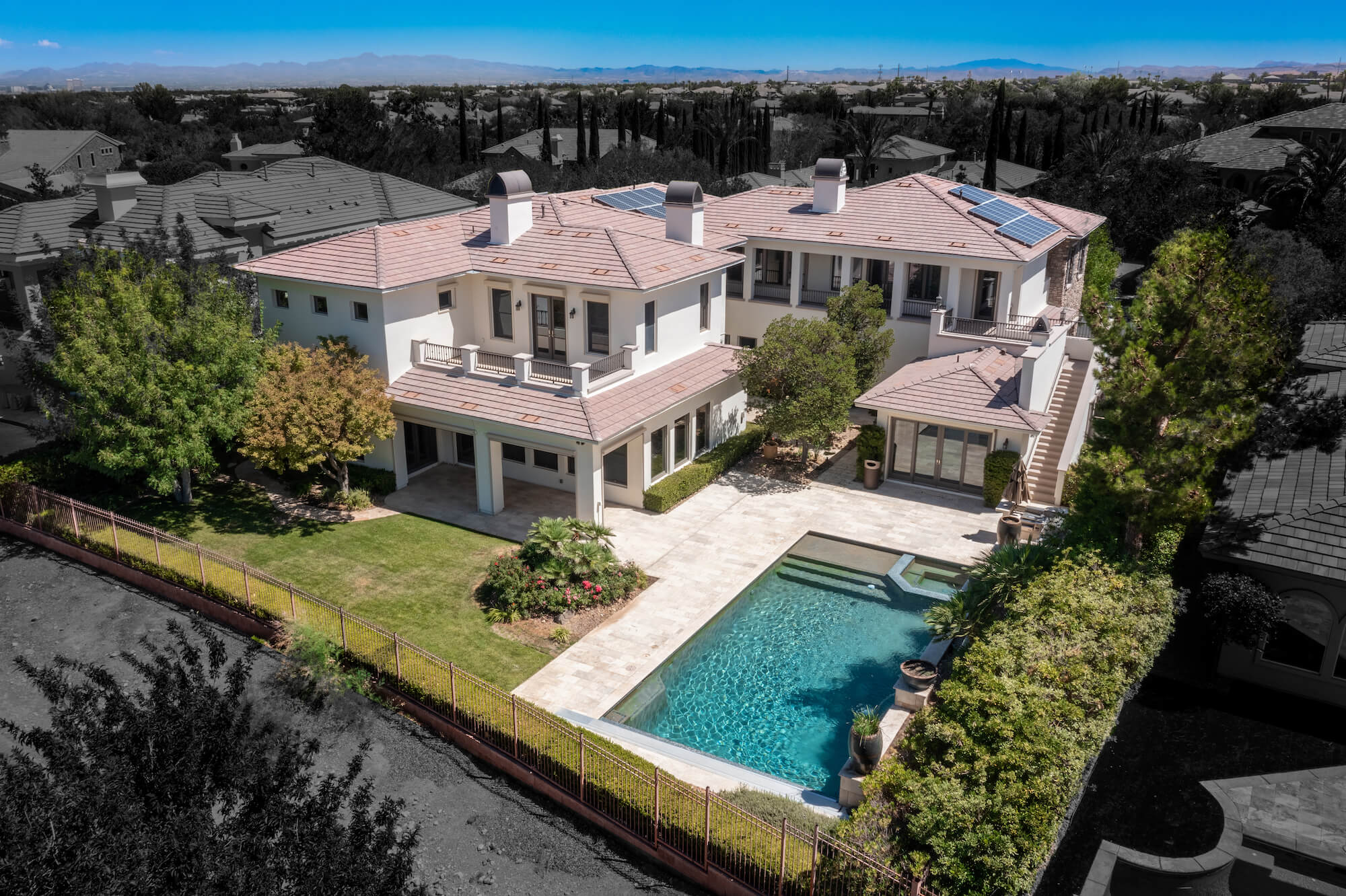 Located in the guard-gated Summerlin neighborhood of Bellacere, this recently refreshed home is over 8,200 square feet on the golf course with double fairway and 5 bedrooms (guest bedroom down), 7 bathrooms, an office (one with detailed wood walls/flooring and coffered ceiling), media room and detached casita.