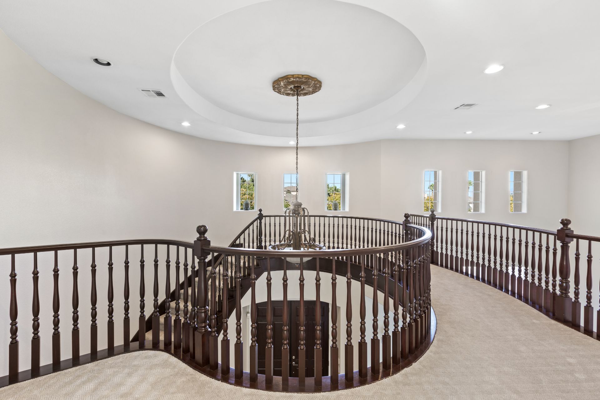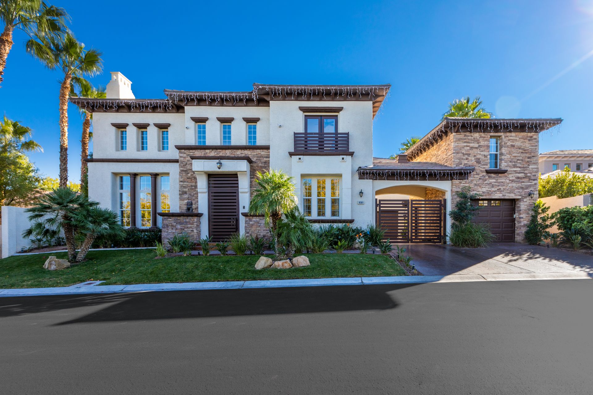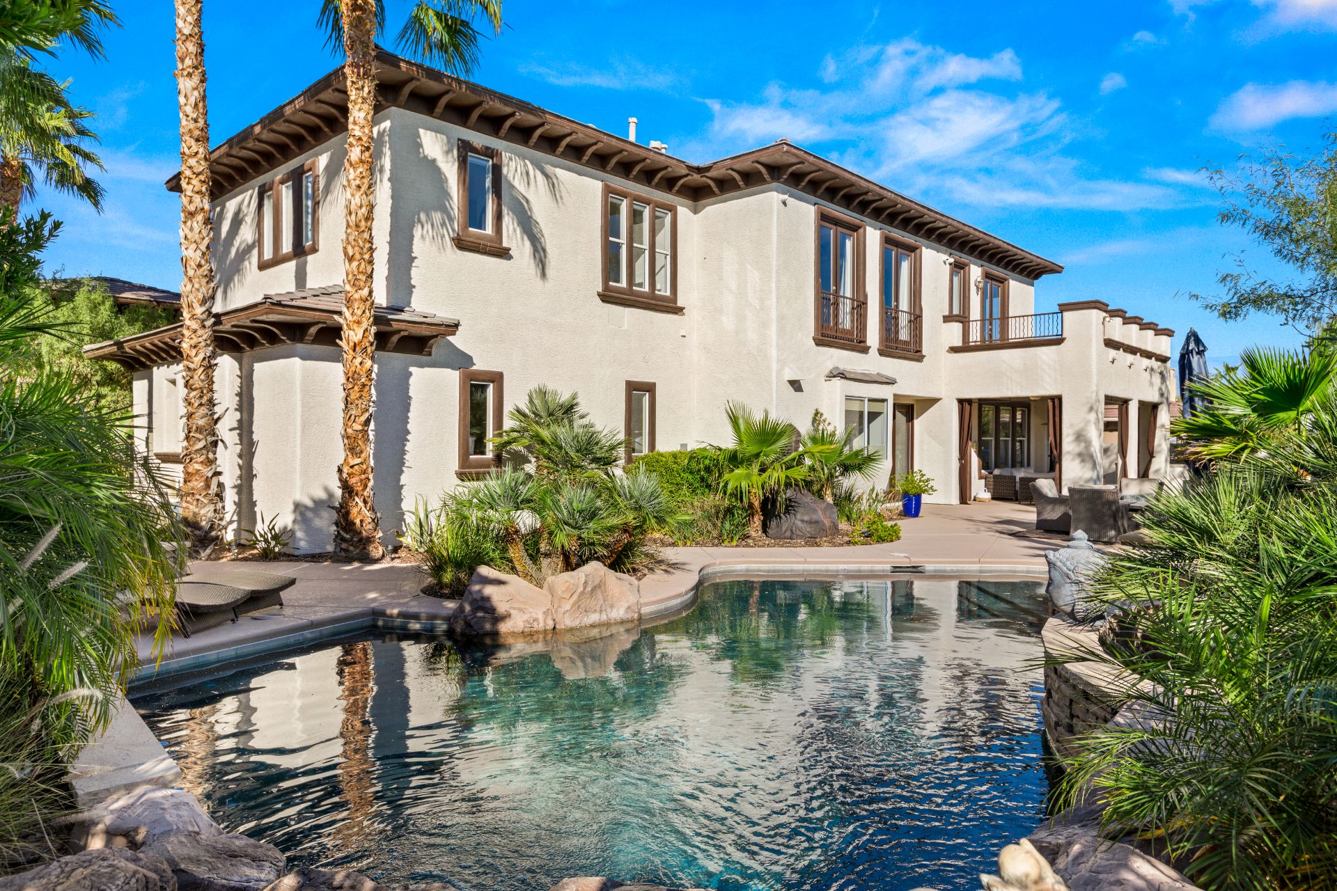 Situated on a premier Palisades lot backing up to TPC Vegas, this impressive residence has been extensively remodeled to provide the ultimate living experience. With over 6,000 square feet, this home groups all bedrooms on the second level for the ultimate in privacy and family togetherness. A premier Palisades home on TPC Vegas. The main floor contains expansive formal and informal spaces to showcase a personal art collection and cater to the needs and preferences of a busy, active family, with abundant space for entertaining. The kitchen is a vision in pale tones, with wood flooring, stainless steel appliances, granite slab countertops, white-painted cabinets, and a huge central island. It is truly the heart of the home and serves the adjacent dining area and family room with ease. It also provides easy access to the rear yard and outdoor patios. A gorgeous rock waterfall pool is the focal point of the rear yard, and there are views not only of the golf course but of distant mountains and The Strip. This home boasts a luxurious master suite with dual sets of French doors and Juliet balconies to capture cooling breezes, as well as a master bath with a new Lydia white marble tub and steam shower and quartz countertops, and two custom closets for all your grooming and clothing needs. A private casita occupies space above a single garage space, with access via a private outdoor staircase. The home features five bedrooms, five baths, three garage spaces, six fireplaces, a temperature-controlled wine storage room, a comfortable bar with pull-up stool seating, and multiple enclosed patios.