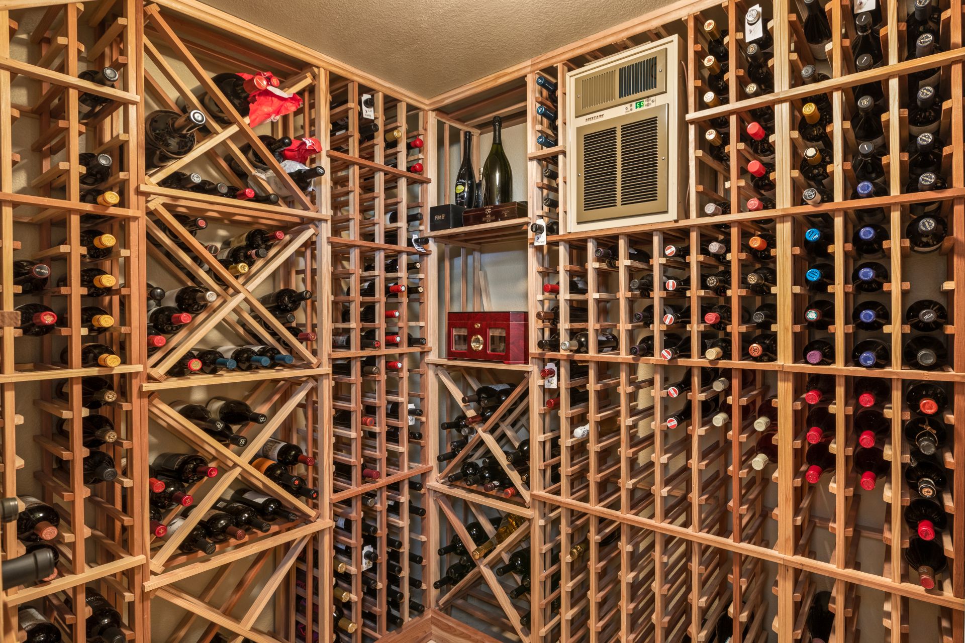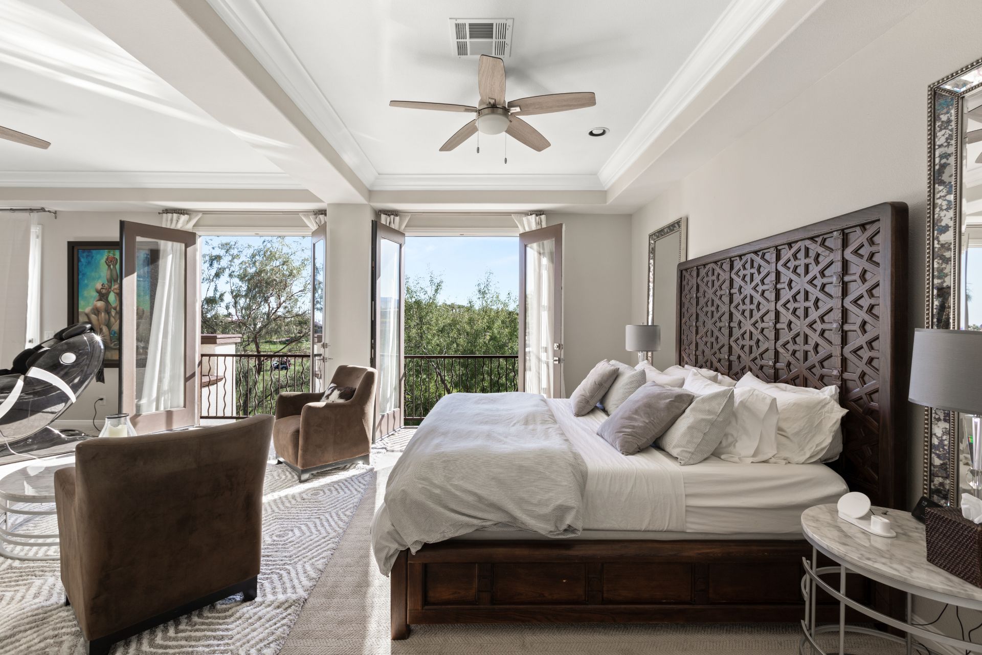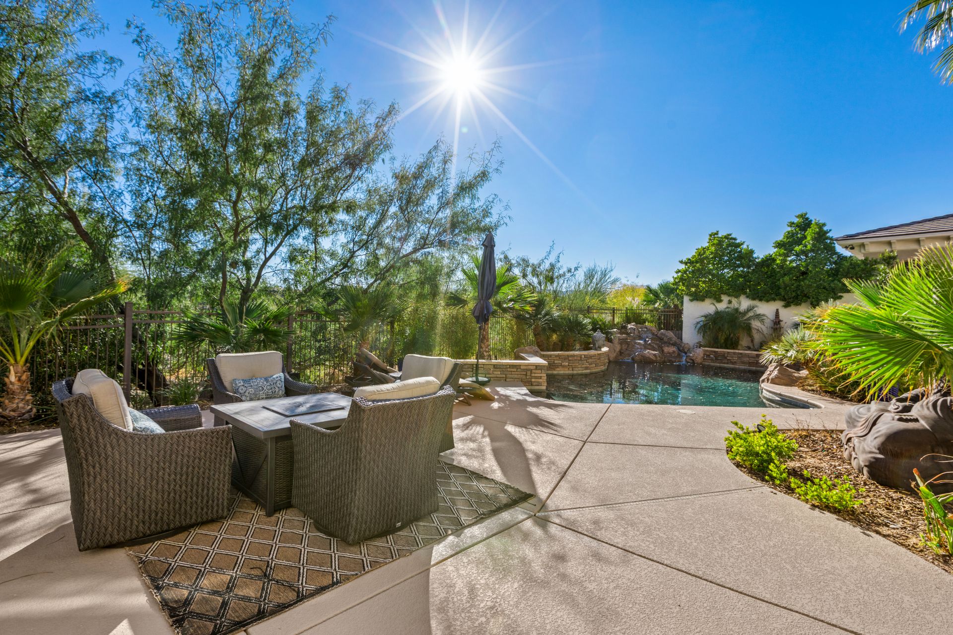 A gorgeous rock waterfall pool is the focal point of the rear yard, and there are views not only of the golf course but of distant mountains and The Strip. This home boasts a luxurious master suite with dual sets of French doors and Juliet balconies to capture cooling breezes, as well as a master bath with a new Lydia white marble tub and steam shower and quartz countertops, and two custom closets for all your grooming and clothing needs. A private casita occupies space above a single garage space, with access via a private outdoor staircase. The home features five bedrooms, five baths, three garage spaces, six fireplaces, a temperature-controlled wine storage room, a comfortable bar with pull-up stool seating, and multiple enclosed patios.