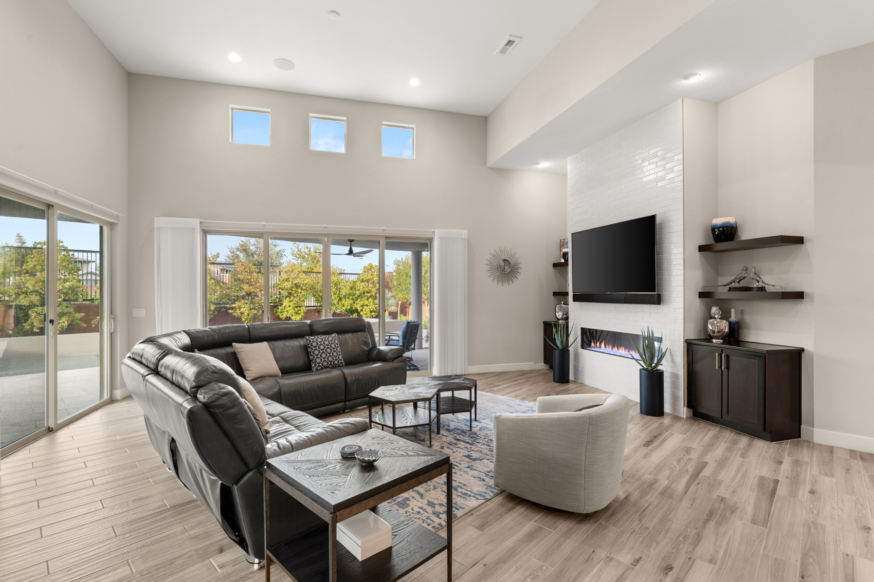 With no rear neighbors, serenity is yours to savor. As you step inside, youāre greeted by expansive living spaces drenched in natural light, thanks to oversized sliding doors and thoughtfully placed windows. The heart of the home is the great room, where clean lines and modern elegance take center stage. A striking linear fireplace, custom built-ins, and floating shelves add architectural interest and a warm, inviting ambianceāperfect for relaxing or hosting guests.