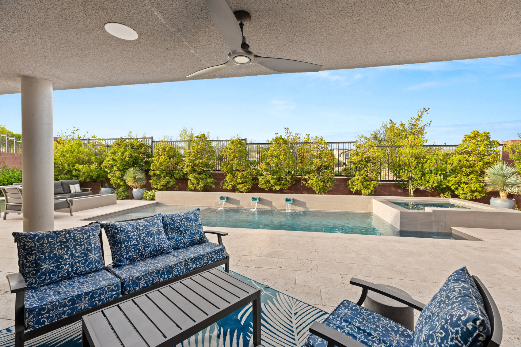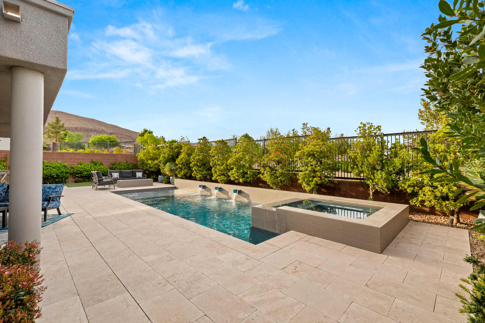 The adjacent chefās kitchen is a true showpiece, equipped with Jenn Air stainless steel appliances, an oversized island with seating, a wine fridge, and a built-in office nookāideal for remote work or planning the perfect dinner party. Every detail is designed for both function and flair. The primary suite is a private retreat, offering a peaceful sanctuary with large windows, spa-inspired finishes, and direct access to the backyard. The ensuite bathroom features an oversized walk-in shower, dual vanities, and a spacious walk-in closet, creating a seamless blend of luxury and comfort. Step outside to your resort-style backyard oasis, where every element is designed for relaxation and entertainment. A sparkling pool with water features sets the scene, complemented by a raised spa, a covered patio, and a built-in BBQ ready for weekend gatherings. As the sun sets, unwind by the fire pit lounge with a drink in hand, surrounded by low-maintenance landscaping and mountain views that add to the tranquil setting. Additional highlights include a 3-car garage, paver-lined driveway, tankless water heater, and energy-efficient construction. Located in one of Summerlinās most coveted neighborhoods, you'll enjoy close proximity to top-rated schools, scenic trails, golf courses, shopping, and diningāyet still feel tucked away in your own private paradise. This is more than just a homeāitās a lifestyle defined by comfort, elegance, and effortless indoor-outdoor living.