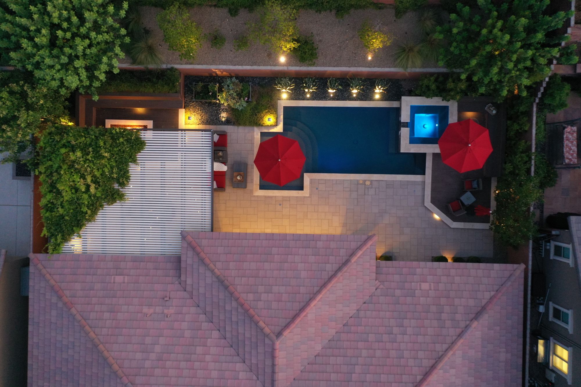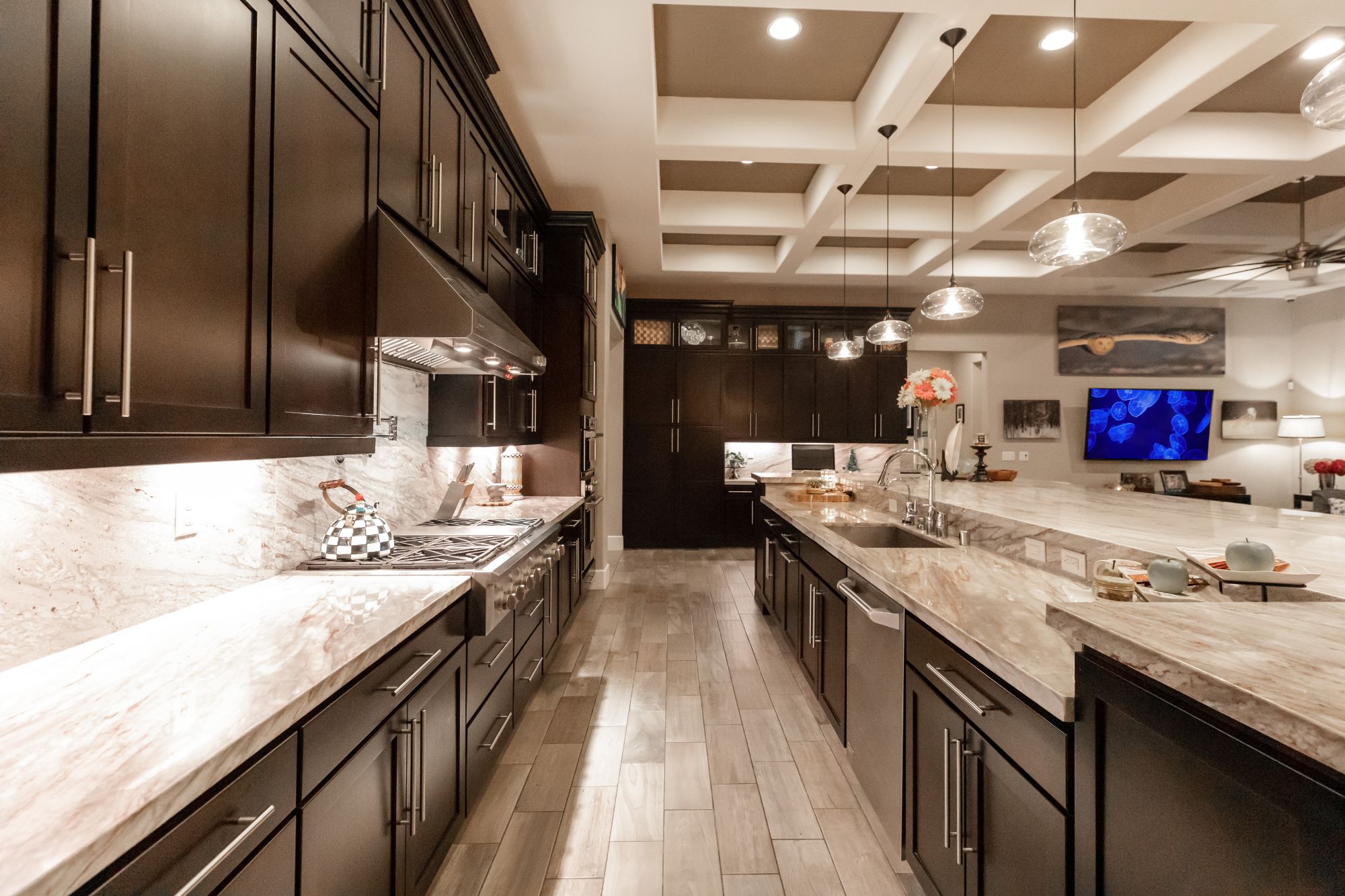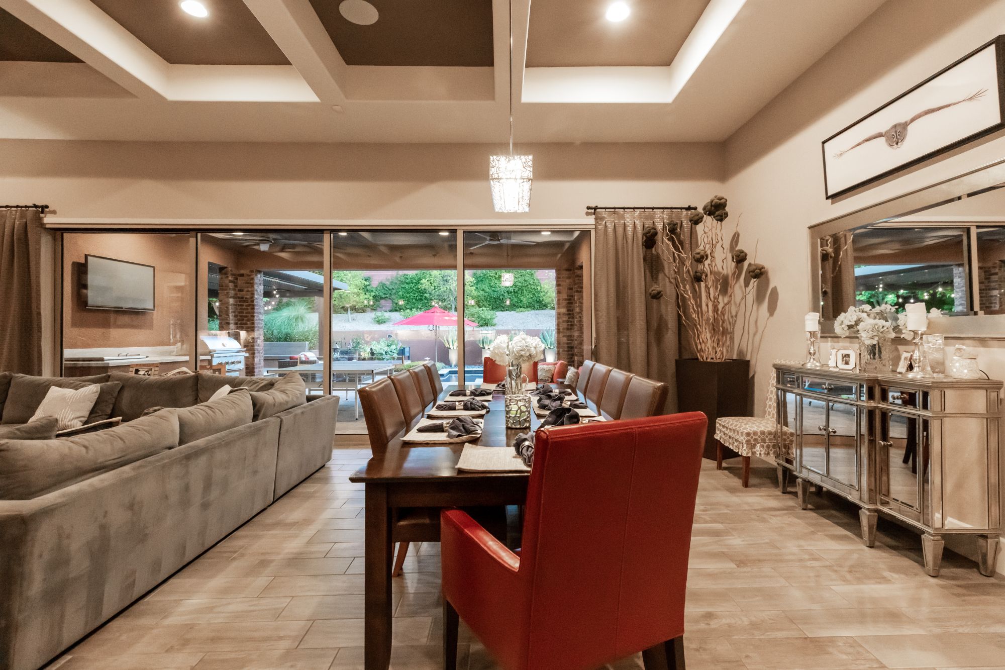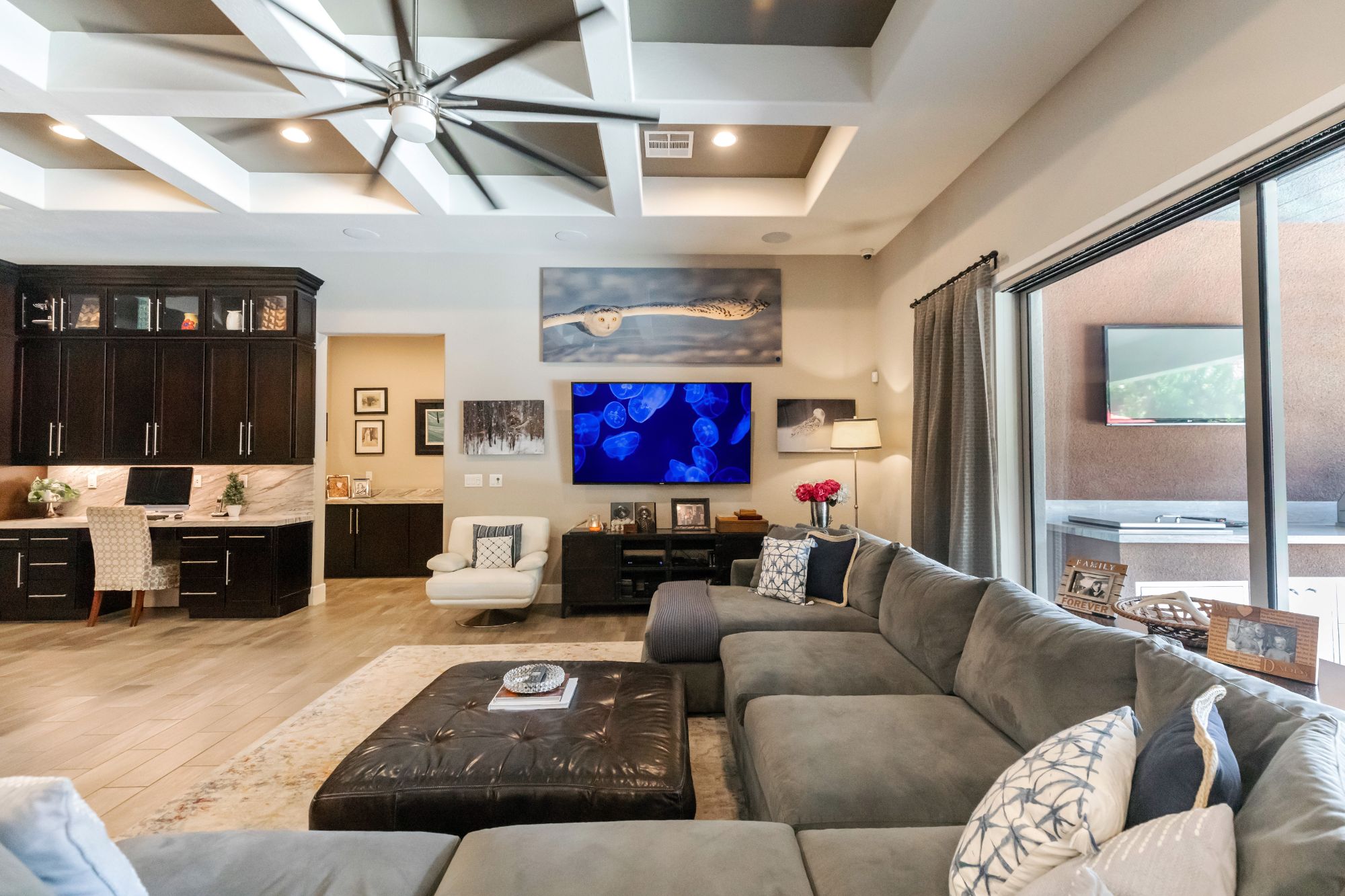 The kitchen and main living area are punctuated by a dramatic white coffered ceiling, complemented by an oversized marble island. Striking modern dark kitchen cabinetry contrasts the light colors, while top-of-the-line stainless steel appliances round out the room. The island opens to a cozy living room featuring a multi-slide door that connects to the homeās expansive outdoor living space. This true indoor-outdoor living setup is practically begging to host gatherings. An at-home oasis, the backyard combines stunning views with practical entertaining elements. The spacious deck features beautiful travertine pavers and a shaded pergola, accentuated by custom lighting that provides just the right ambiance as dusk transitions into night. The fully functional outdoor kitchen and shaded dining area are perfect for hosting BBQs or dinner parties, while the private entry casita makes guests feel right at home.