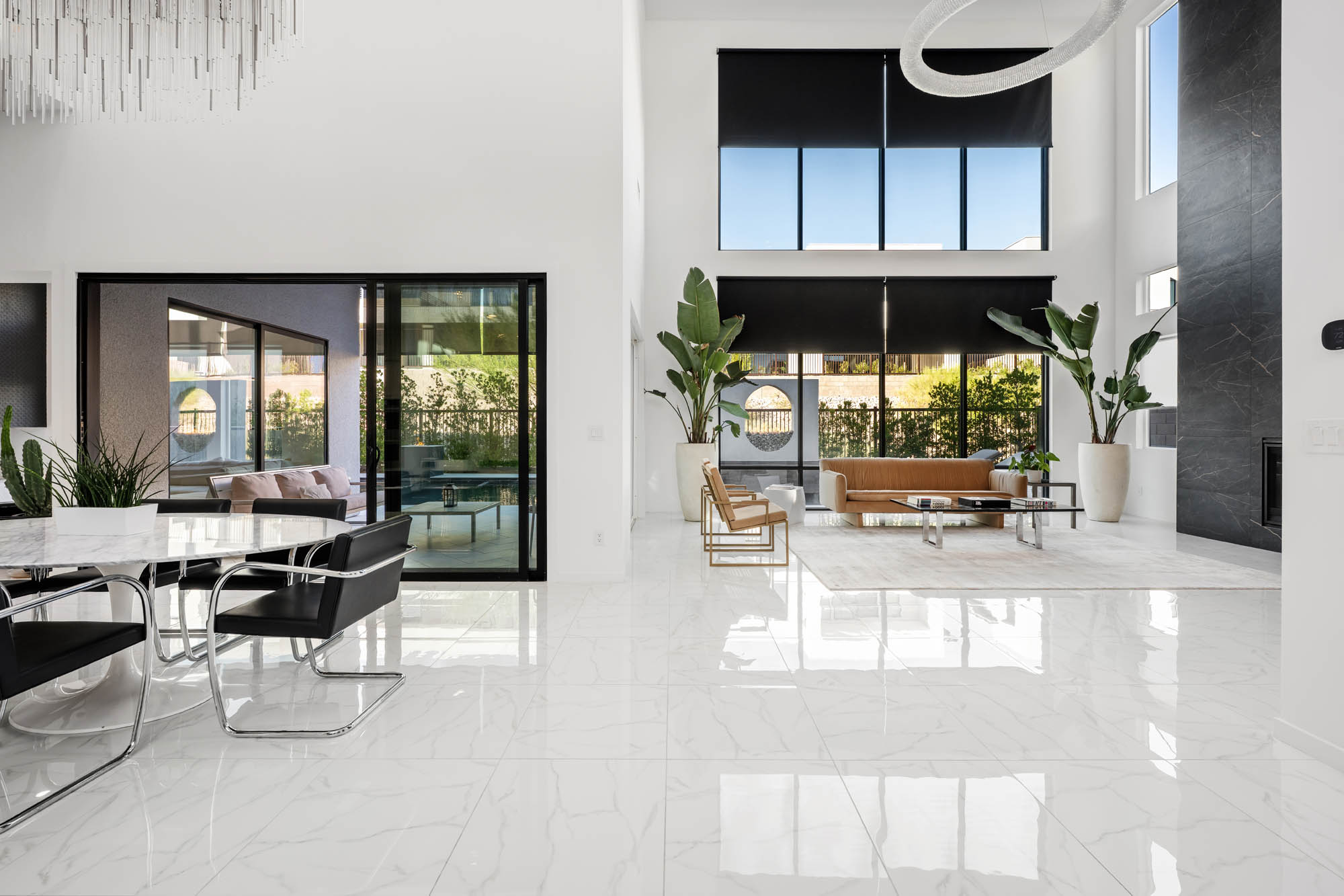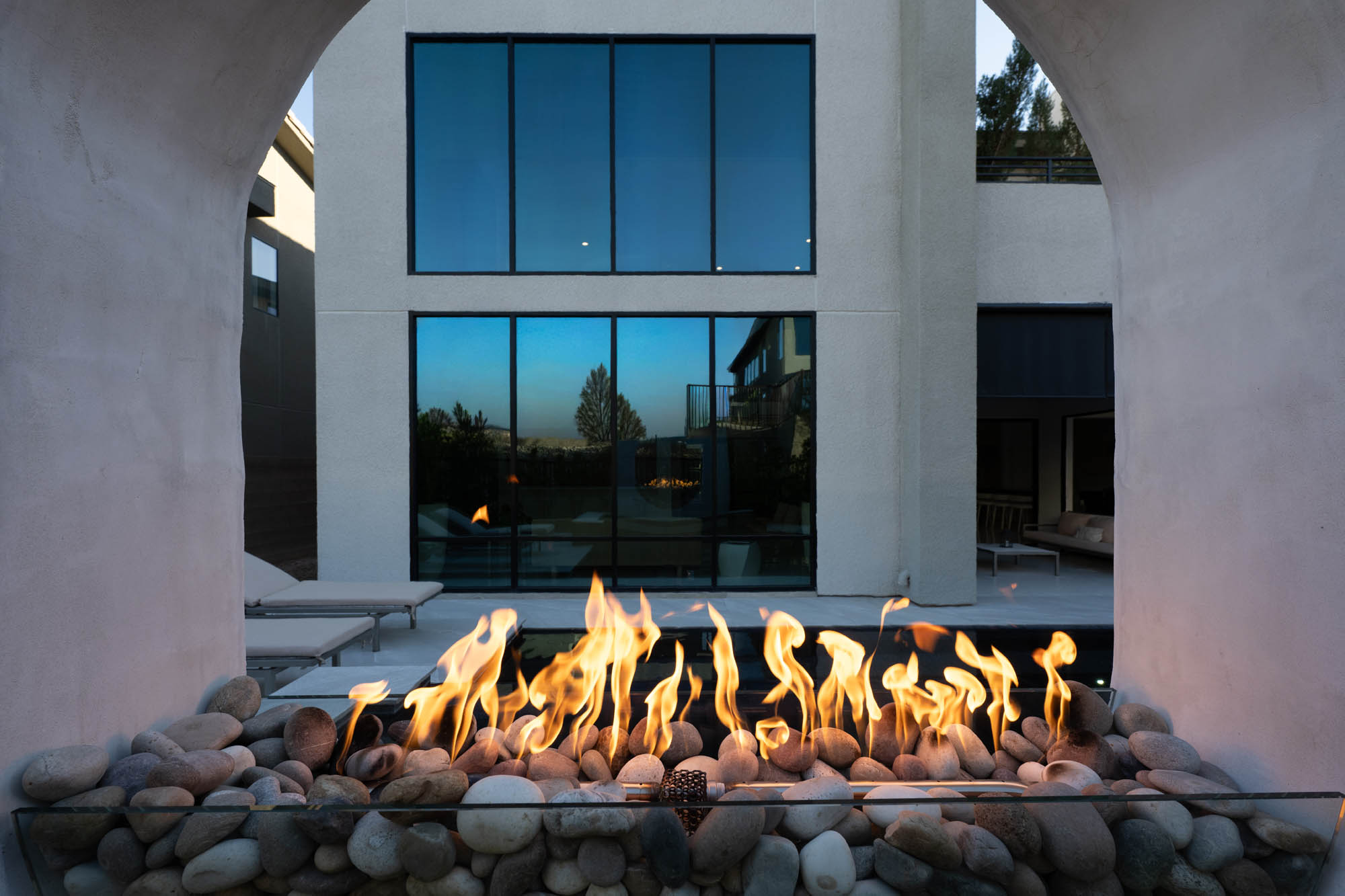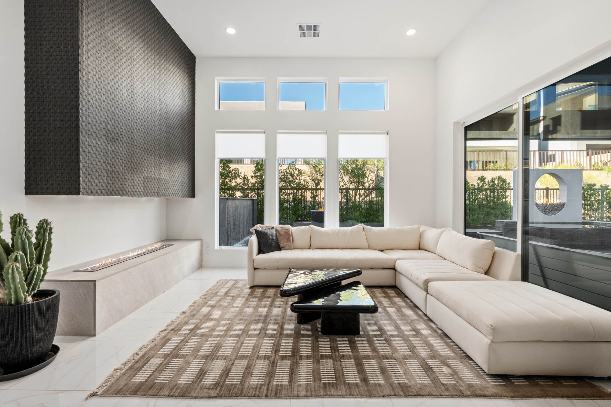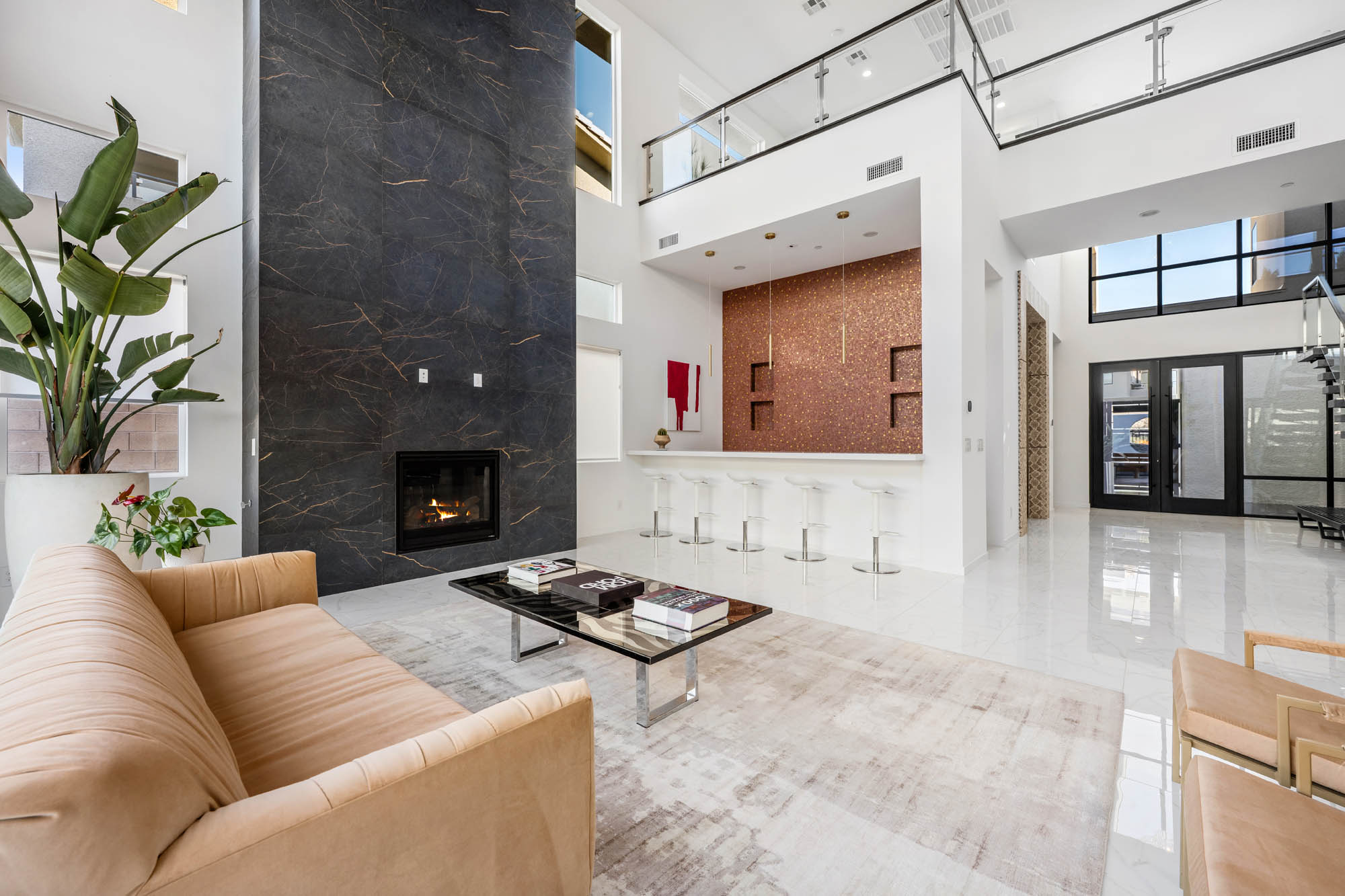 Outdoors, an entertainer's dream oasis backyard features an infinity-edge pool, waterfall, fire features, and intimate lounge sitting areas. Inside, soaring ceilings, a dramatic spine staircase, and sleek designer finishes set the tone. The great room features a striking fireplace wall and custom bar, while the gourmet kitchen equipped with high-end appliances overlooks the dining room illuminated by stunning chandeliers and a morning room finished with a custom fireplace. Casa Contempa is more than just a home, it's a carefully curated modern masterpiece unlike anything else found in Las Vegas.