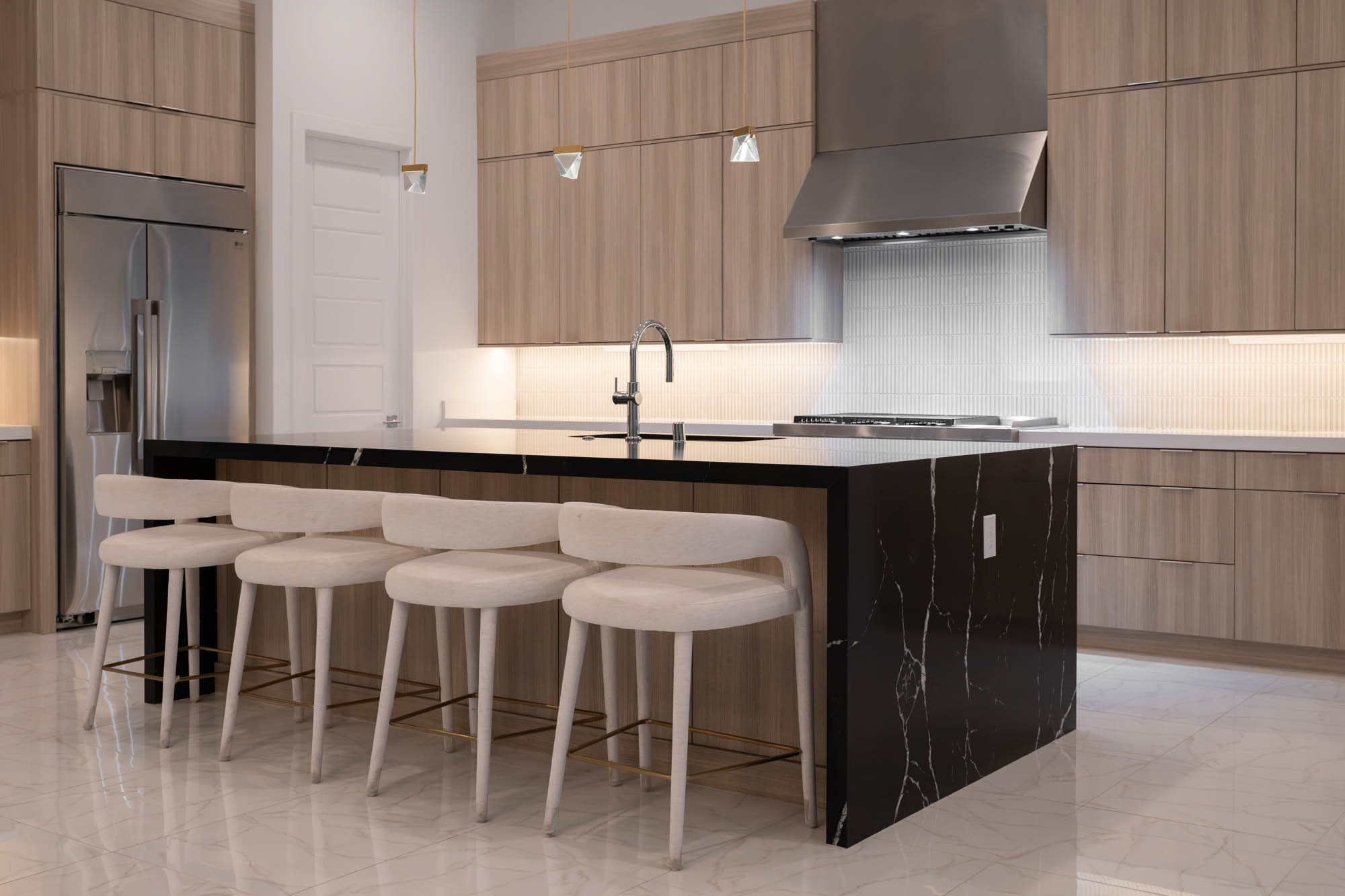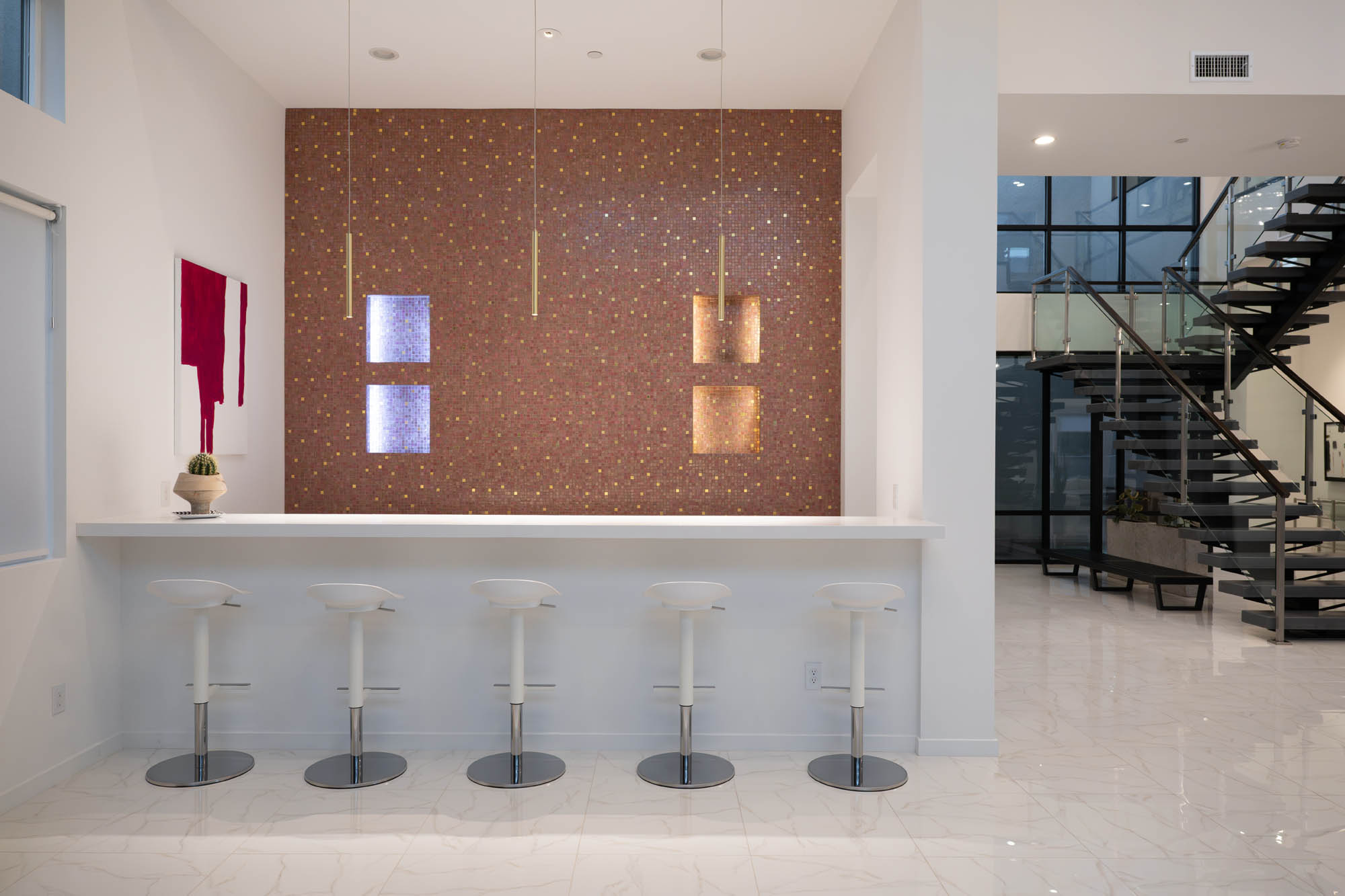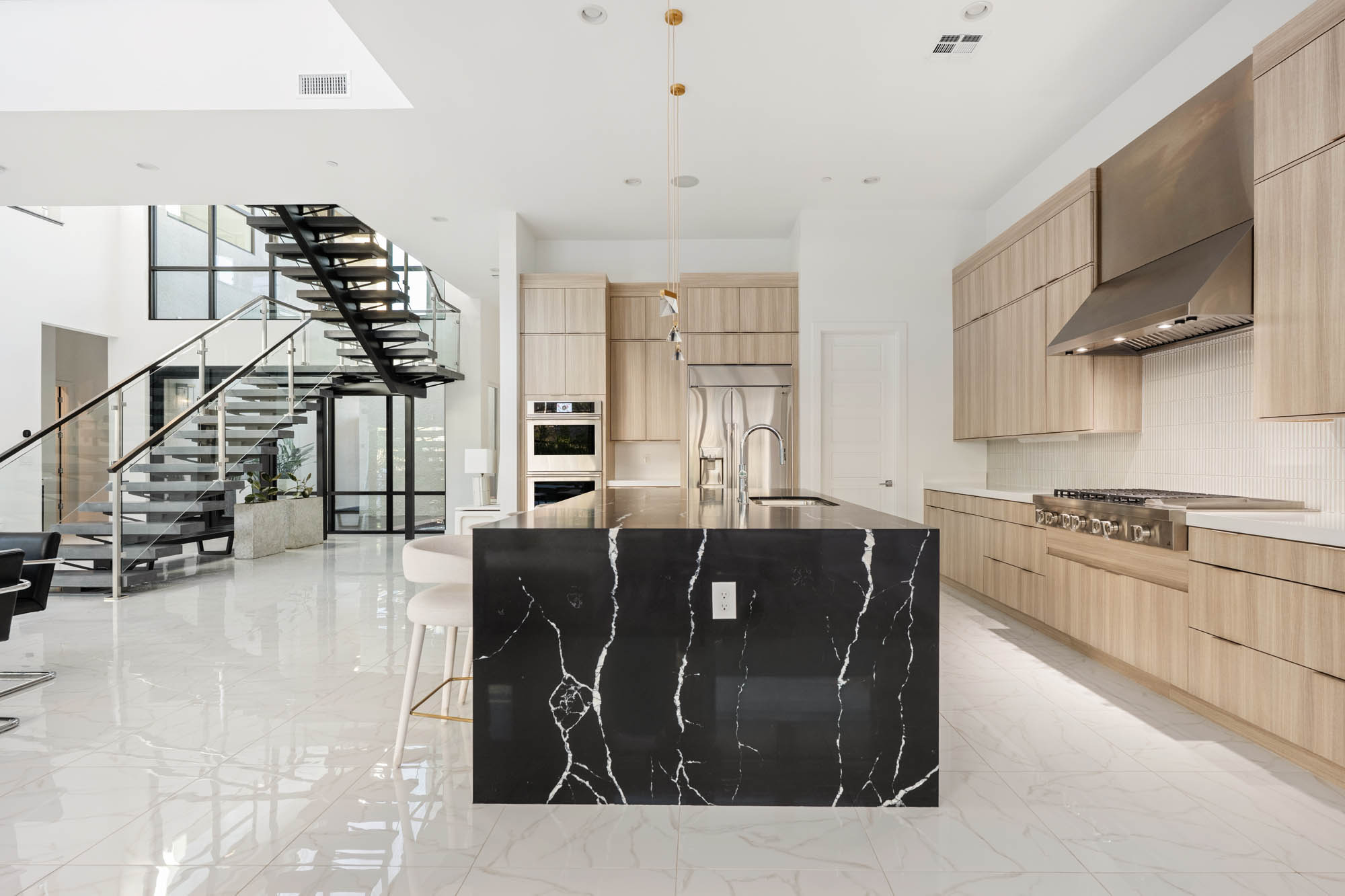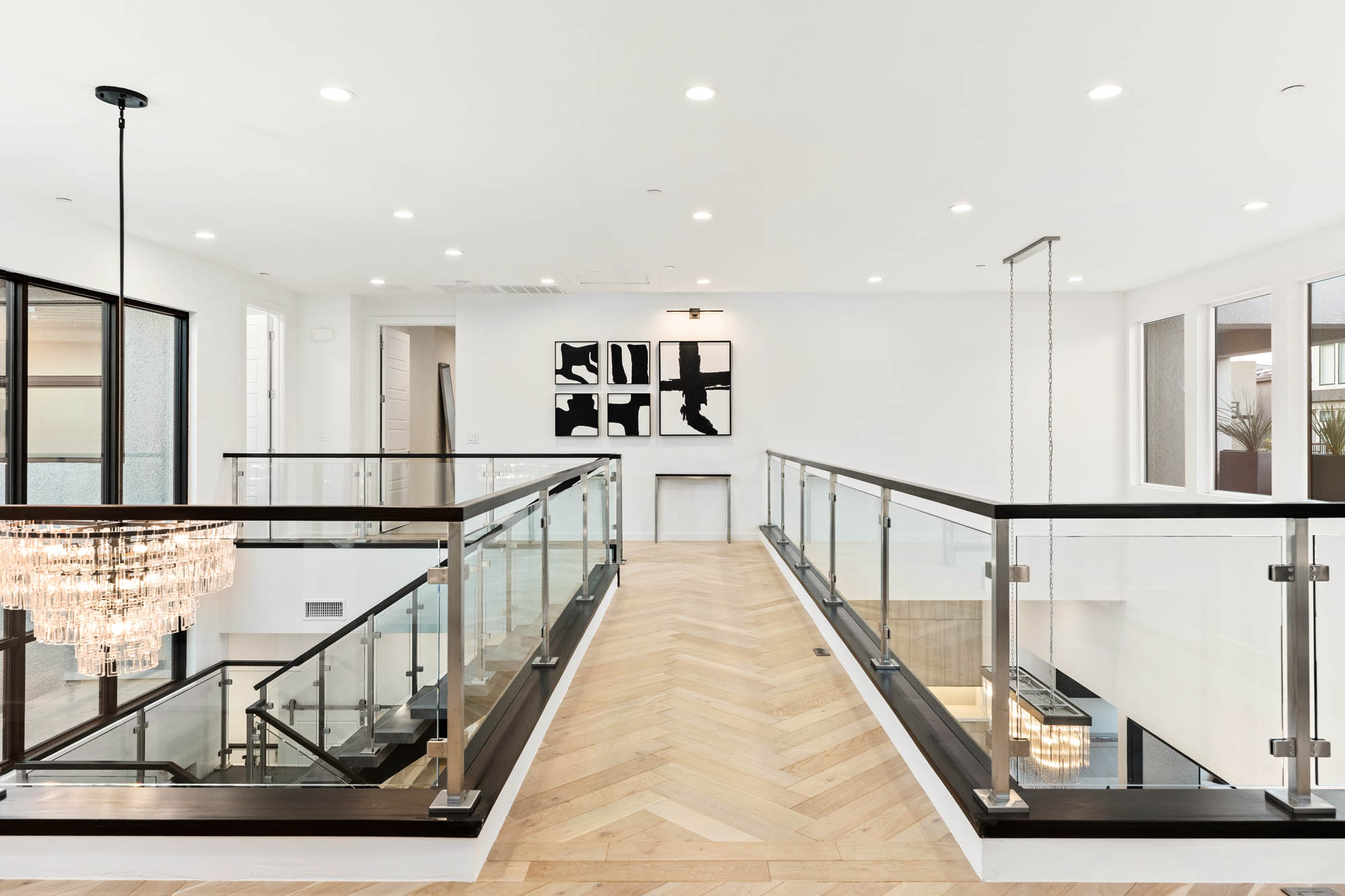 Outdoors, an entertainer's dream oasis backyard features an infinity-edge pool, waterfall, fire features, and intimate lounge sitting areas. Inside, soaring ceilings, a dramatic spine staircase, and sleek designer finishes set the tone. The great room features a striking fireplace wall and custom bar, while the gourmet kitchen equipped with high-end appliances overlooks the dining room illuminated by stunning chandeliers and a morning room finished with a custom fireplace. Casa Contempa is more than just a home, it's a carefully curated modern masterpiece unlike anything else found in Las Vegas.