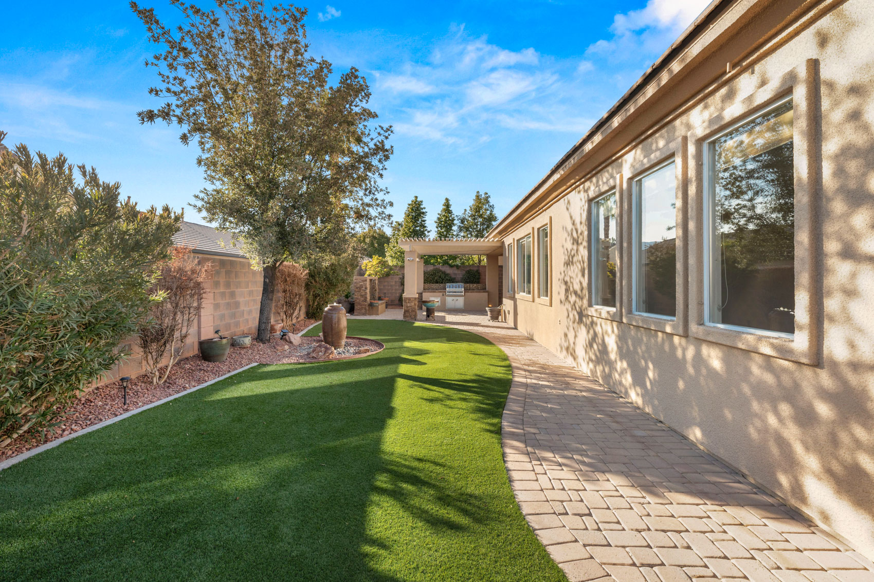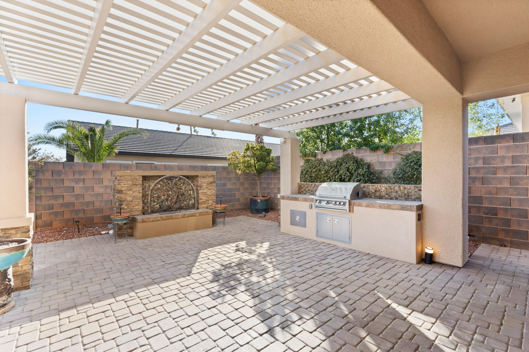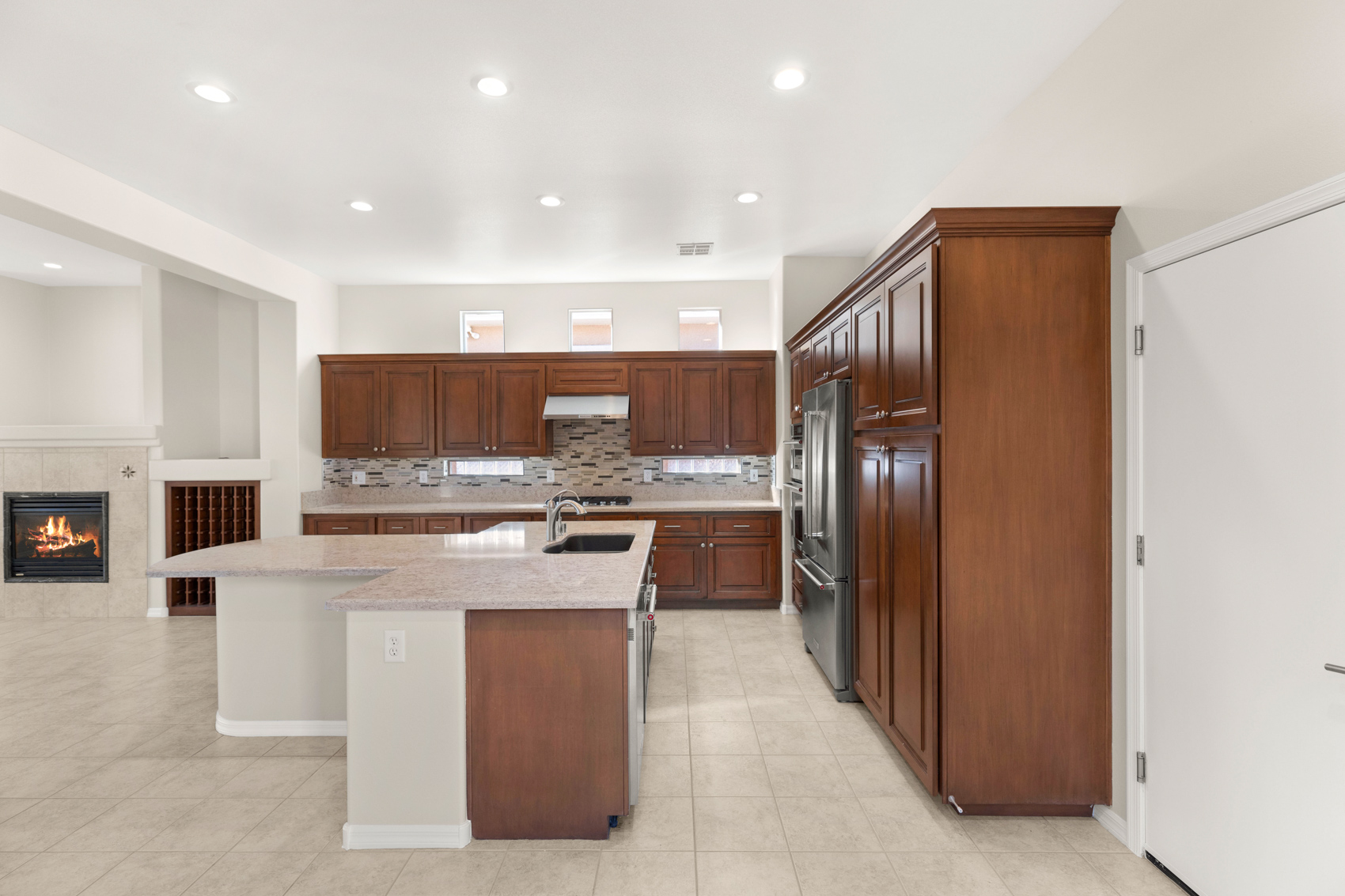A custom wine bar with a wine fridge, rack, and shelving adds sophistication. The versatile layout offers four spacious bedrooms, a large living and dining room combo, and a cozy family room adjacent to the kitchen. The entertainerās backyard includes a custom-built BBQ, patio cover, water and fire features, and low-maintenance artificial turf. The entry courtyard features a tranquil waterfall and new pavers leading from the driveway. This home blends style, comfort, and convenience in an unbeatable location.