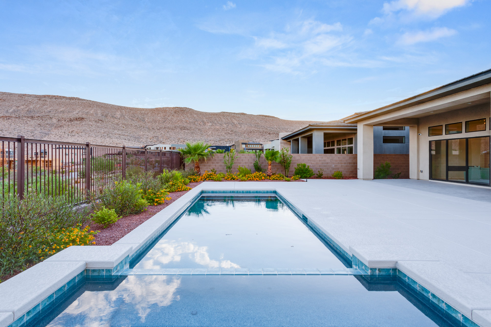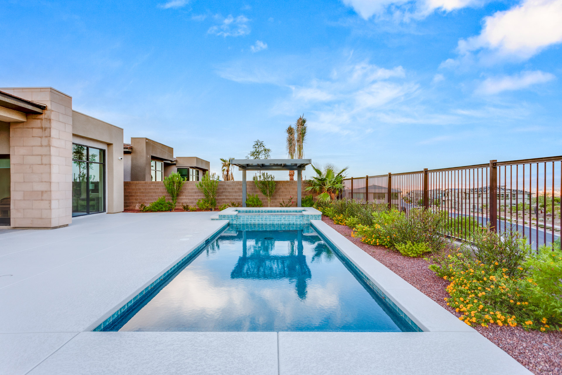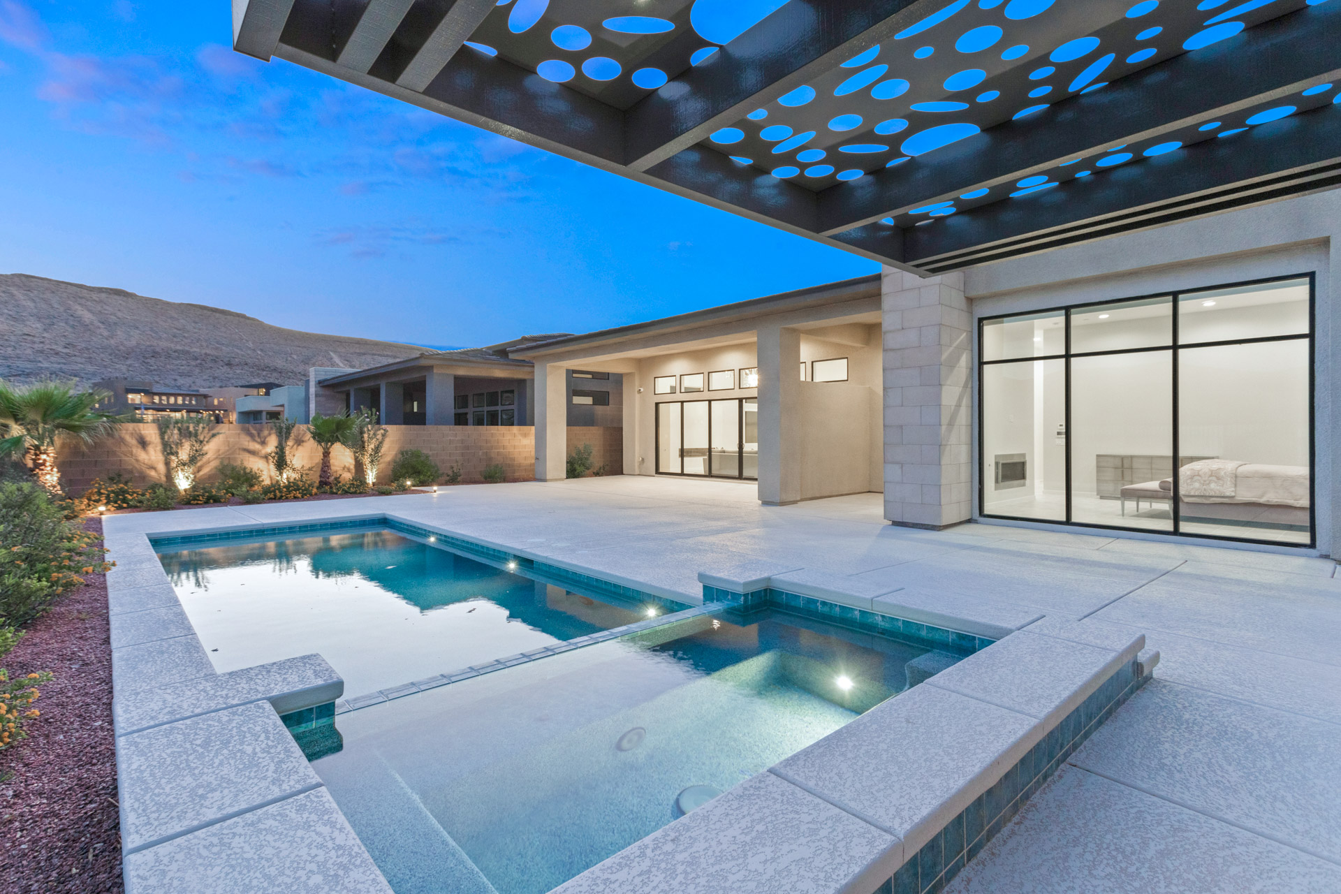 The master suite, which looks out over the pool and mountain range beyond, includes a master bath with soaking tub, dual walk-in showers, and spacious walk-in closet. Additional bedrooms open to an interior courtyard. The outdoor living area includes covered patios, pool with integrated hot tub and waterfall, as well as outdoor fireplace. Enjoy the abundant nearby recreation including trails, parks, and golfing, and moonlit nights gazing at the mountains and stars beyond in this gem of a home located in the premier urban and residential Las Vegas area community.