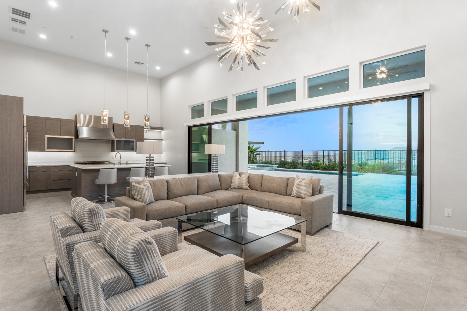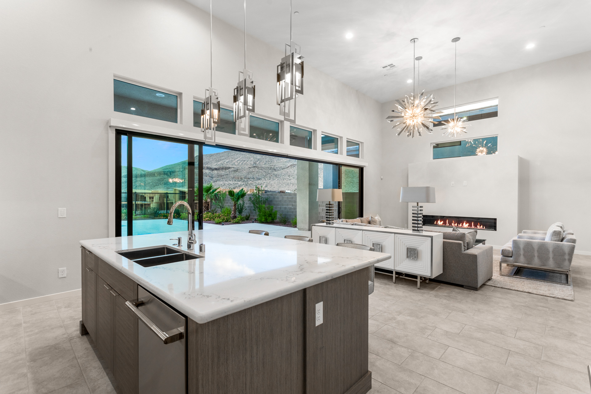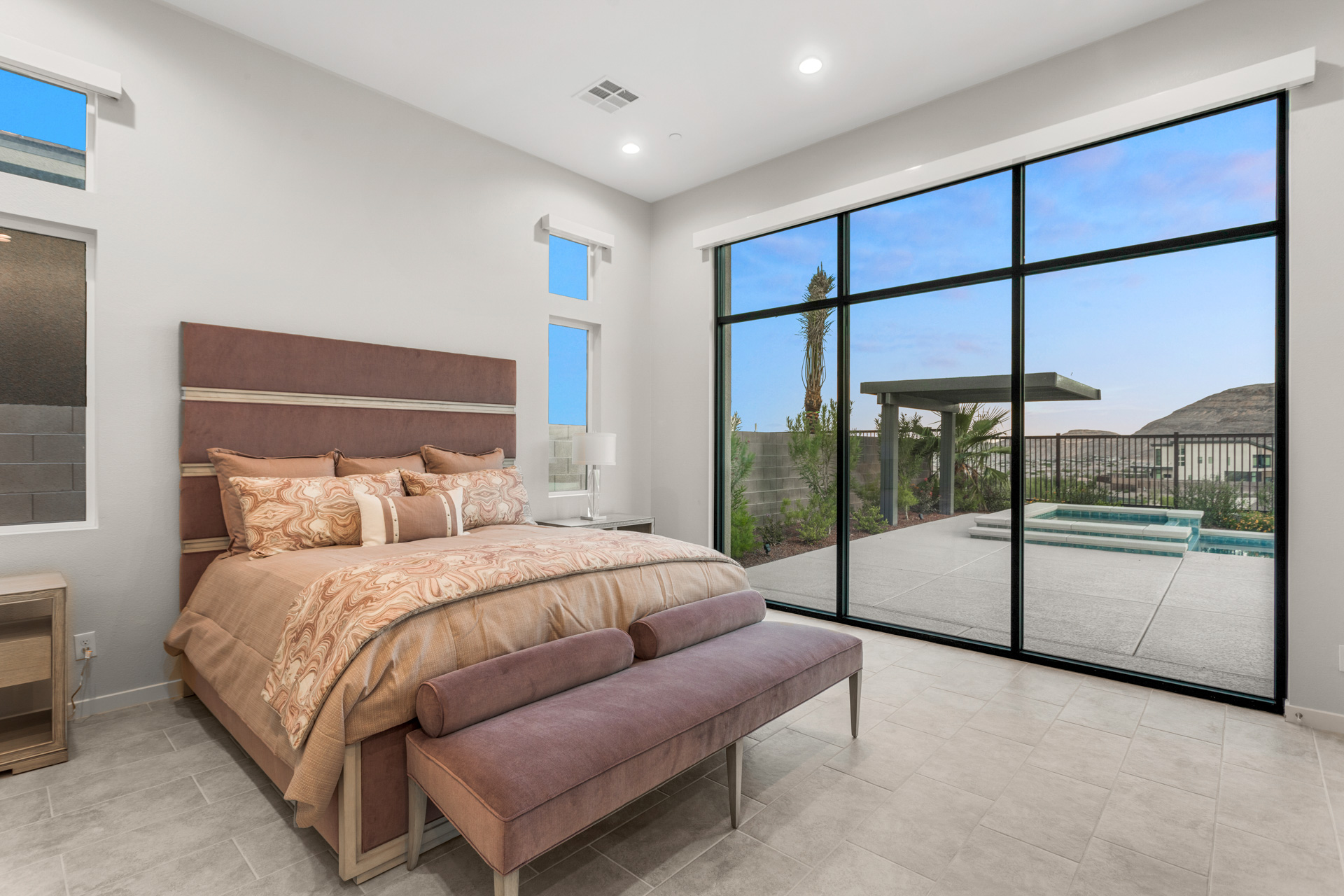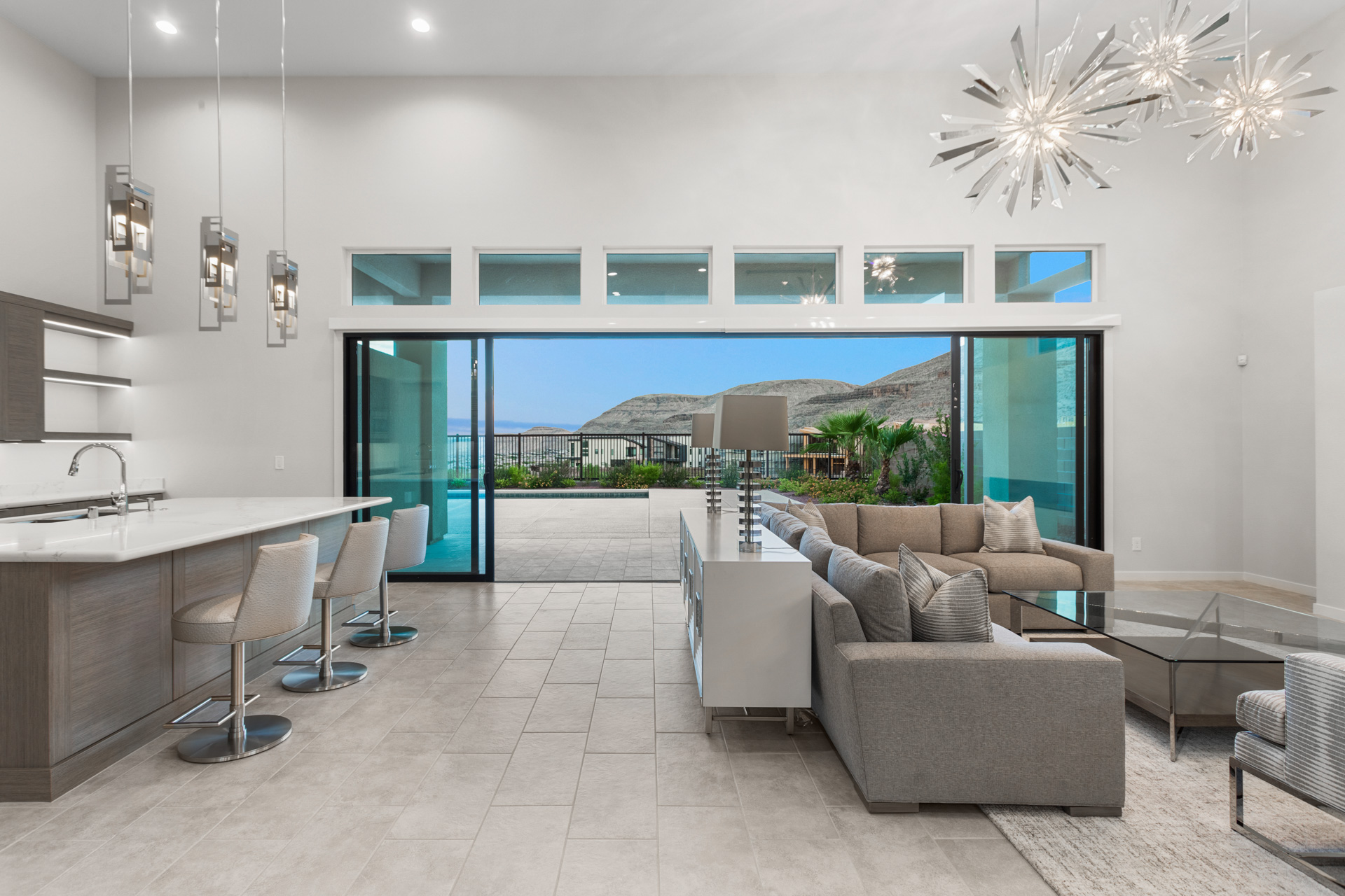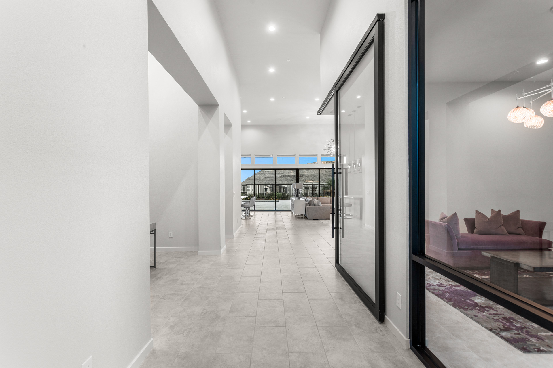 A modern home with sweeping vista views, this contemporary villa enjoys all the indoor and outdoor comforts. With 4 bedrooms, 3 and a half baths, 3,451 sq. ft. located in Mesa Ridge, a guard-gated community nestled in Summerlin, this house welcomes you to true enjoyment of desert living. Glass pocket doors expand a great room to the covered patio and pool deck beyond creating the perfect indoor and outdoor experience.