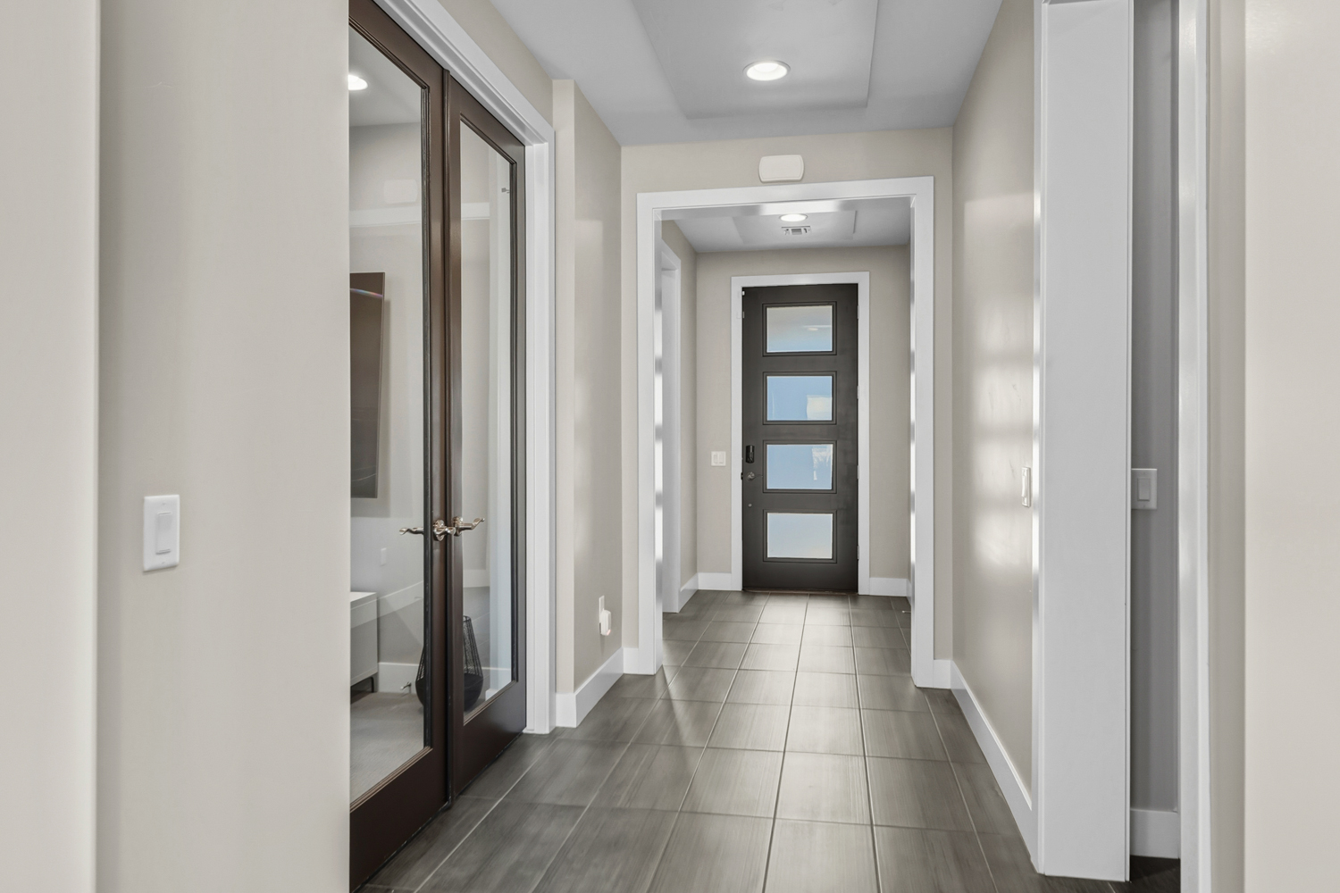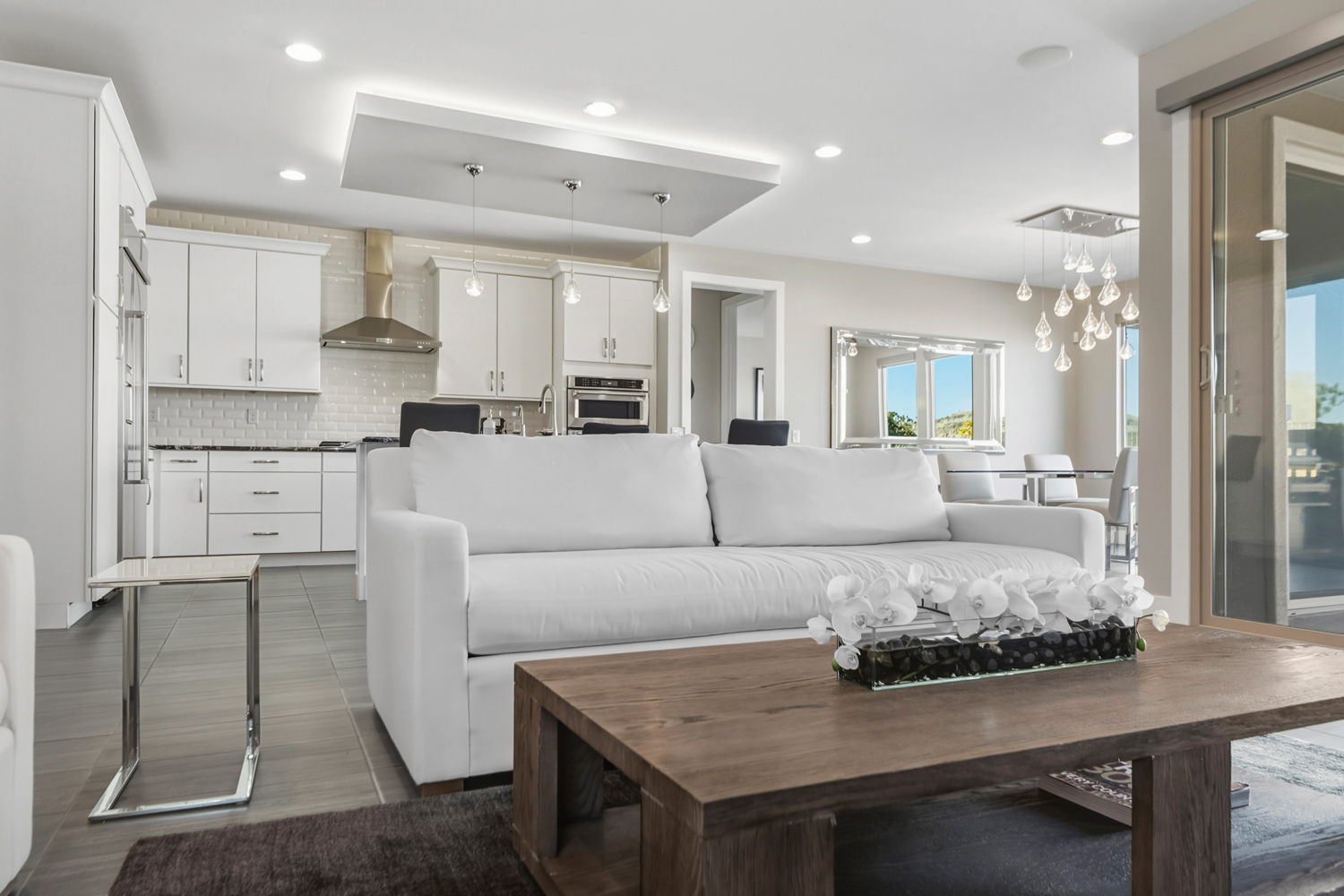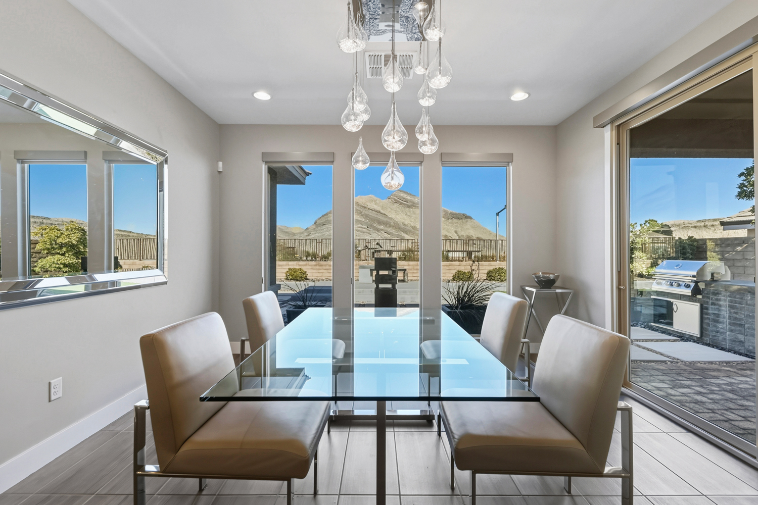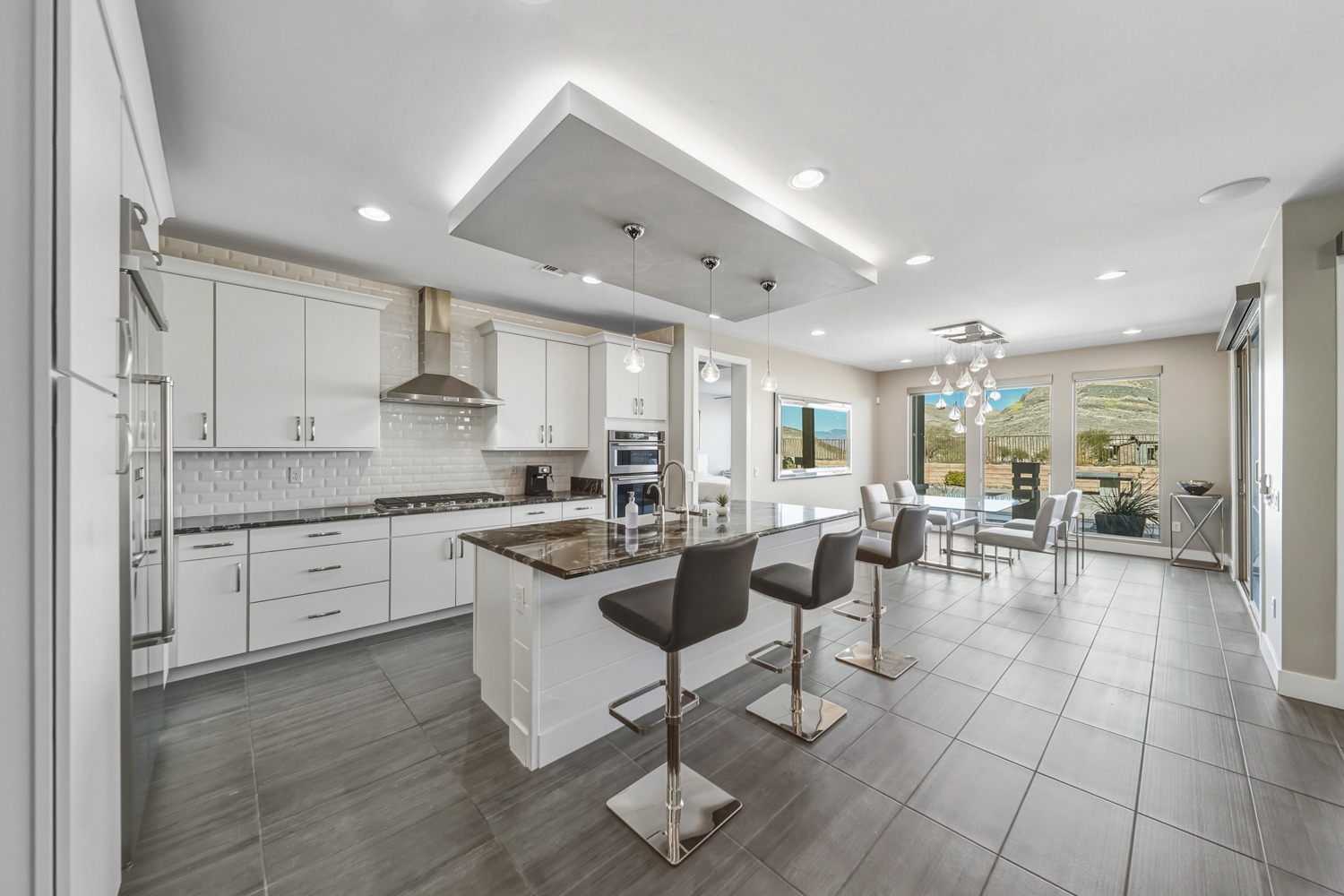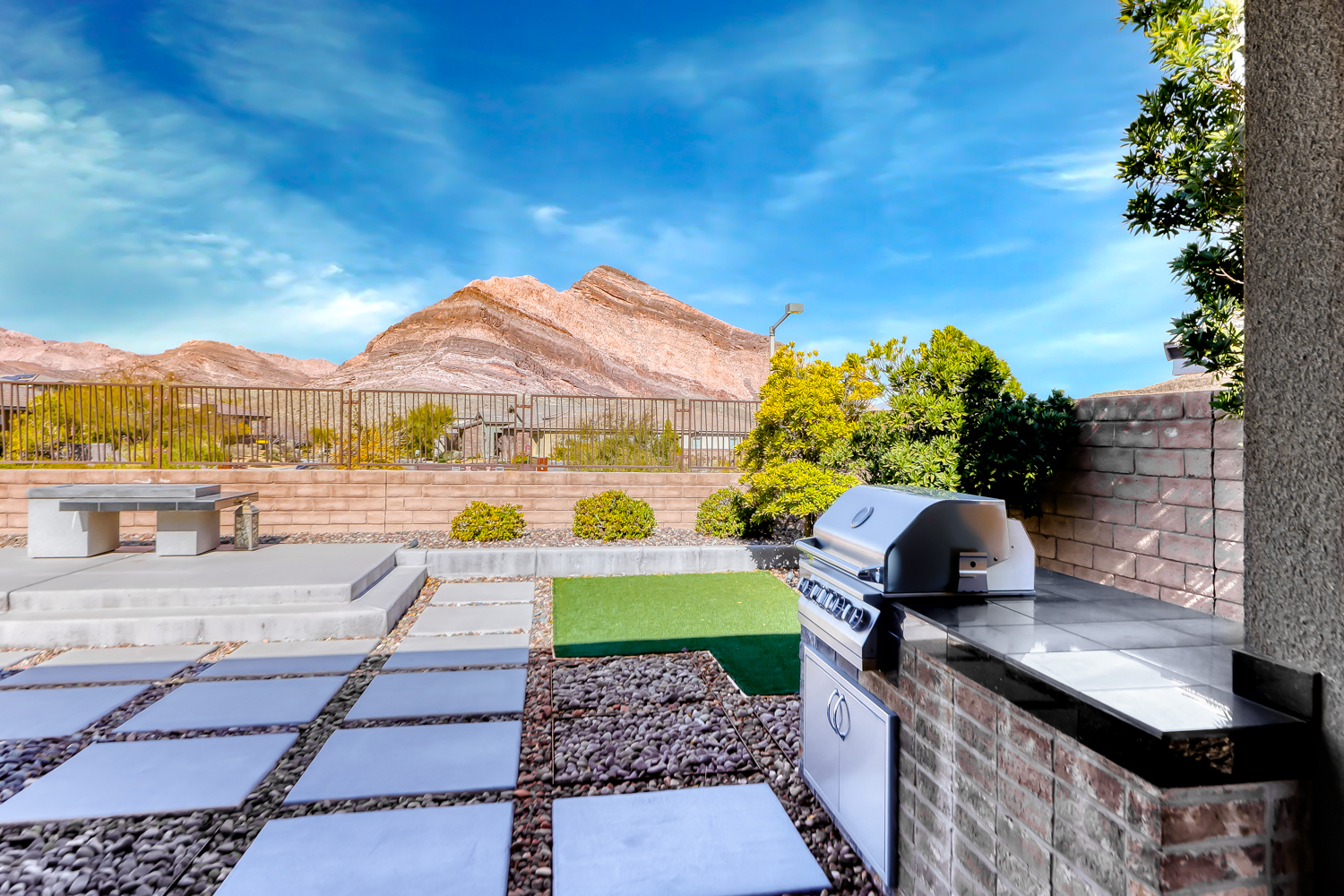 The Great Room opens to a custom outdoor living space ideal for entertaining, complete with a fire pit, built-in barbecue, and low-maintenance artificial turf. The chef-inspired kitchen offers stainless steel appliances, granite countertops, a farmhouse sink, shaker-style soft-close cabinetry, floating vanities, and a large island. A third bedroom/den/office provides flexible use and is enclosed with private glass doors. Located at the start of a quiet cul-de-sac, this home offers privacy just minutes from Downtown Summerlin’s shopping, dining, and entertainment.