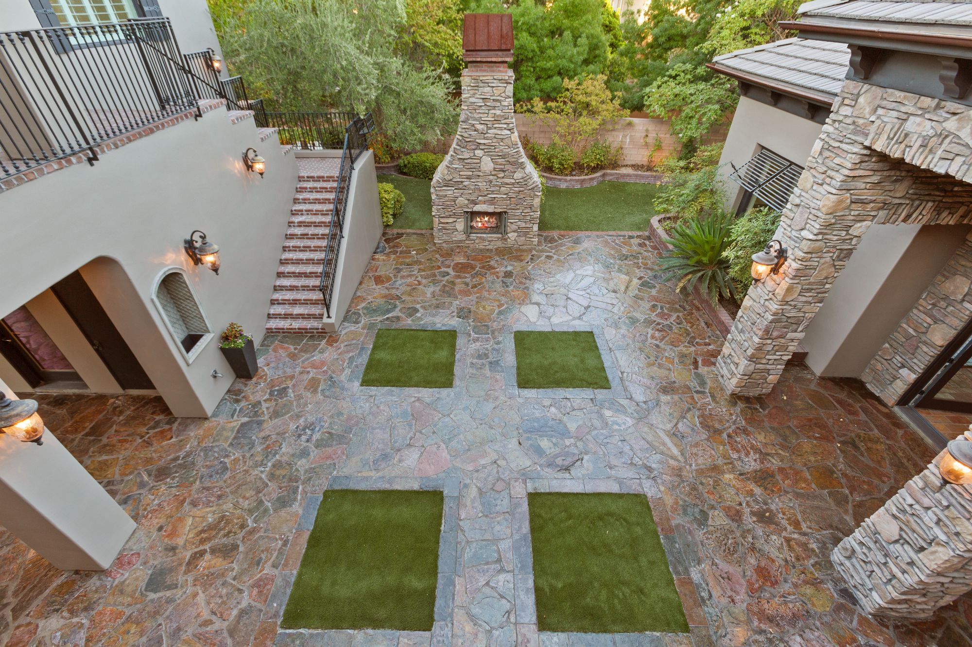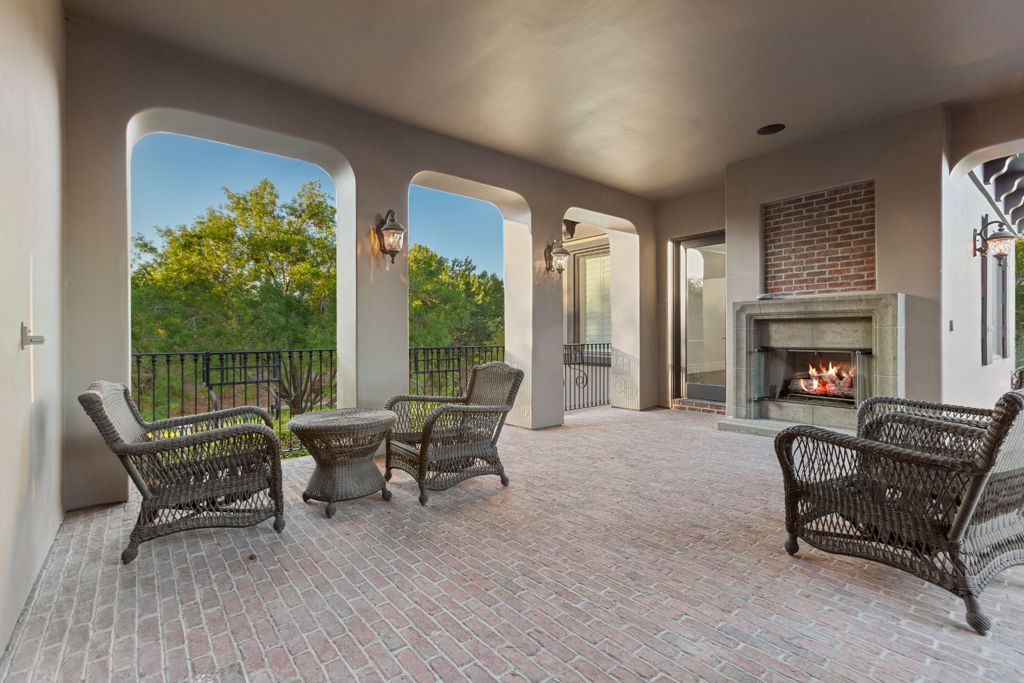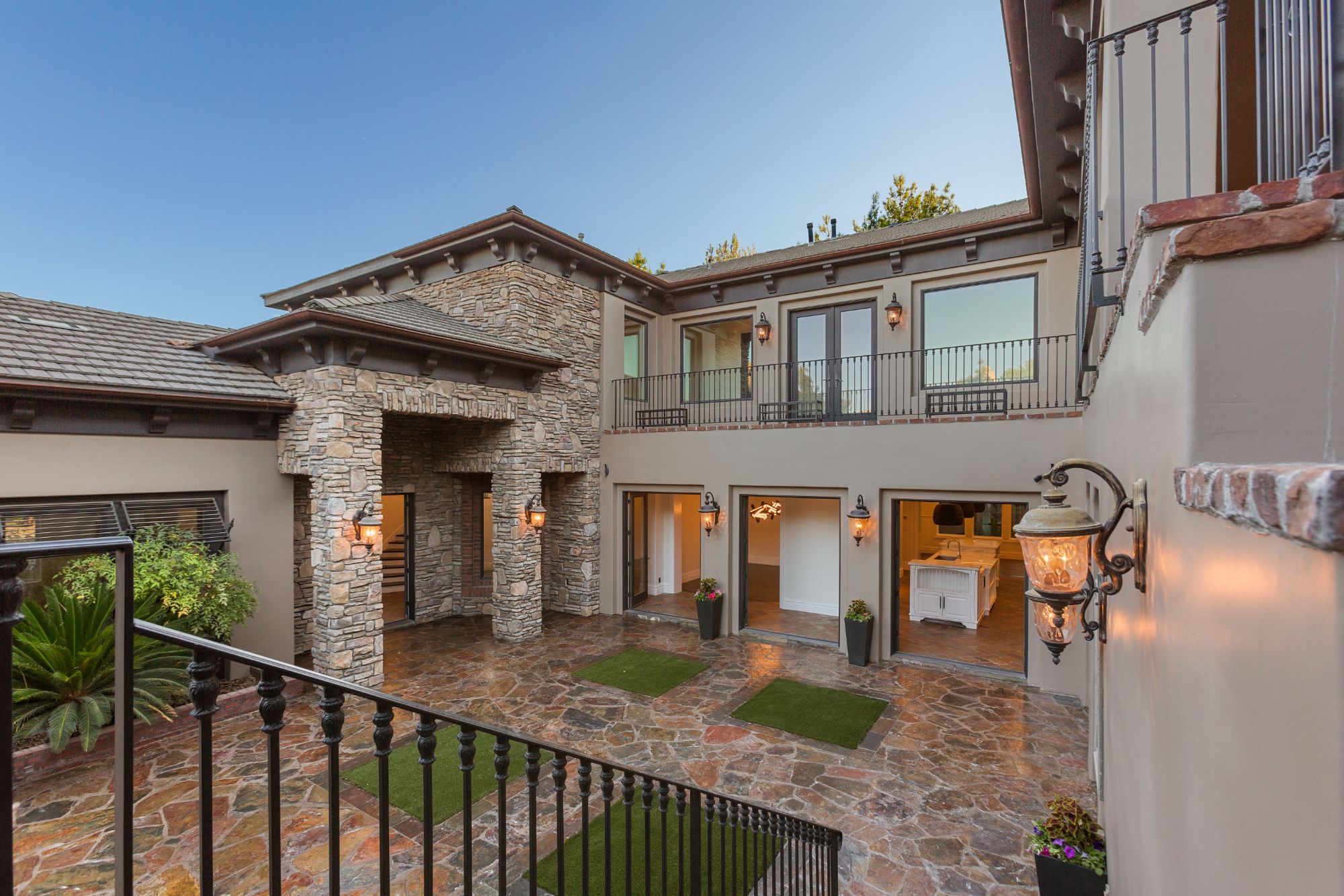 Rustic ceiling beams, central courtyard with water features, and the natural stone architectural accents add unique Old-World charm to this perfectly appointed modern living space. The expansive use of glass windows and doors provides picturesque views of the central courtyard from both floors. The exteriorās park-like setting is complete with an outdoor kitchen, including a built-in barbecue, sink and refrigerator. Two spacious side lots make for an abundance of seating arrangements for gatherings of family and friends. A private, heated inground pool with spa and exquisite landscaping add to the beauty of the homeās exterior. The garage offers four bays.