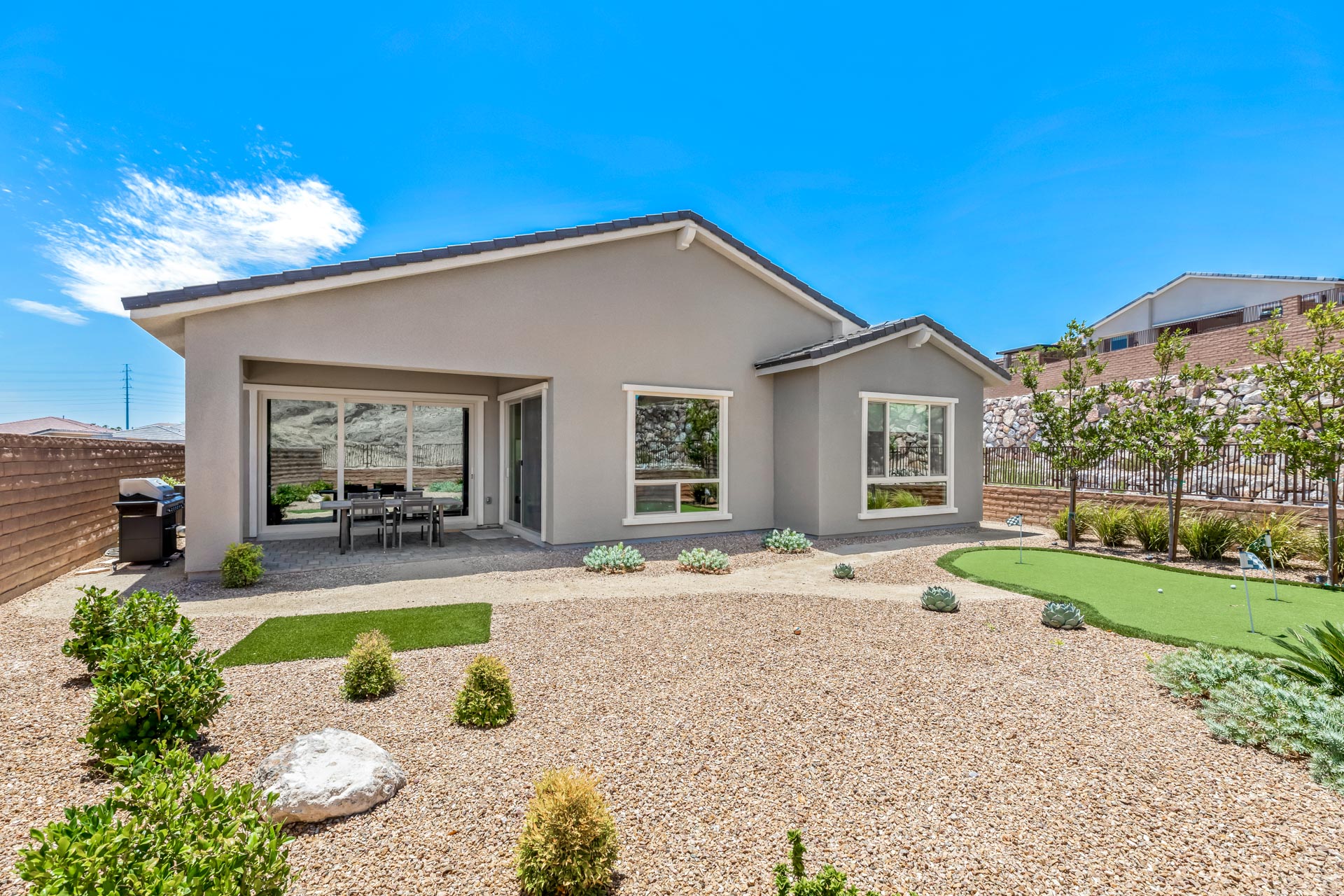 A bonus room off the kitchen may serve as a dining room, breakfast nook, or home office. The master bath boasts two sinks, large bathing tub, walk-in shower, and walk-in closet. Two more bedrooms and two full baths complete this ranch home in this guard gated community with a pool, fitness center, and tennis courts. The xeriscaped yard includes putting and chipping greens. Located in Summerlin Village, a premier urban and residential community, this house balances desire for space yet accessibility to shops and community.