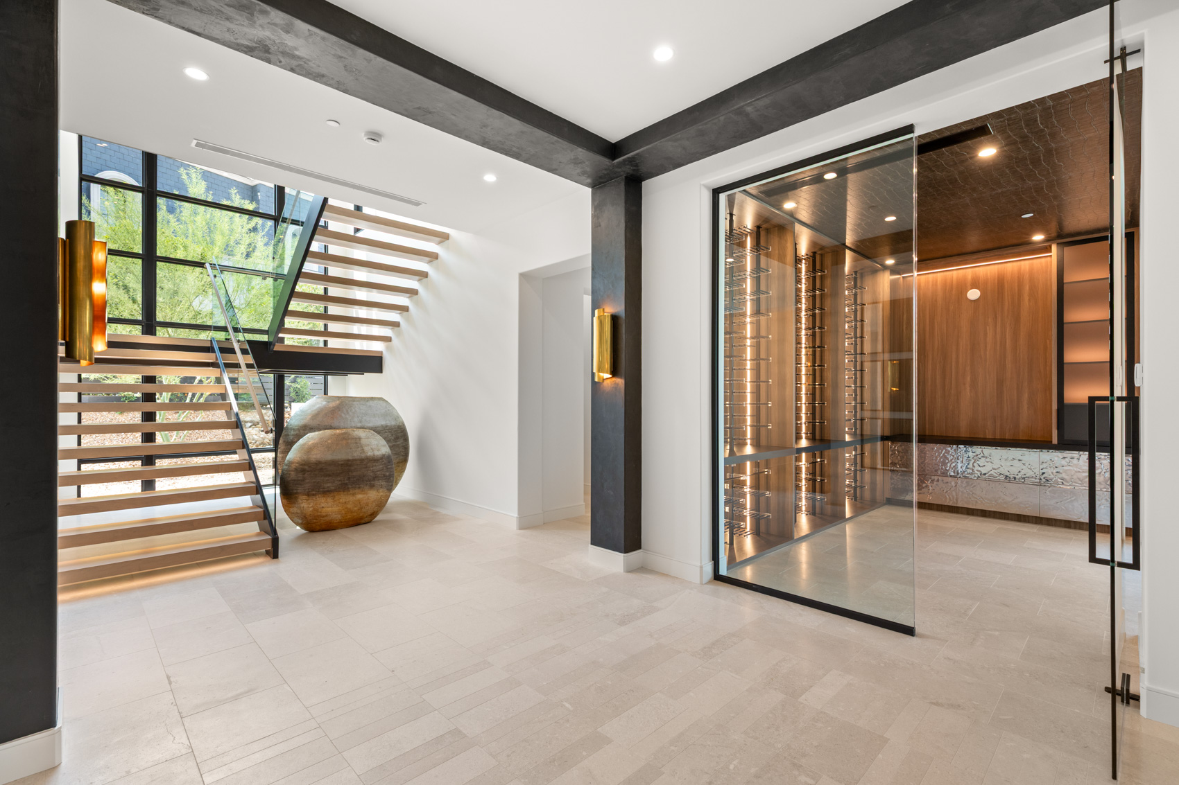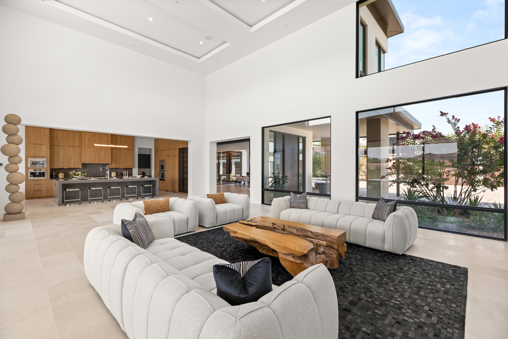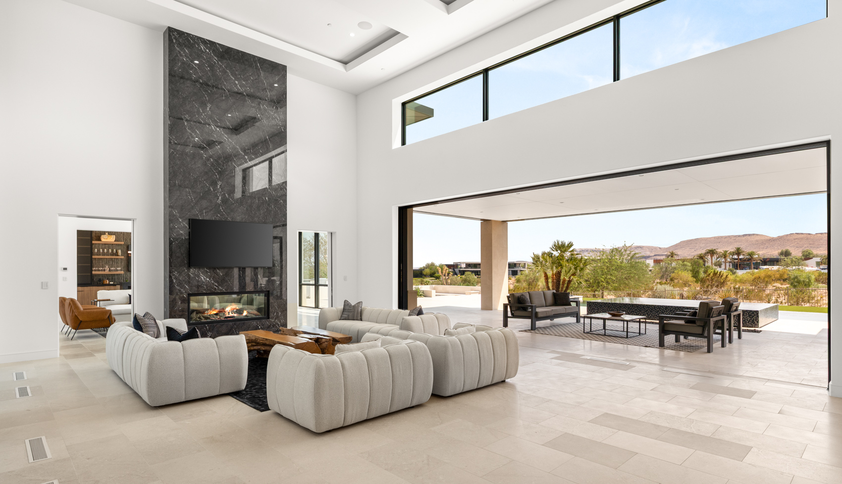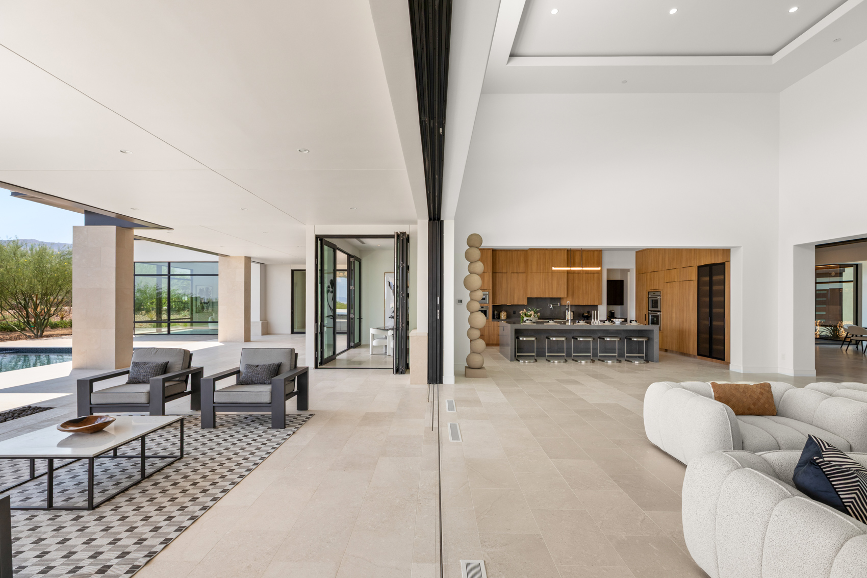 A sweeping grand entrance begins beneath a dramatic porte-cochère, leading to a spacious motor court and a detached four-car garage. Clean lines and striking modern textures define the façade, while lush landscaping softens the edges and guides you into the heart of the home. From the moment you step inside, you're met with expansive living spaces flooded with natural light, soaring ceilings, and floor-to-ceiling pocketing glass doors that dissolve the boundary between indoors and out.