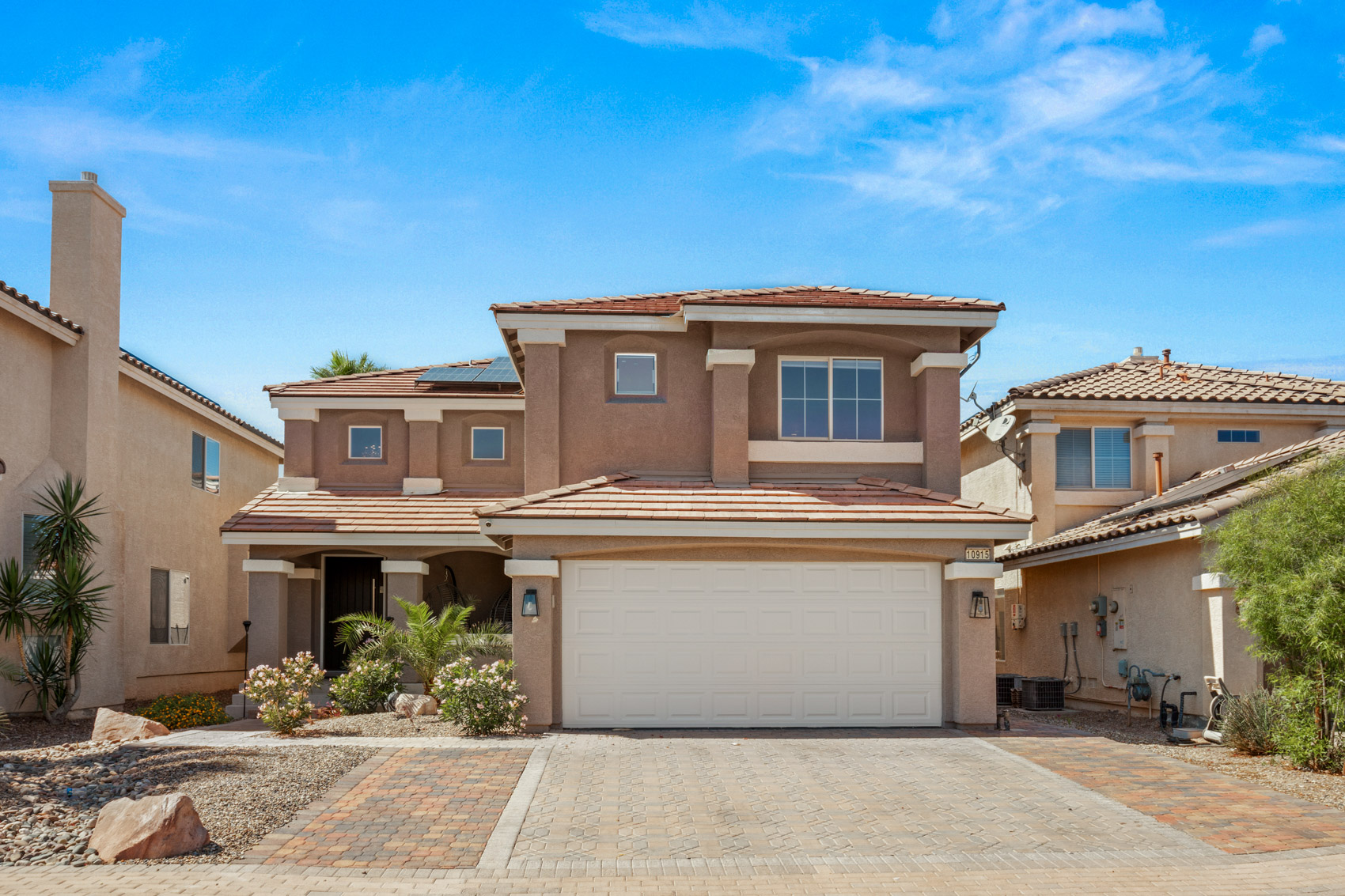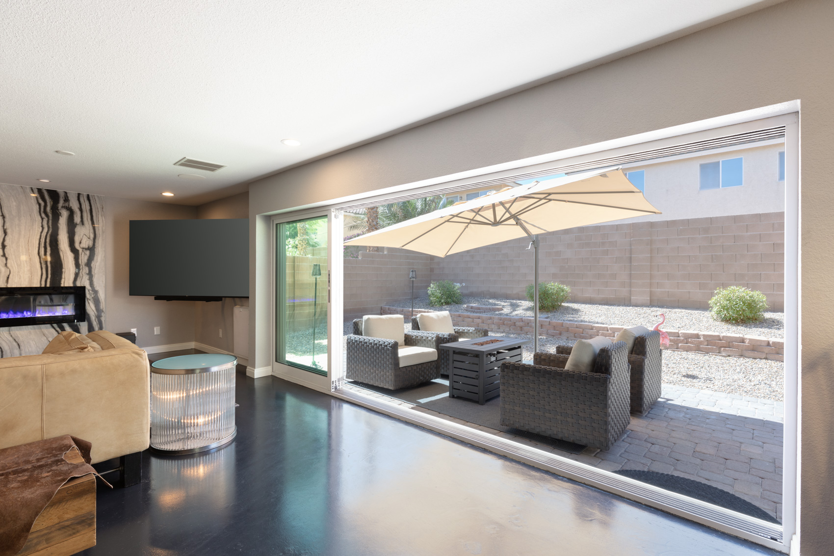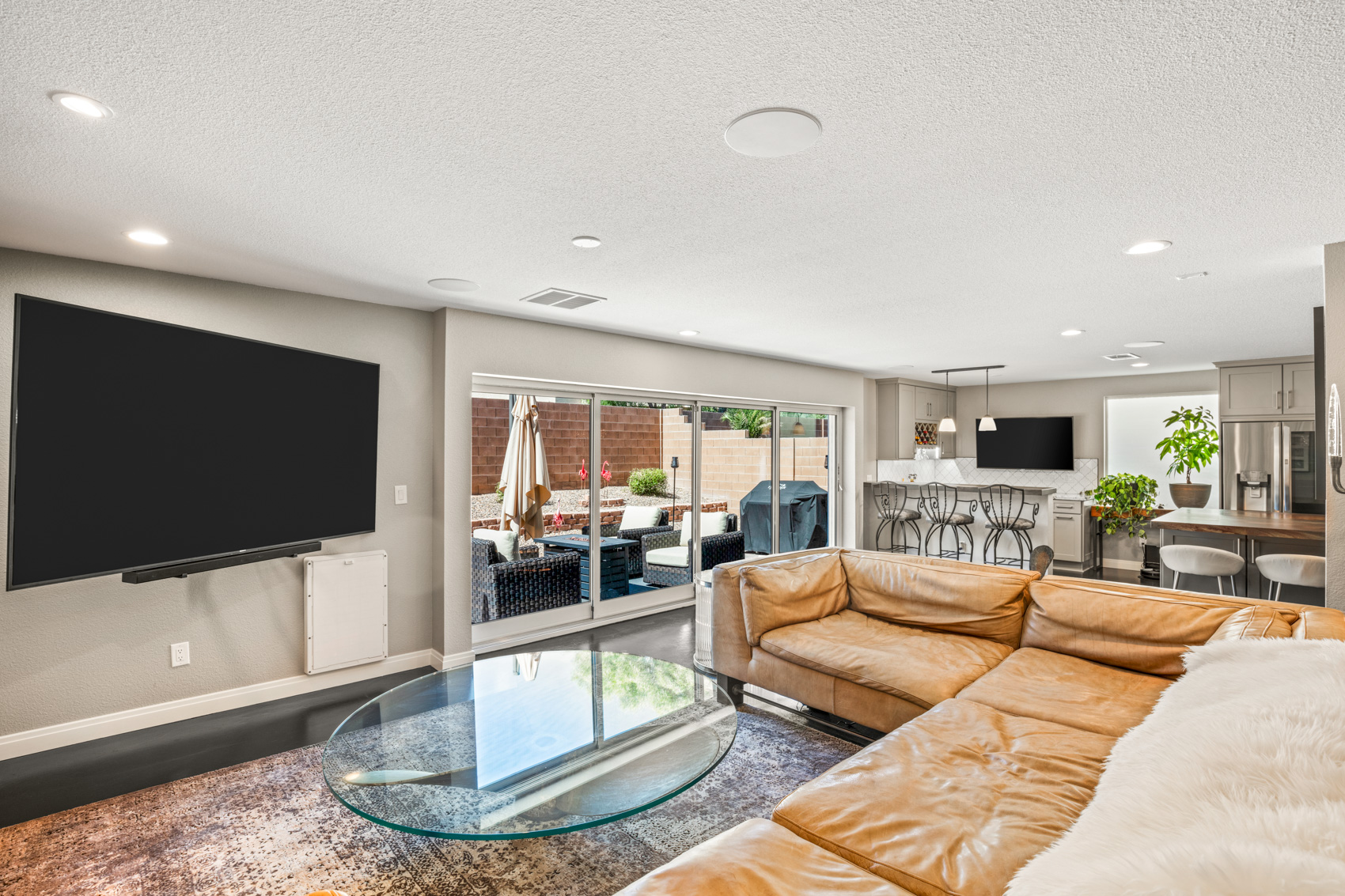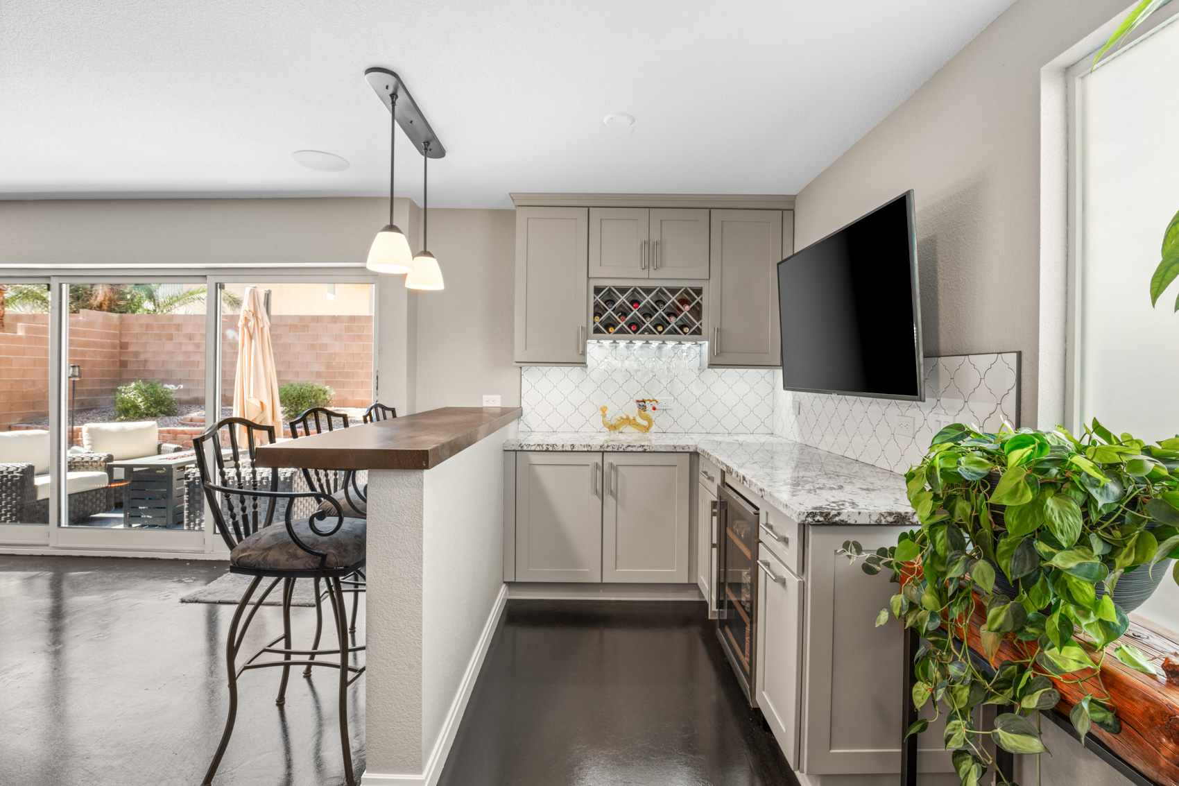 Modern shaker cabinets and natural stone countertops add to the allure. Currently configured as a one-bedroom home, it can easily be converted to a 3-bedroom layout if needed. Enjoy the benefits of updated HVAC units and full coverage solar panels added in 2022. This property is situated in a highly desirable guard gated community, only 10 minutes from the Strip and near numerous shopping and restaurant options.