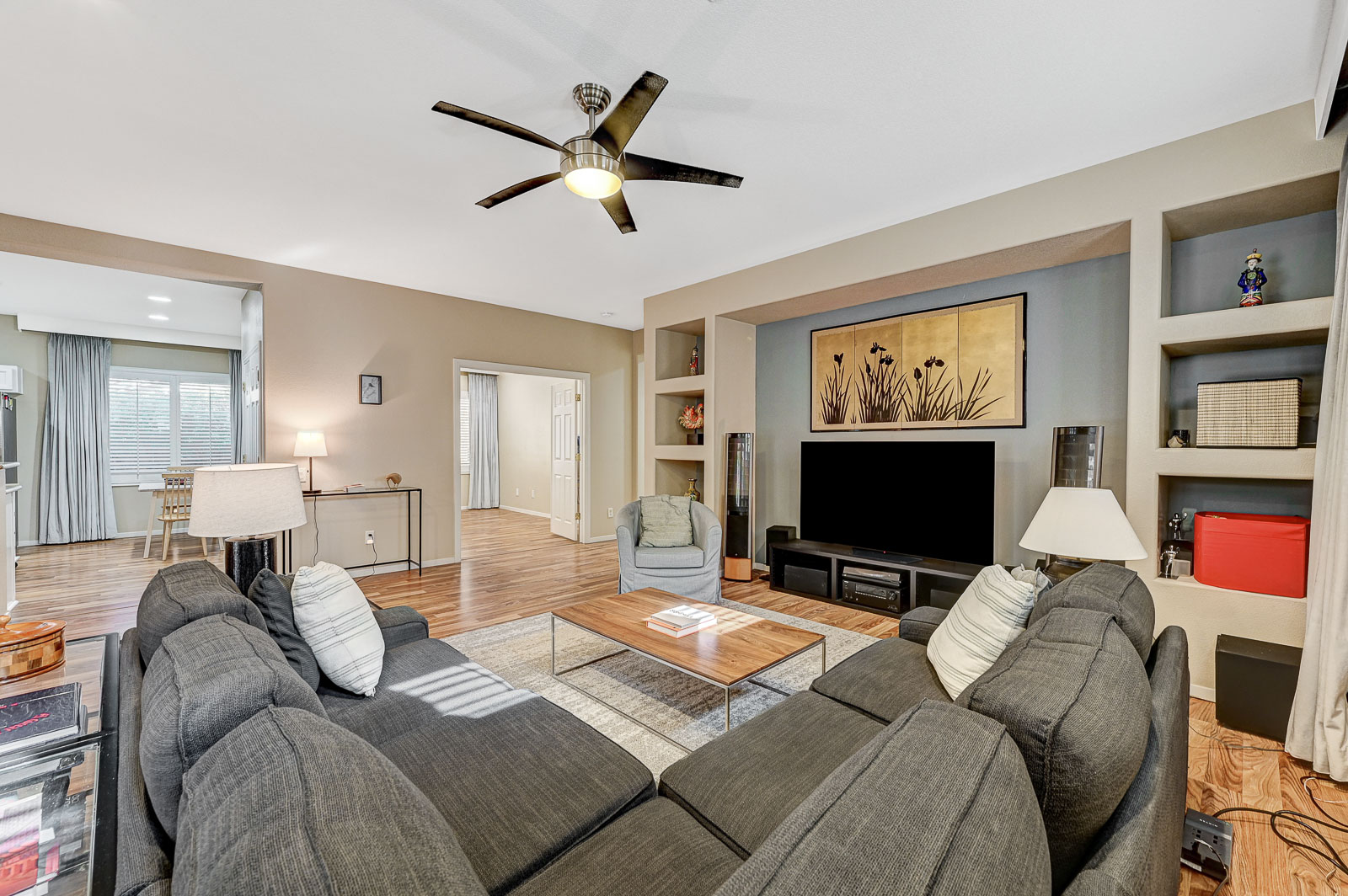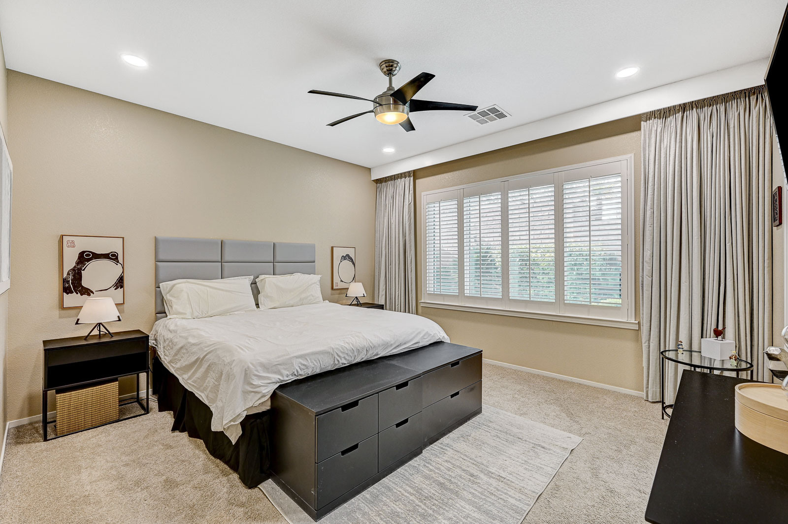 Plush carpeting and custom drapery add warmth to the bedrooms, and the bathrooms feature timeless tile finishes. Outdoors, the home opens to a private setting designed for relaxation with a covered patio, sparkling pool, tall privacy walls, and lush landscaping. A gated courtyard creates a charming entry, with Ridgebrook Park and highly rated Goolsby Elementary just a short distance away. Minutes from Downtown Summerlin shopping, dining, and parks, the home also includes a one-year warranty covering HVAC, water heater, pool pump, and major appliances.