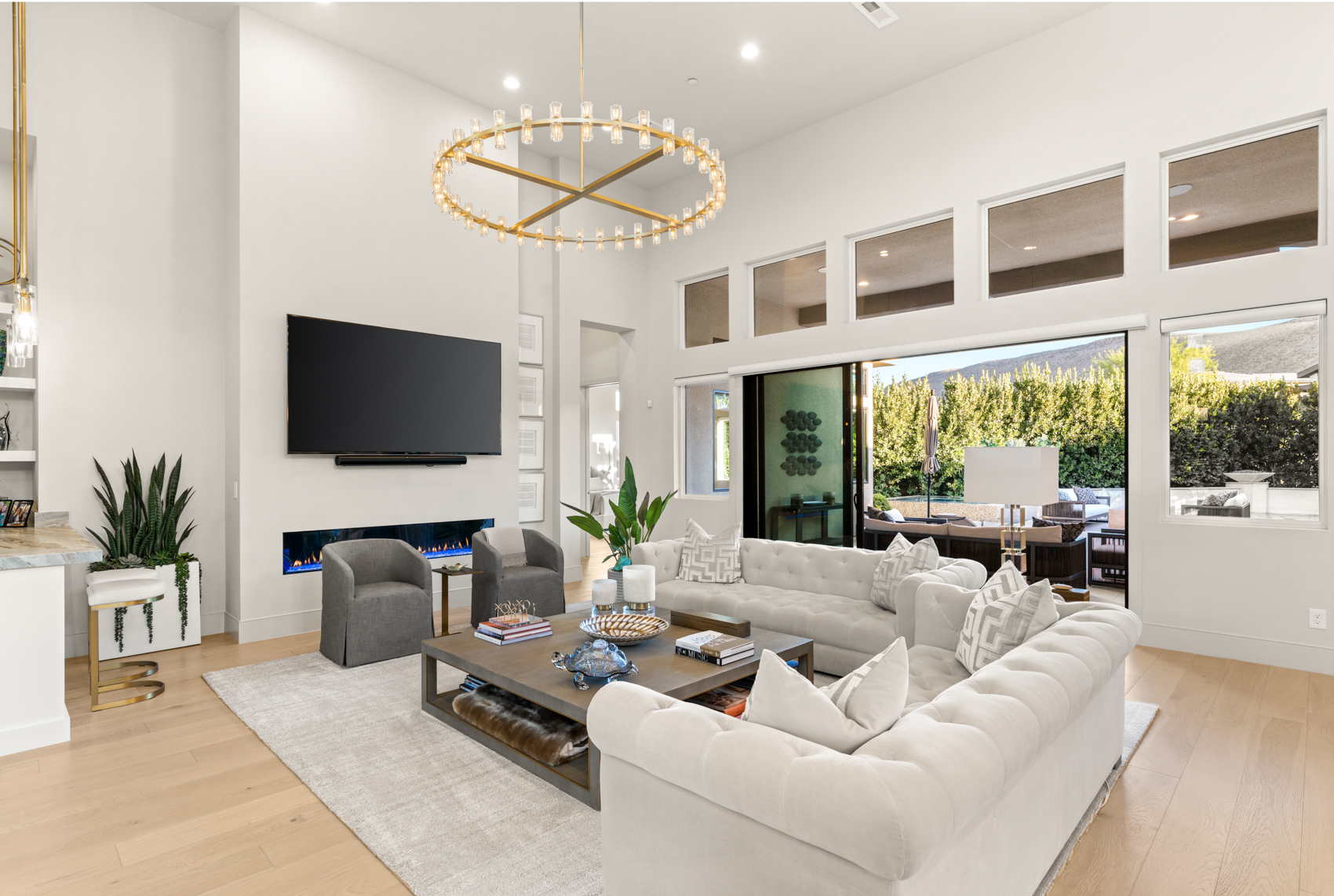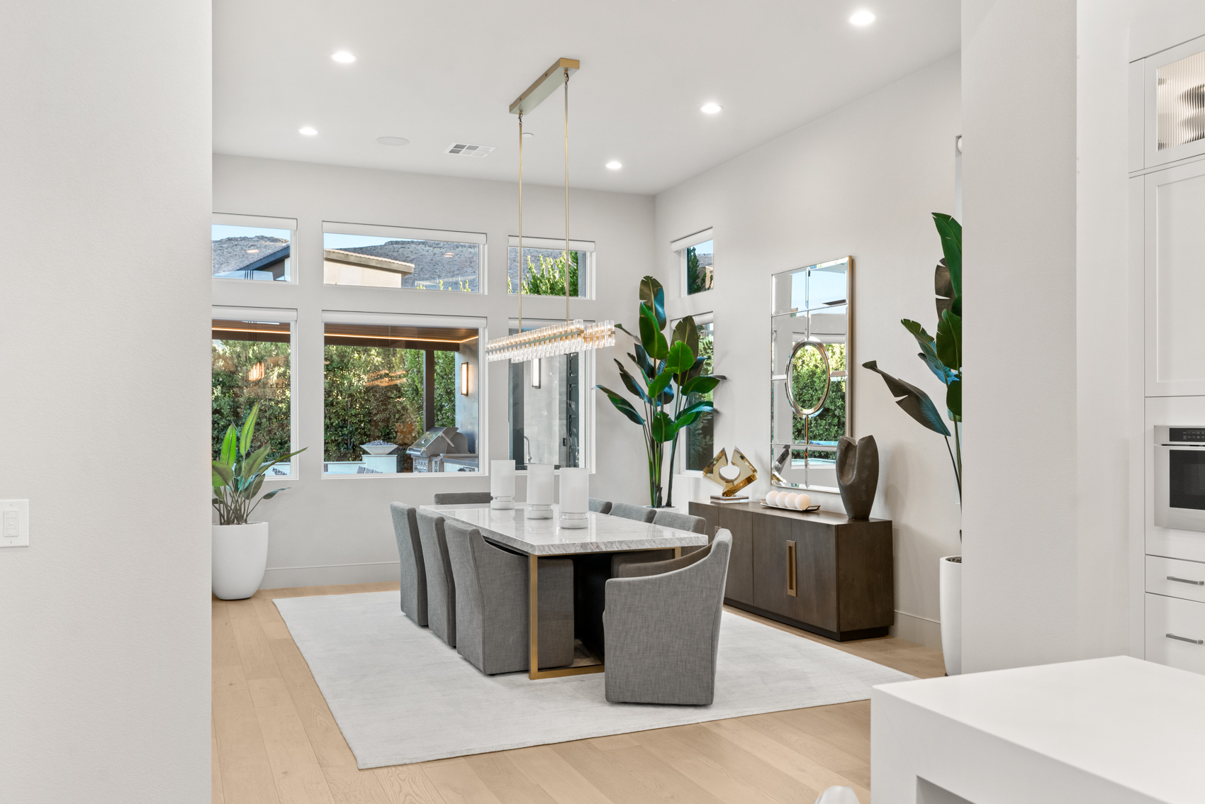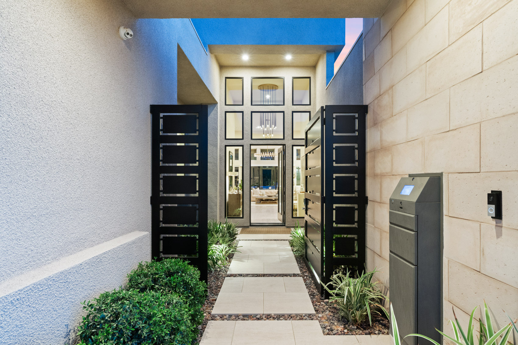 From the very first glance, this home makes a dramatic impression. The front has been custom designed with sculptural olive trees, sleek glass garage doors, porcelain pavers, and LED-lit floating steps that frame the approach to the entry. A custom iron gate provides privacy and security as you arrive at the front door, while the bold, clean architecture sets the tone for the refined luxury that continues throughout the home.