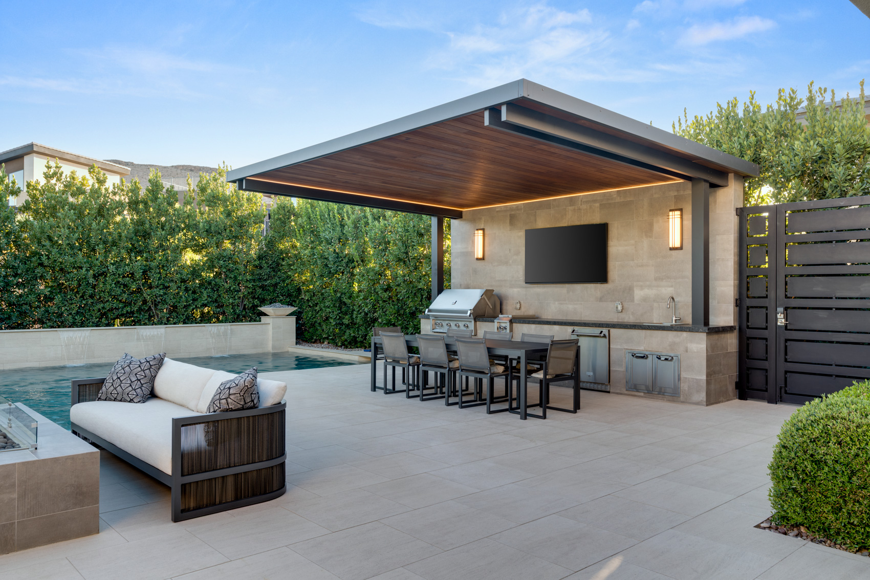 Inside, every inch of the 3,465-square-foot layout has been thoughtfully elevated. Engineered hardwood floors flow through open living spaces accentuated by soaring ceilings, Restoration Hardware lighting, and bespoke built-ins. The heart of the home is the stunning great room, where a sleek linear fireplace and a well-appointed bar invite elegant entertaining or cozy evenings in. A wall of sliding glass doors opens to the backyard, blurring the line between inside and out. The kitchen is both refined and functional, featuring custom cabinetry with glass door uppers and interior lighting, roll-out shelving, a Sub-Zero refrigerator, and a raised center island perfect for bar seating. The adjacent walk-in pantry has been fully built out for organization and display. Each of the homeās three bedrooms offers its own en suite bath, with elevated finishes such as frameless glass showers, tile extending to the ceiling, and designer fixtures. The oversized primary suite is a private retreat, complete with a fireplace, and a spa-like bathroom. Here, a large walk-in shower with floating bench, soaking tub, LED-lit mirrors, and extra cabinetry exudes comfort and style. The closet is fully customized with boutique-style floor-to-ceiling built-ins, creating a space that feels like a private dressing room. Smart home automation controls lighting, audio, climate, and security with ease. Indoor/outdoor surround sound, motorized blinds, and integrated systems ensure a seamless, modern lifestyle. But itās the backyard that truly sets this home apartāa lush, private sanctuary designed for unforgettable gatherings or peaceful relaxation. Lined with mature Bay Laurel trees for total seclusion, the yard features a sparkling custom pool and spa, multiple water and fire features, and two dedicated fire pit lounge areas. The cantilevered patio cover is lined with LED lighting and shelters a premium outdoor kitchen, complete with a chef's grade "Hestan" grill, refrigerator, sink, and pull-out storage. The porcelain pavers and professional landscaping continue from the front yard to the back, unifying the homeās sleek, high-end aesthetic. This rare lotālarger than most in Mesa Ridgeāoffers the potential to expand with a guest house, sport court, or garden retreat, making it as versatile as it is beautiful. The garage includes added built-in cabinetry, epoxy floors, a water softener, and central vacuum system for daily convenience. Set within Summerlinās exclusive Mesa Ridge enclave by Toll Brothers, residents enjoy 24-hour guard-gated security, access to a private clubhouse, fitness center, resort-style pool, and close proximity to top-rated schools, shopping, hiking trails, and the natural beauty of Mesa Park and Red Rock Canyon. Homes of this caliberāwith such extensive upgrades, architectural harmony, and a premier lotārarely come to market. 10941 White Clay Drive is not just a home, but a lifestyle opportunity: private, polished, and perfectly poised in one of Las Vegasā most prestigious communities.