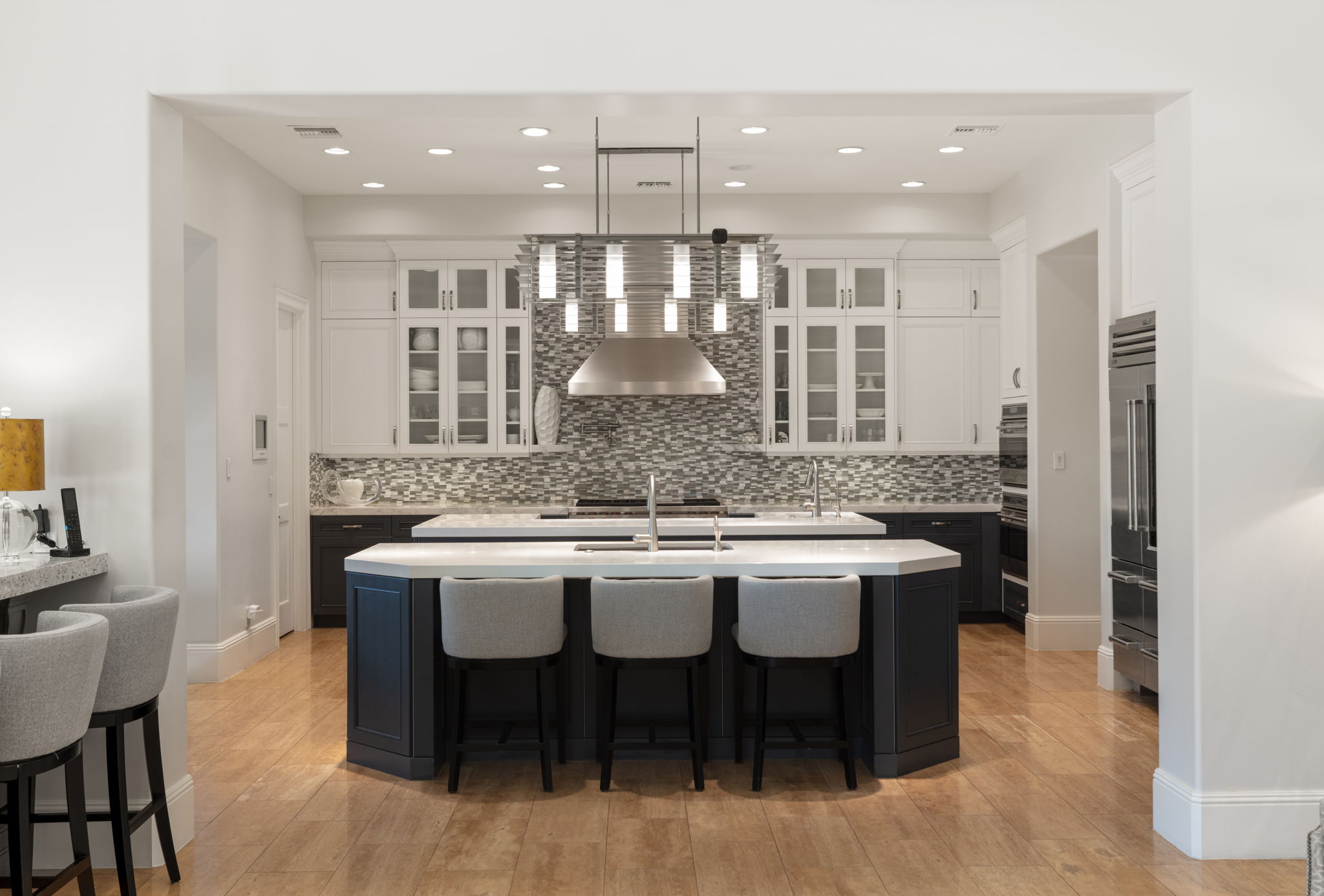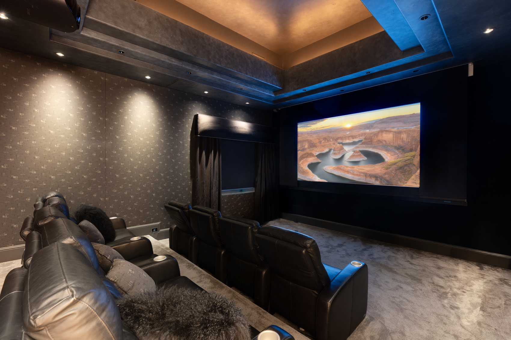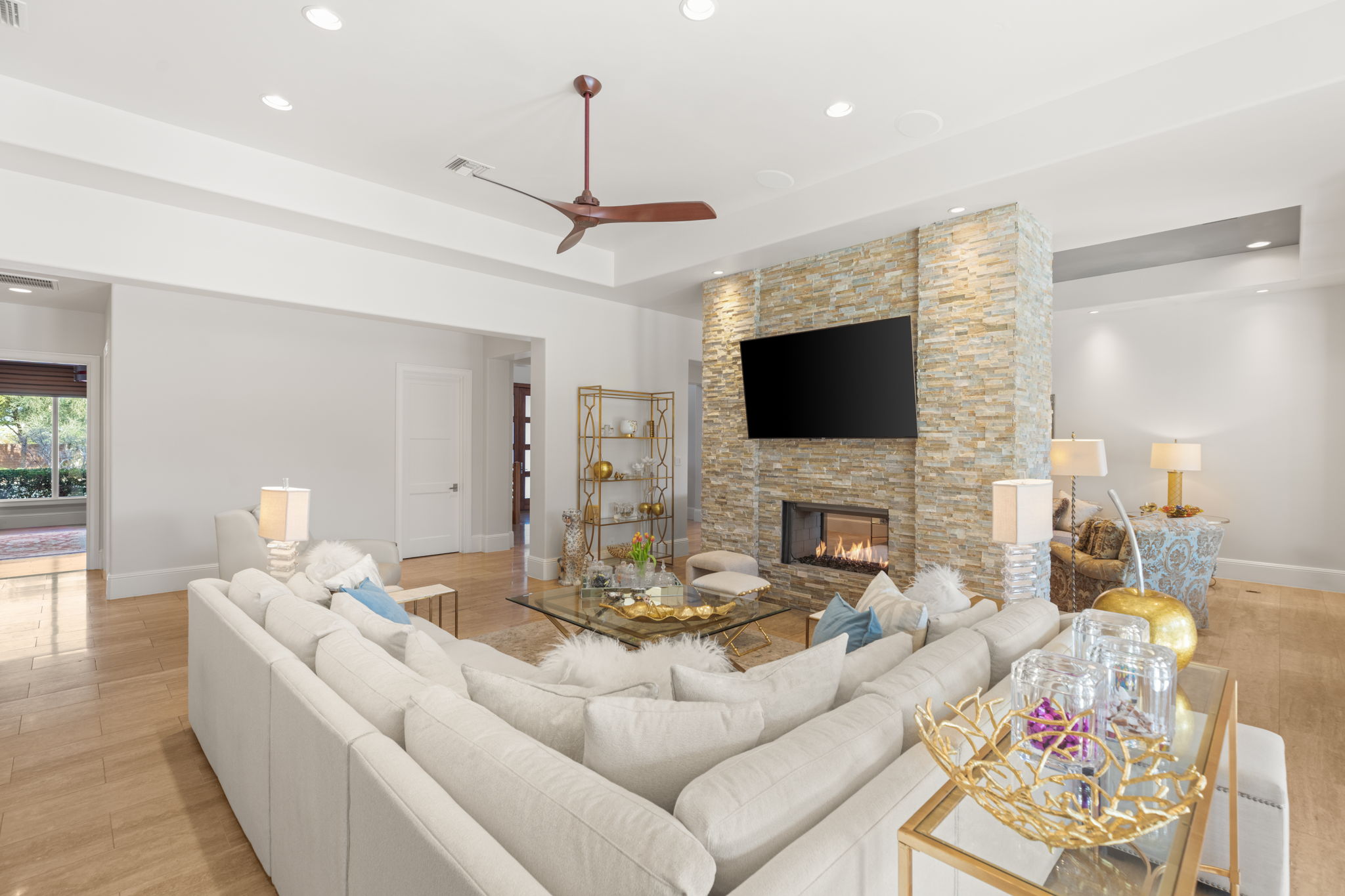 The main level is anchored by a spacious primary suite, offering a true retreat with its own fireplace, wet bar, and a spa-inspired bathroom featuring a large soaking tub, walk-in steam shower, dual separate vanities, towel-warming drawers and two expansive custom closets filled with natural light. On the main level are a grand formal living room with fireplace, an executive office with custom built-ins and fireplace, a temperature-controlled wine room, and a dedicated theater room.