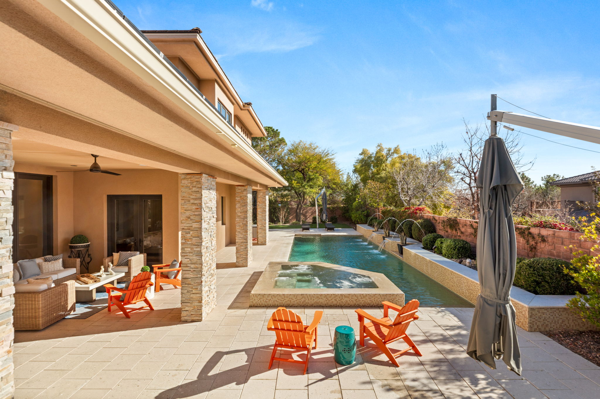 At the heart of the home, the chefās kitchen is designed to impress with two oversized islands, each with its own sink, Wolf/Sub-Zero stainless-steel appliances, and a large walk-in pantry with custom built-ins. The kitchen flows seamlessly into a separate breakfast nook and a formal dining room highlighted by a fireplace and built-in storage cabinetry, making it ideal for both intimate dinners and large-scale gatherings. The upper level offers a secondary primary suite along with additional guest bedrooms, all en-suite, some with private balconies that capture serene views and desert skies. This flexible layout provides comfort and privacy for family and guests alike. Outdoor living is equally compelling, with a large covered patio complete with a full built-in outdoor kitchen, perfect for year-round entertaining. The private backyard showcases a resort-style pool with water features, a spa, and ample space to relax or host gatherings, all framed by mature landscaping and raised garden beds. Completing the home is a four-car garage, a new Crestron smart home system, solar, and updated security system. Offering five bedrooms and eight bathrooms in one of Summerlinās most exclusive communities, 11 Misty Peaks Court represents a rare opportunity to own a custom luxury residence in The Ridges on a private and serene cul-de-sac.