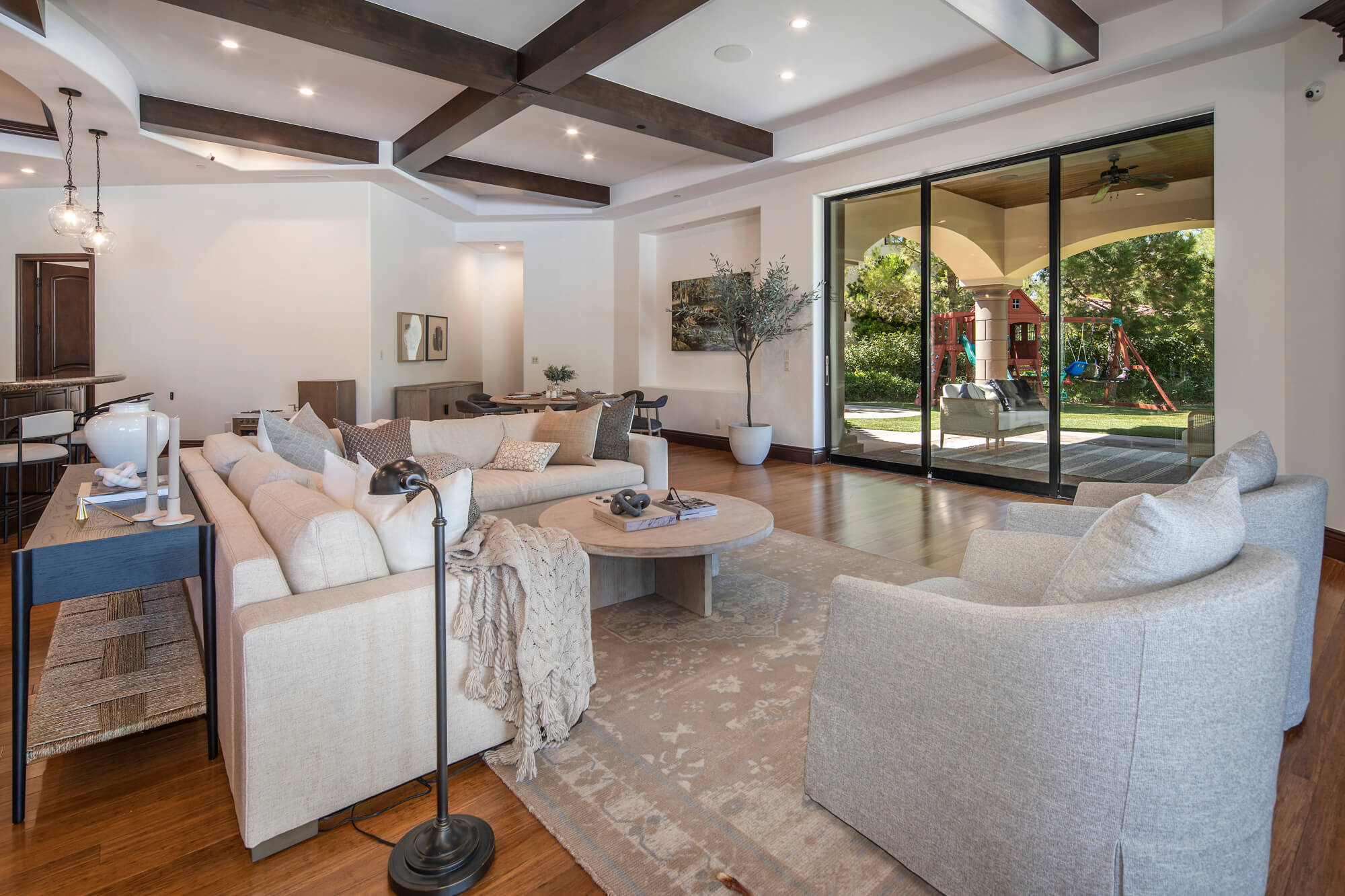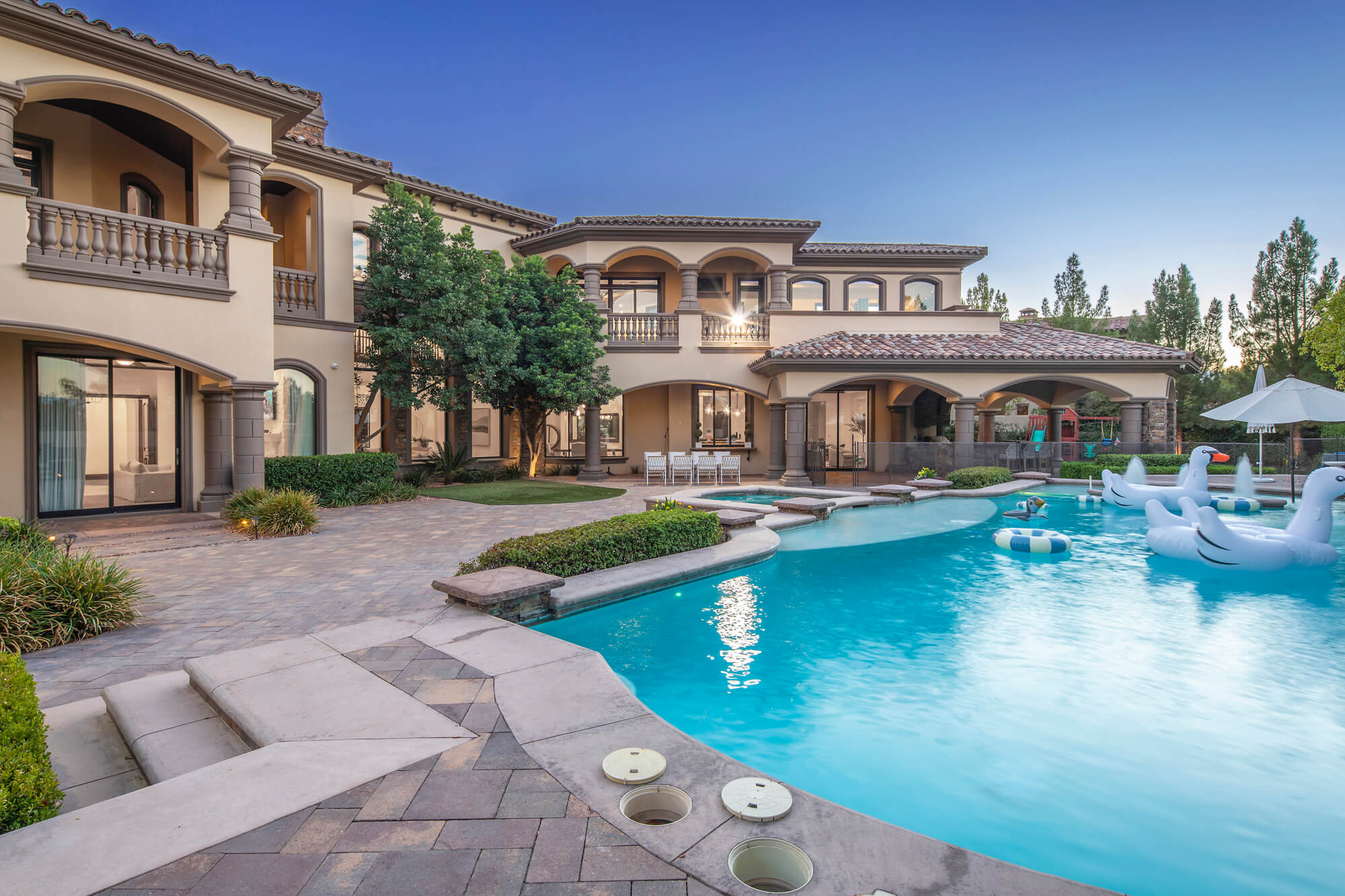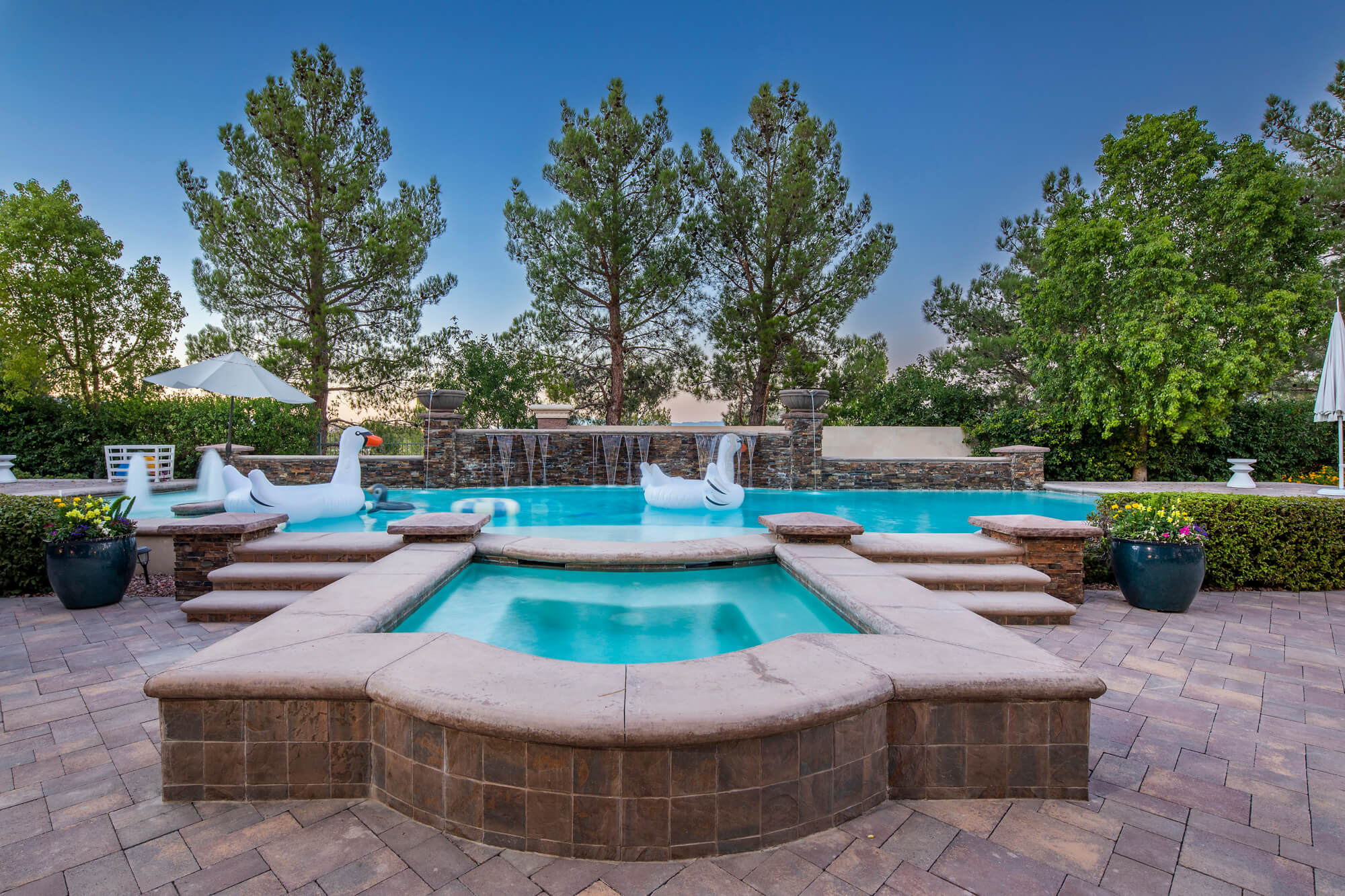 A chic two-story custom five-bedroom estate in the Southern Highlands Golf Club features not only an open-plan interior with dual primary bedrooms on the main level but a backyard oasis that boasts a classic pool and spa with fountains and waterfalls, in addition to an outdoor basketball half-court.