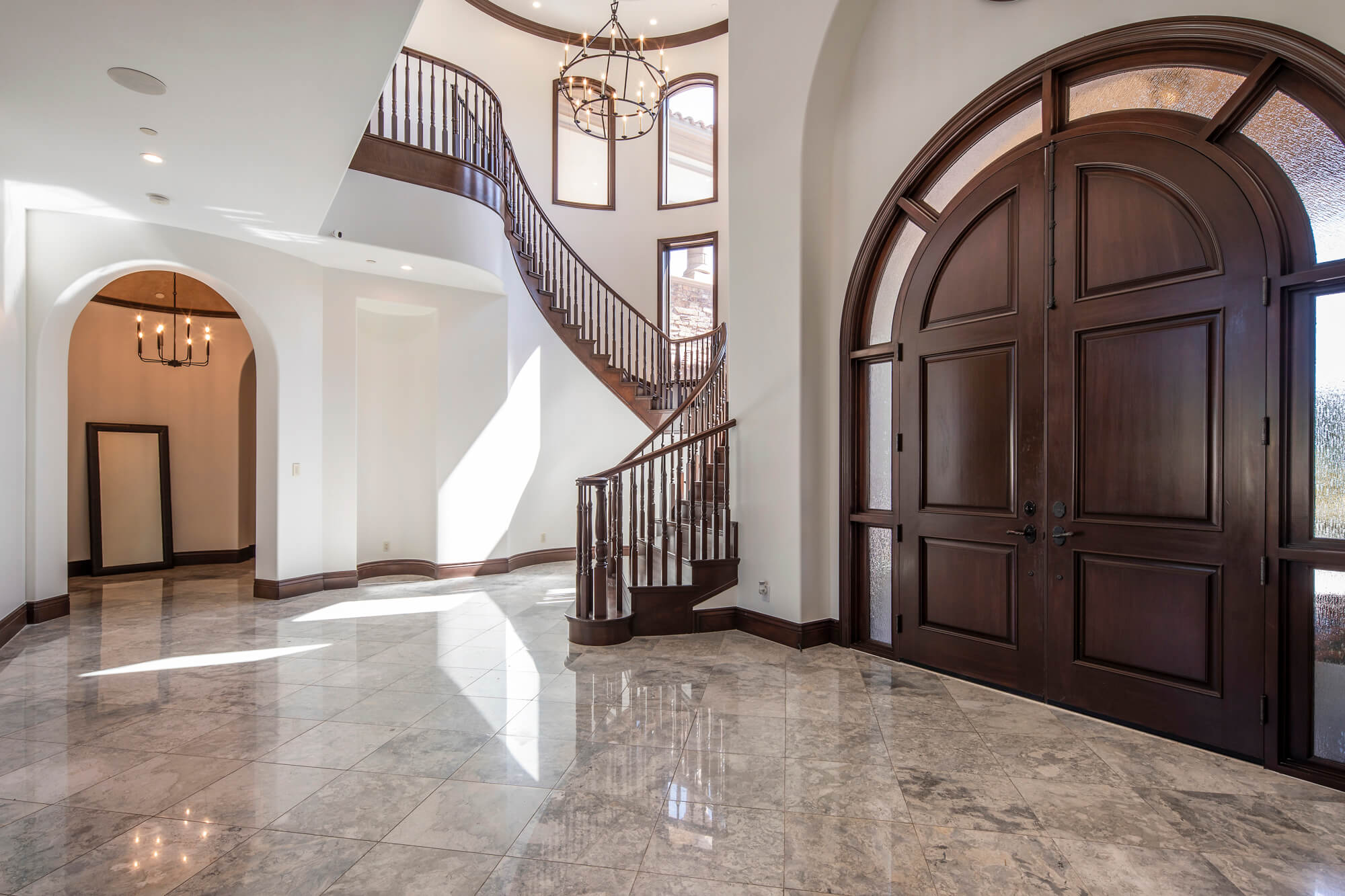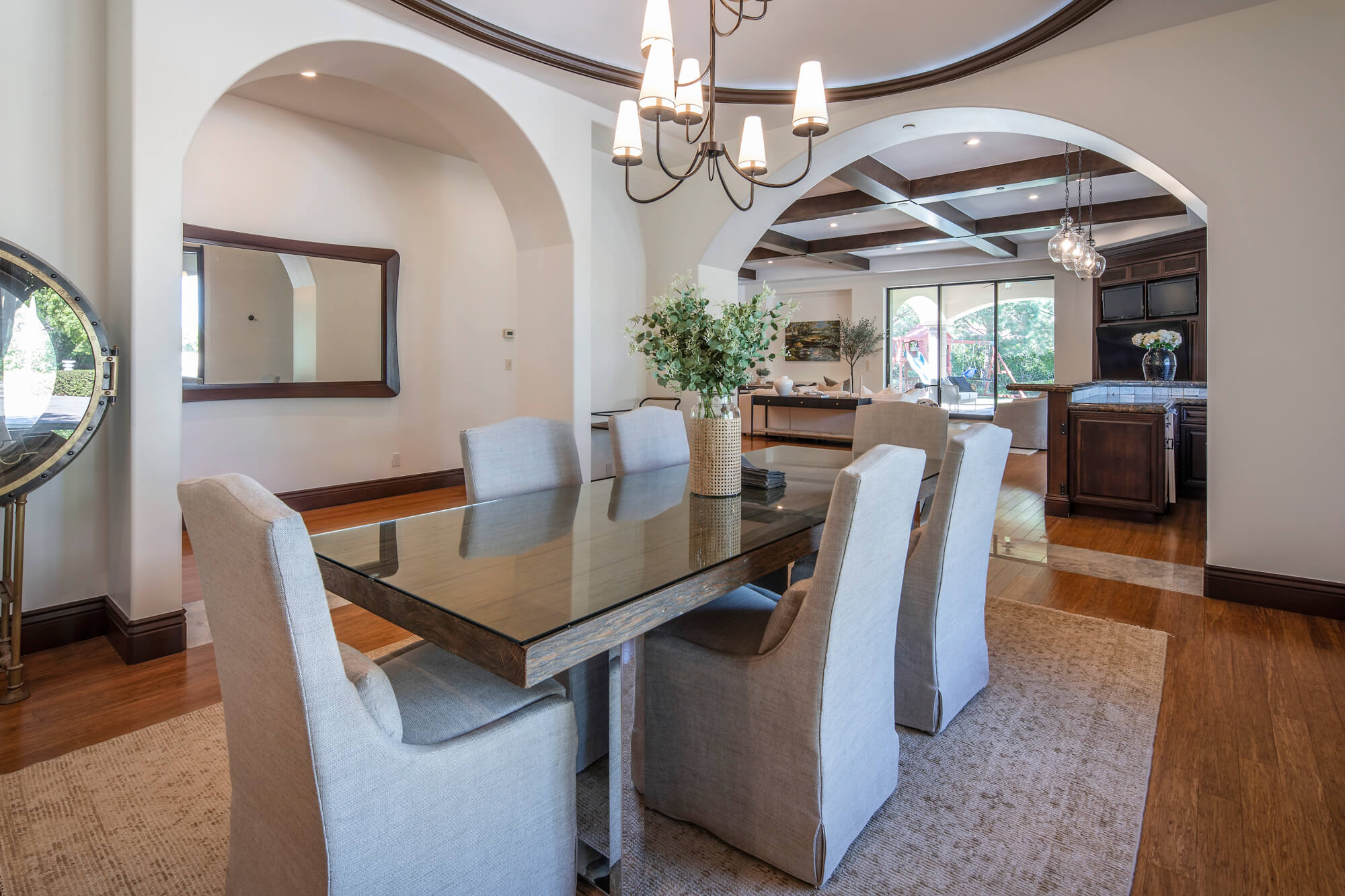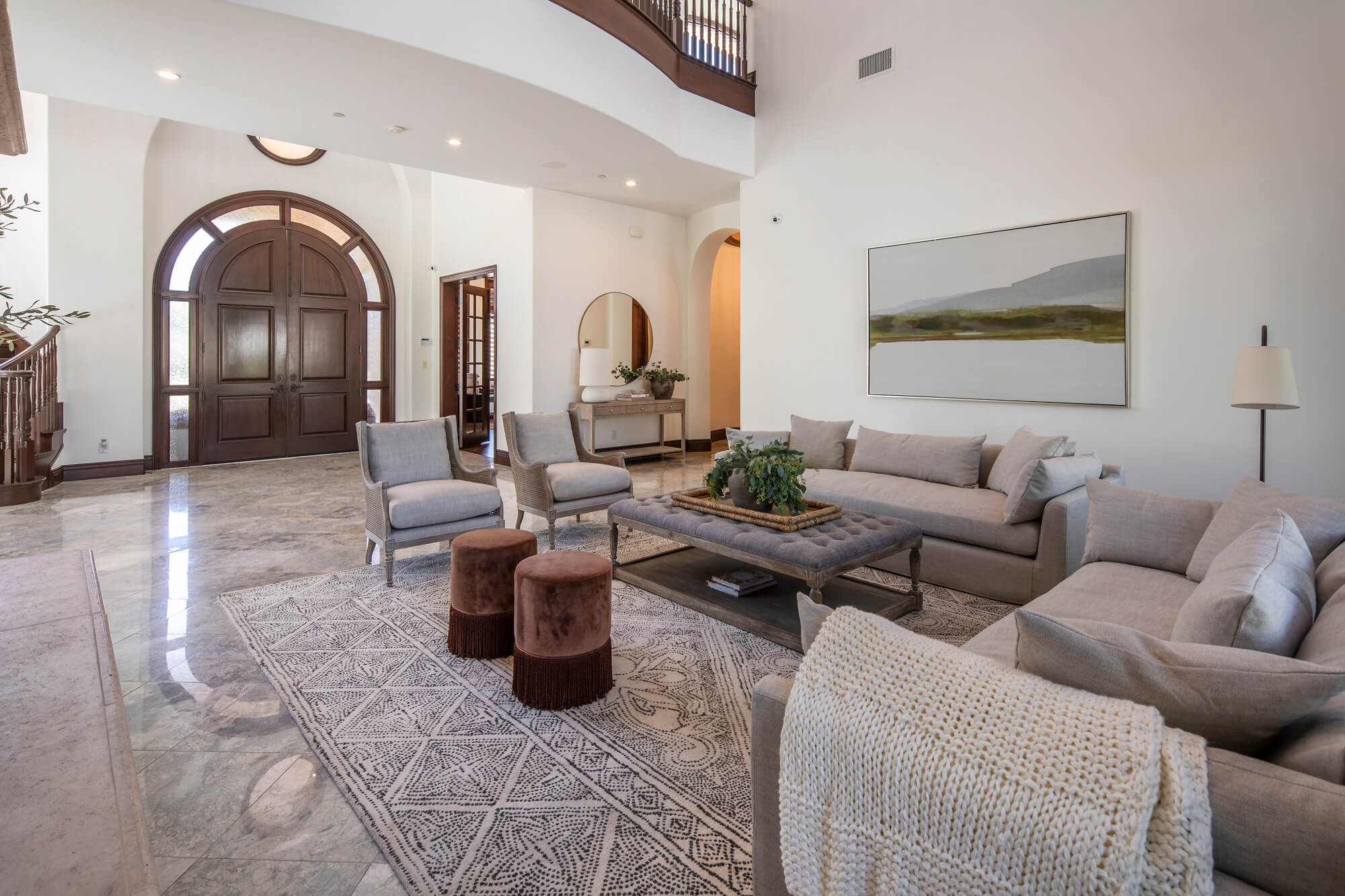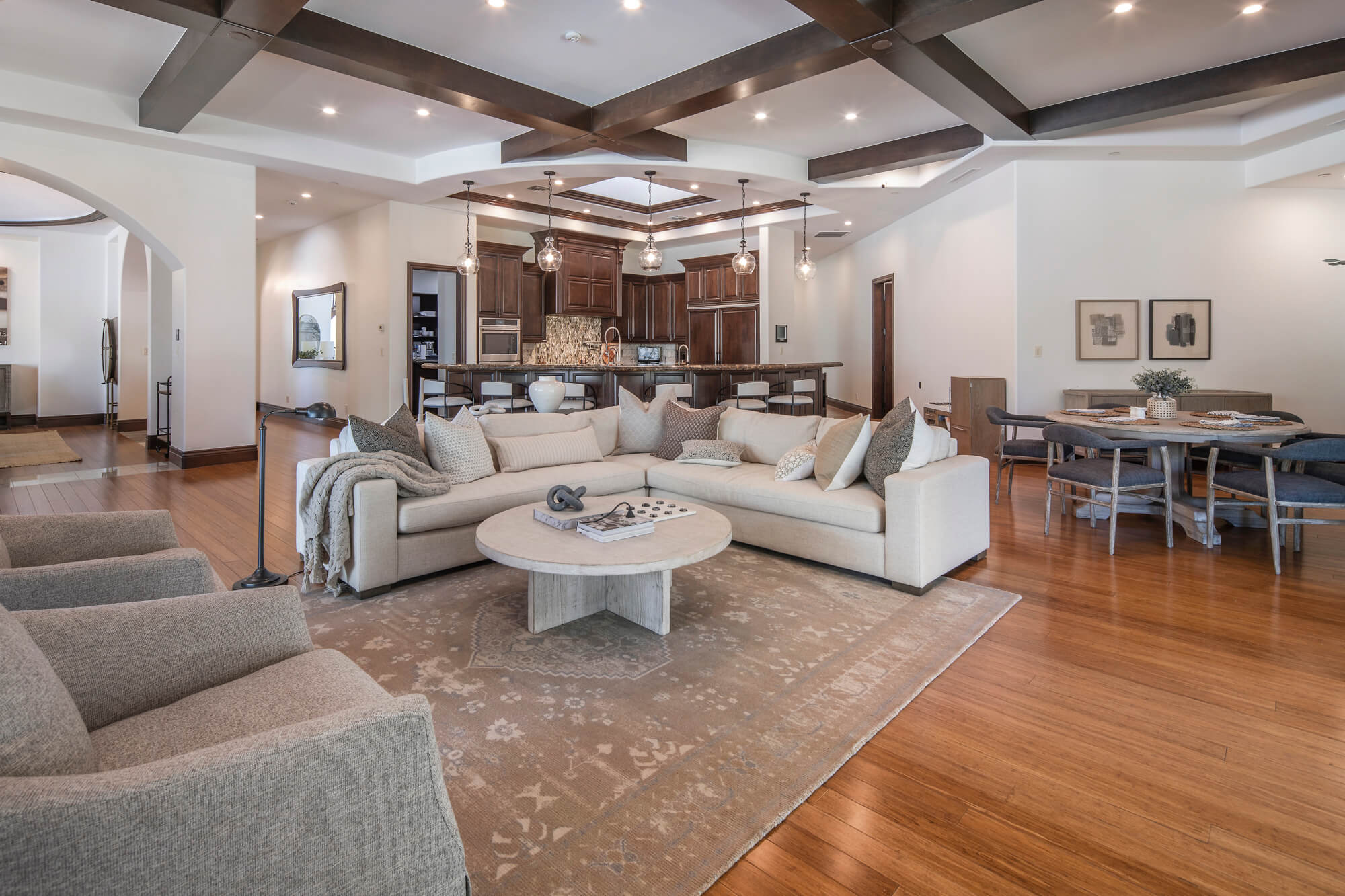 A chic two-story custom five-bedroom estate in the Southern Highlands Golf Club features not only an open-plan interior with dual primary bedrooms on the main level but a backyard oasis that boasts a classic pool and spa with fountains and waterfalls, in addition to an outdoor basketball half-court.