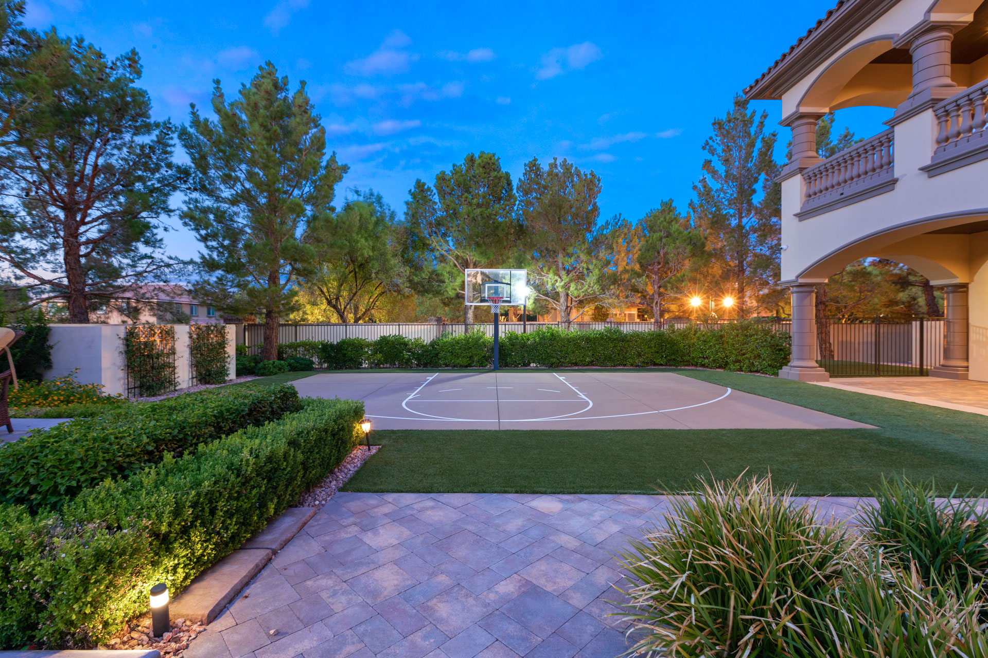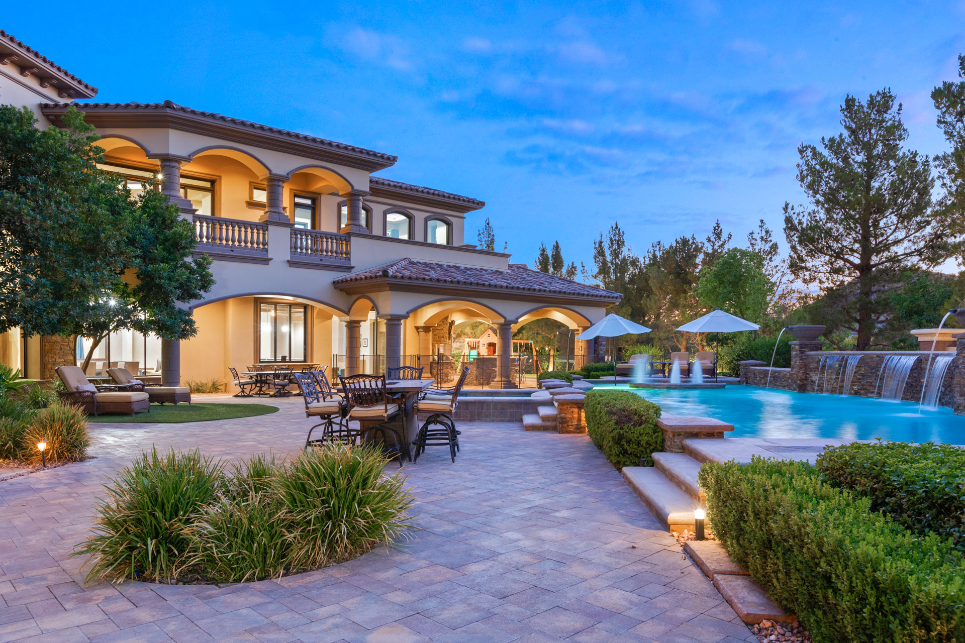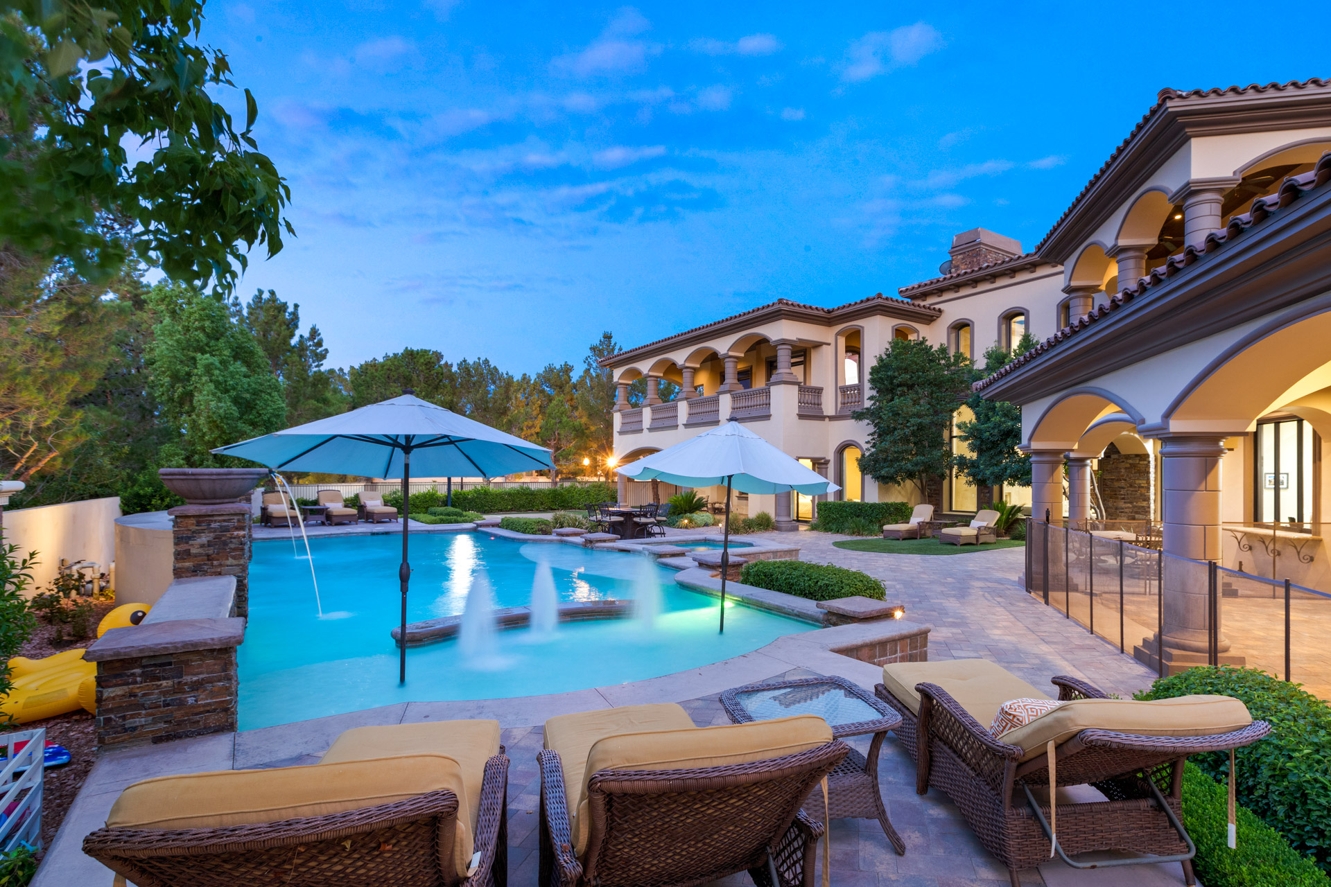 A two-story Tuscan custom five-bedroom estate in the Southern Highlands Golf Club features not only an open-plan interior with dual primary bedrooms on the main level but a magnificent backyard oasis that boasts a classic pool and spa with integrated fountains and waterfalls, in addition to an outdoor basketball half-court.