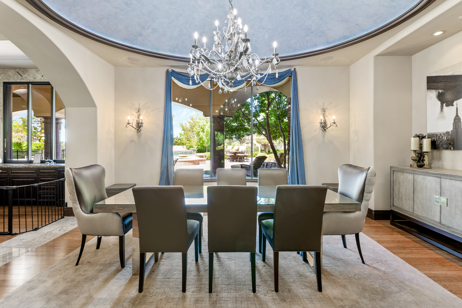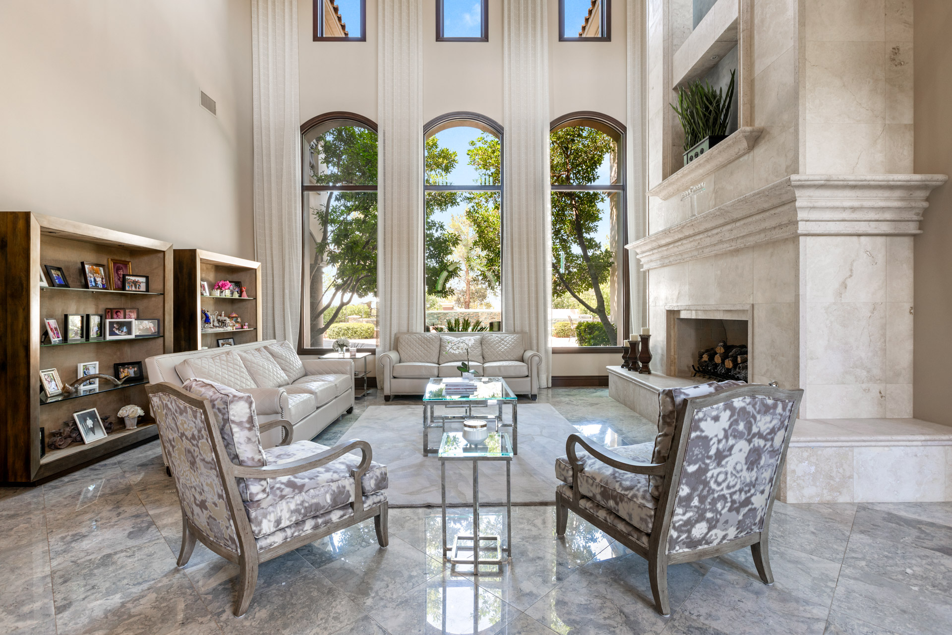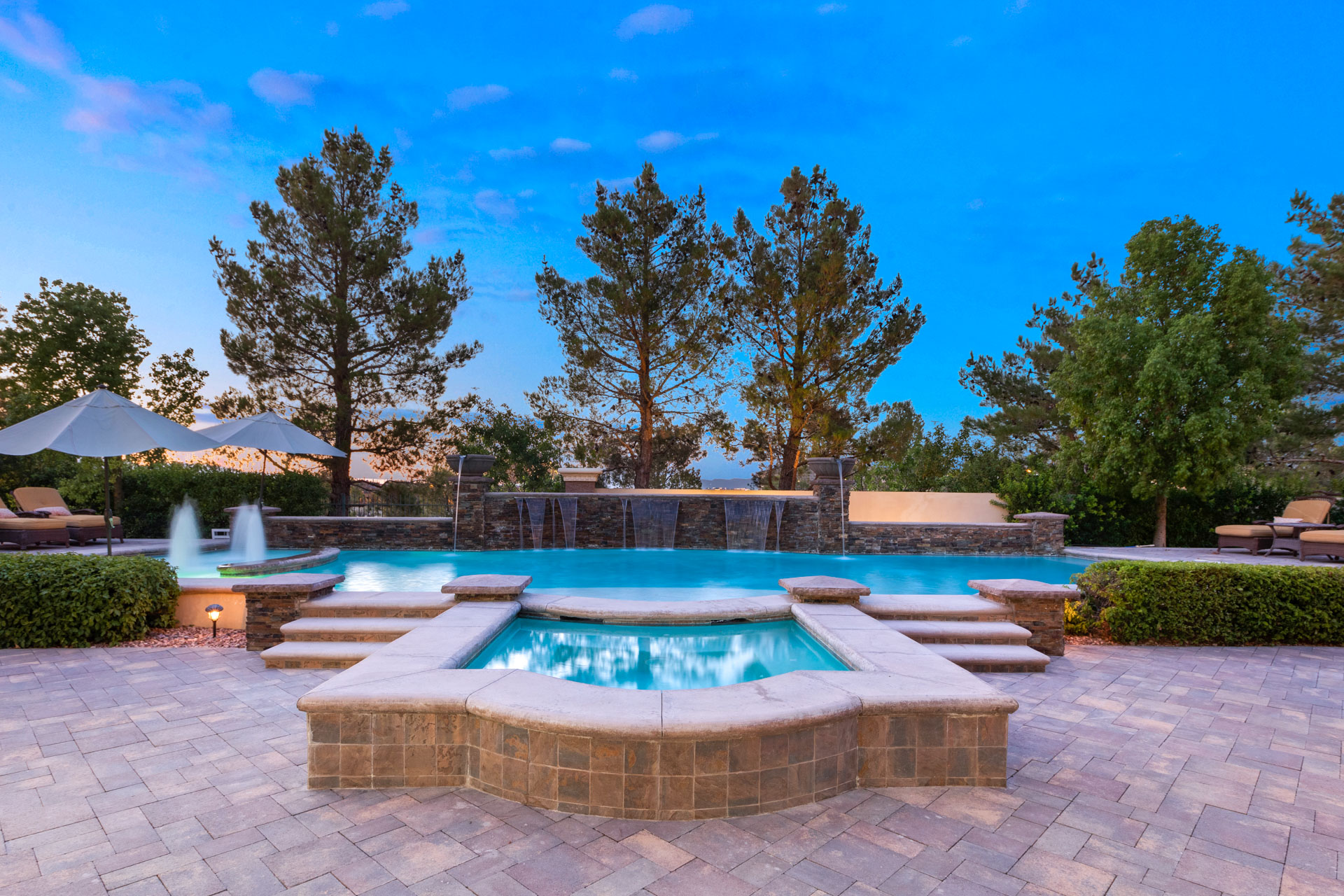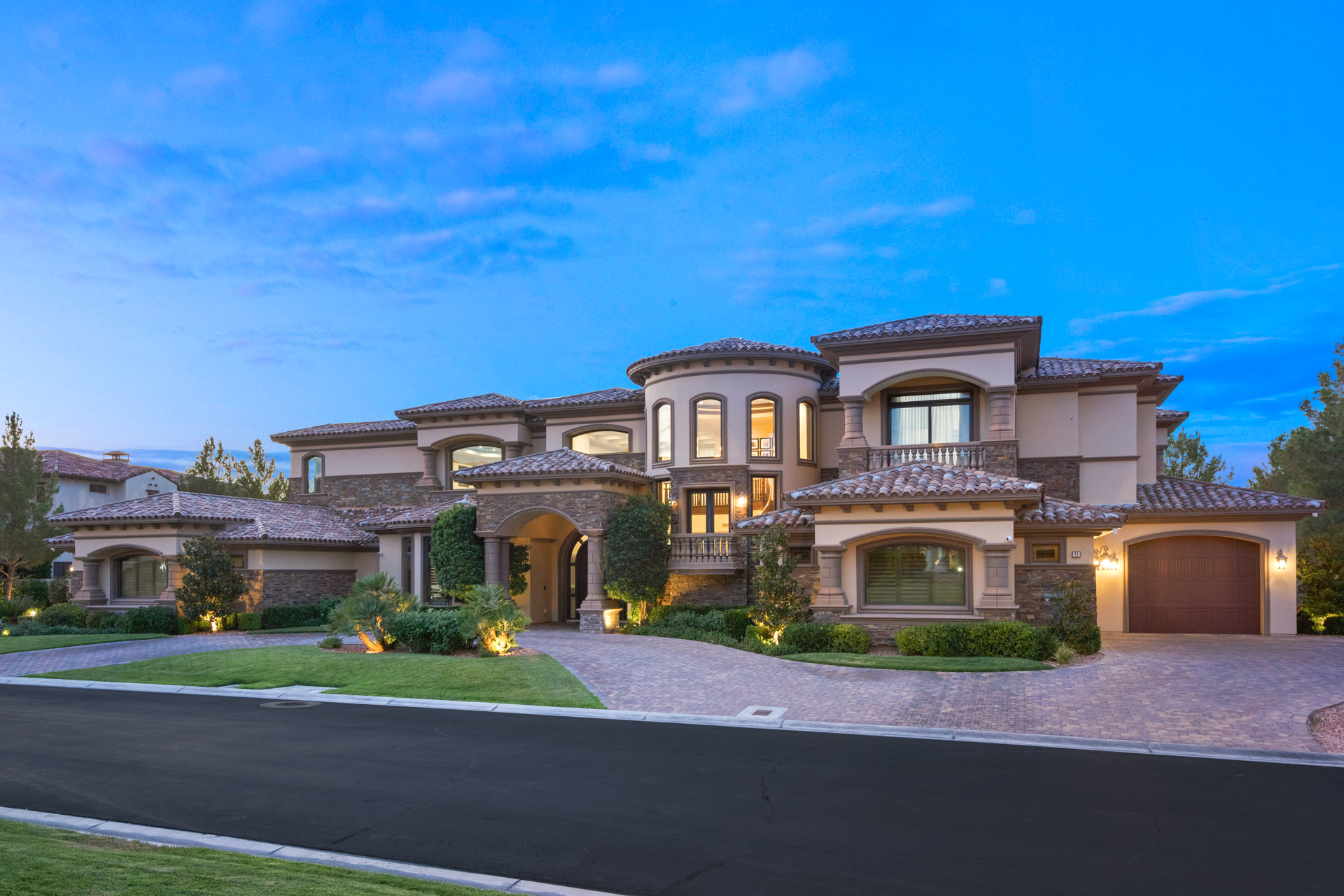 A two-story Tuscan custom five-bedroom estate in the Southern Highlands Golf Club features not only an open-plan interior with dual primary bedrooms on the main level but a magnificent backyard oasis that boasts a classic pool and spa with integrated fountains and waterfalls, in addition to an outdoor basketball half-court.