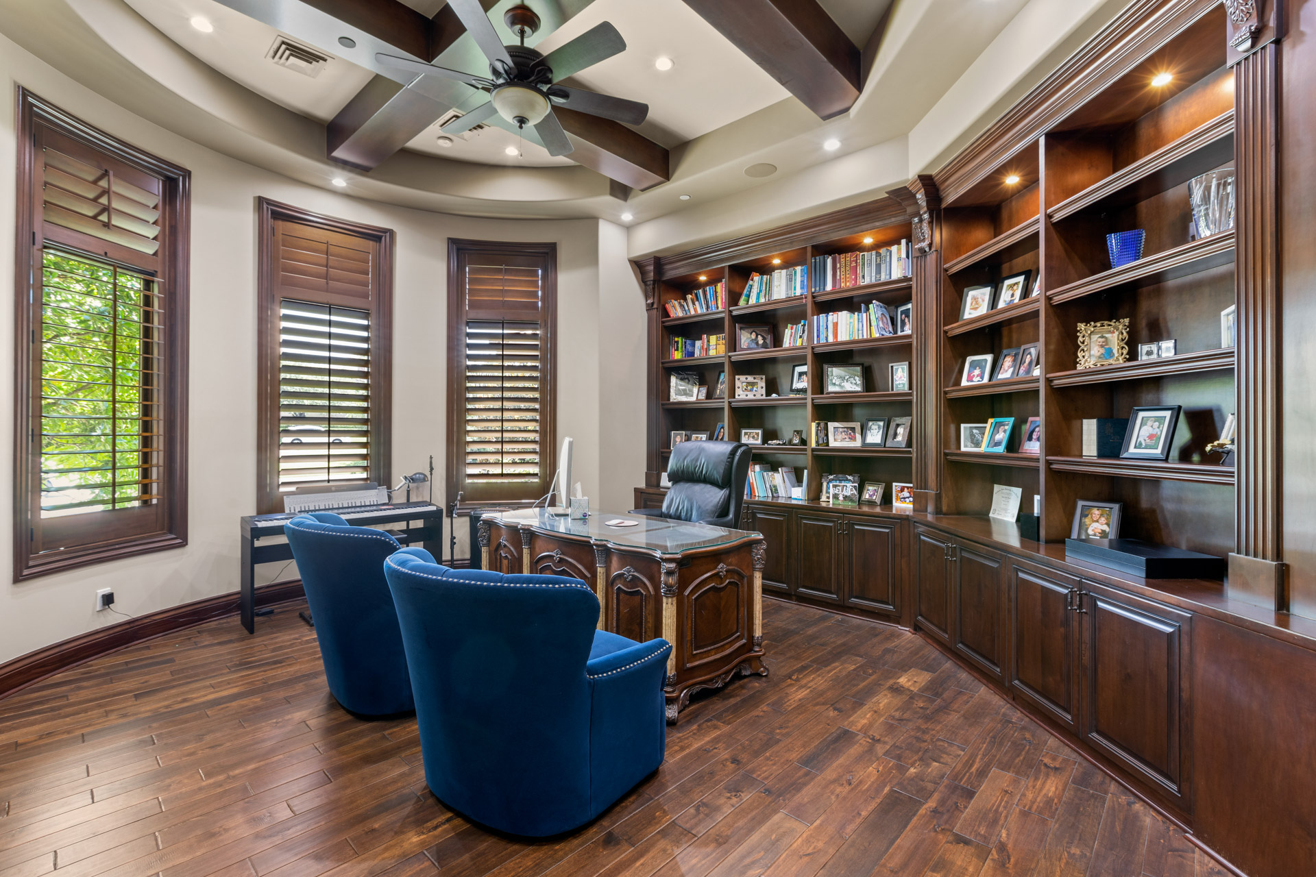 There are five bedrooms, eight baths, a dedicated office with custom built-ins, a comfortable second-floor den with a wet bar and a wall of built-in cabinets and bookshelves, an exercise room and a massive fireplace in the two-story living room. Fine hardwood floors are featured in some rooms, while others feature polished marble and smooth slate flooring, dramatic painted, coved or boxed ceiling treatments, artistic lighting fixtures and polished wood accents. A massive arched double-door entry graces the foyer with its beautiful, curved staircase leading to the home's upper level. Multiple balconies capture views from the home's second floor, while expansive outdoor spaces on the main level are complemented by mature landscaping and arched colonnades designed to accommodate large gatherings. This is a home that emphasizes architectural elegance and quality of life above all, with interior and exterior spaces that can be highly personalized to offer the ultimate comfort for a discerning buyer.