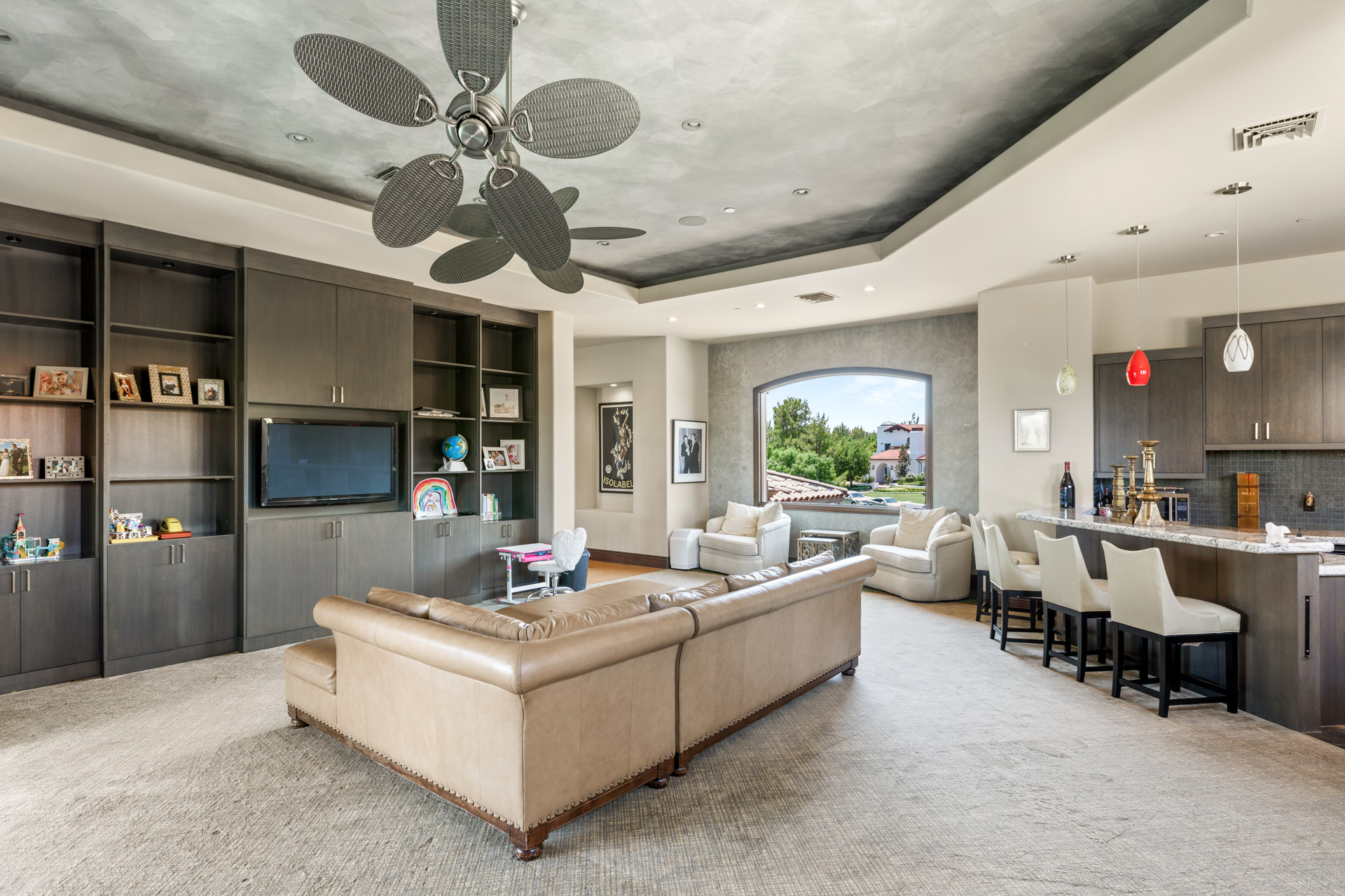 Spectacular features of this distinctive home are found in its soaring light-filled interiors, indoor and outdoor kitchens that both feature wraparound eating bars to seat a crowd, both upstairs and downstairs wet bars, and numerous special-purpose rooms in its more than 10,000 square feet of beautifully finished interior space.