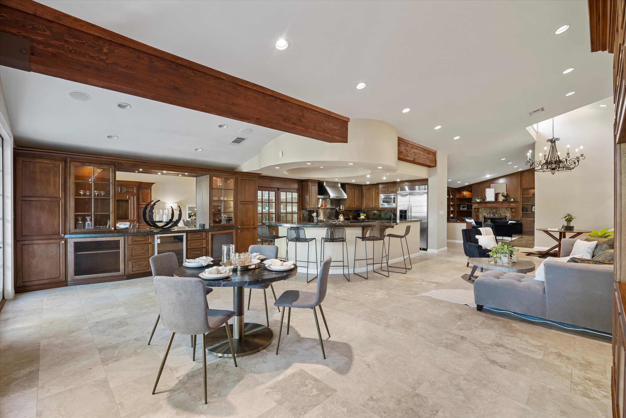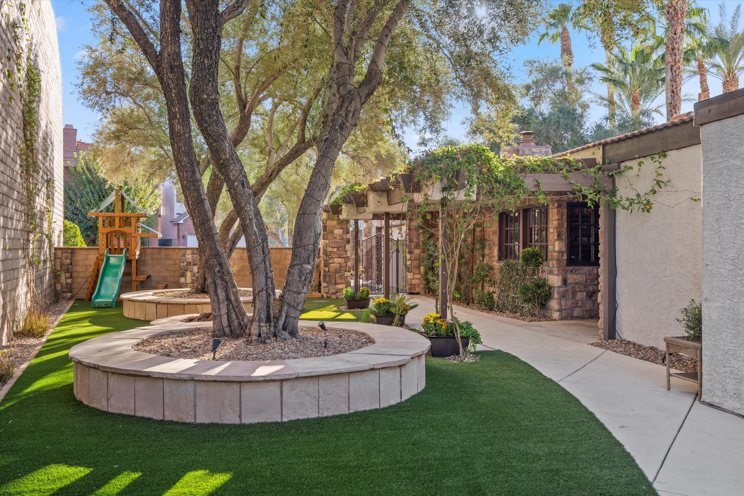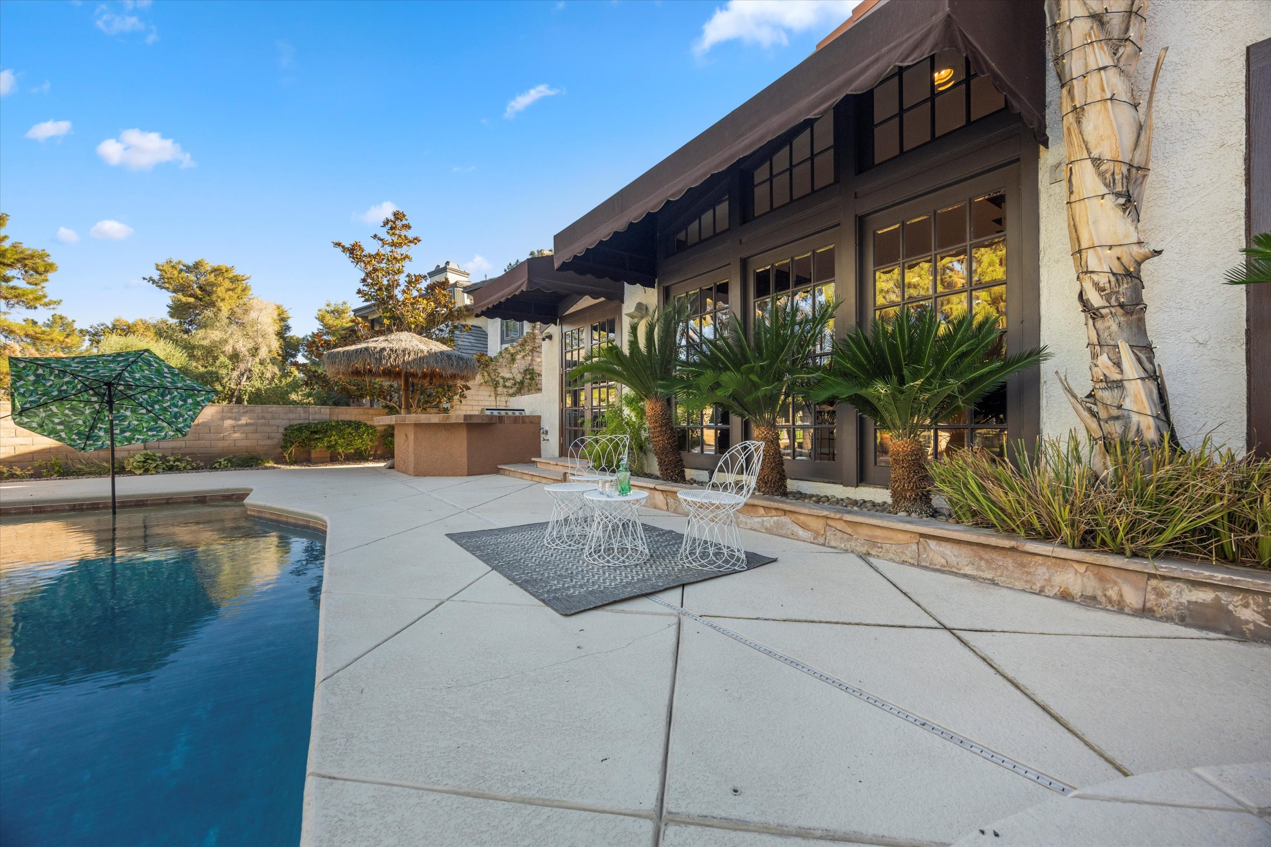 Outdoors, your private paradise awaits. Enjoy breathtaking views of the golf course while entertaining guests at your built-in BBQ & bar. Dive into the sparkling pool or unwind in the soothing private spa with a waterfall feature. The expansive side yard offers a covered patio & mature trees, providing ample shade for those warm Las Vegas days. With exquisite finishes throughout, this property is a rare gem that epitomizes sophisticated living.