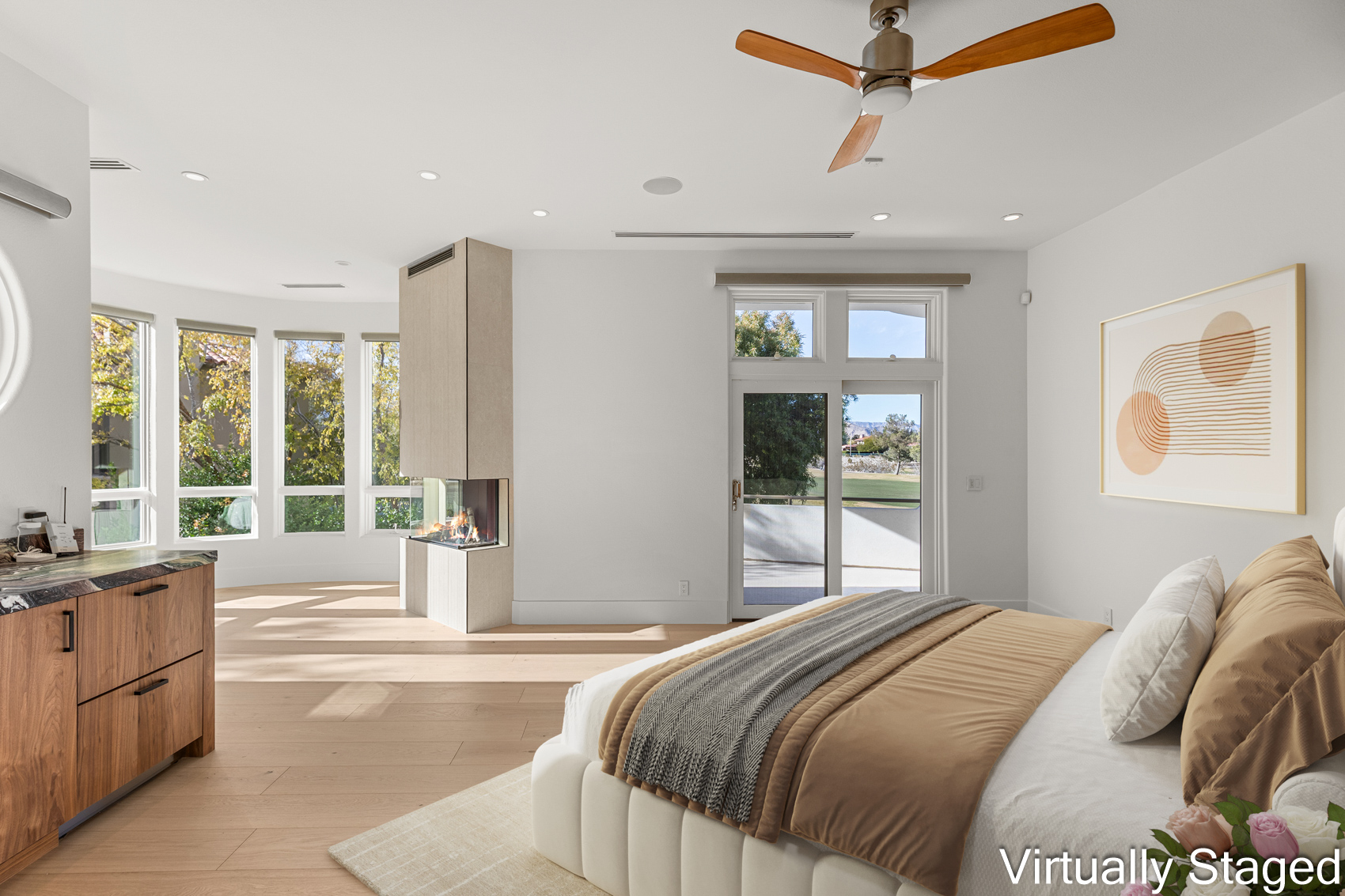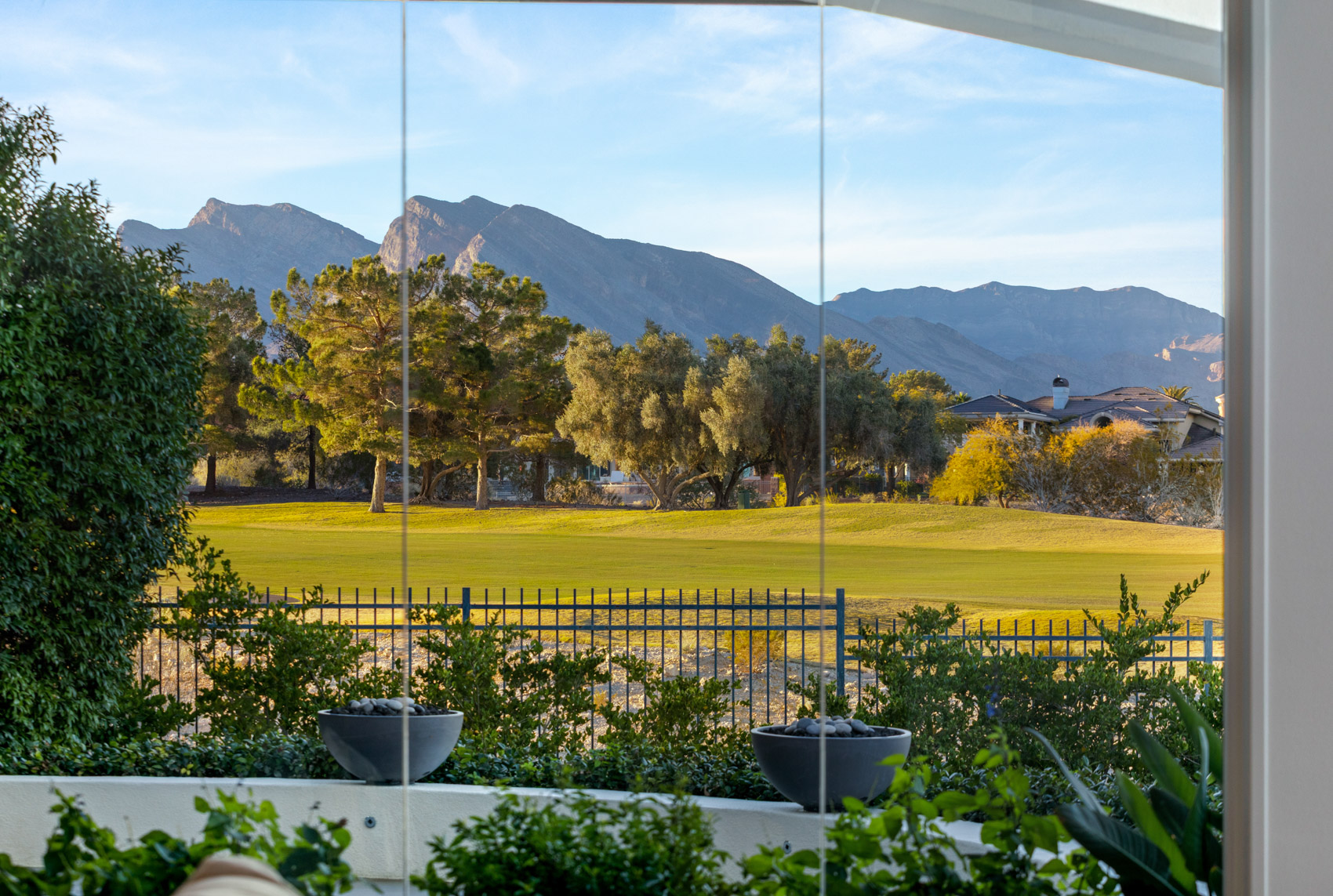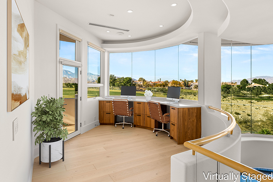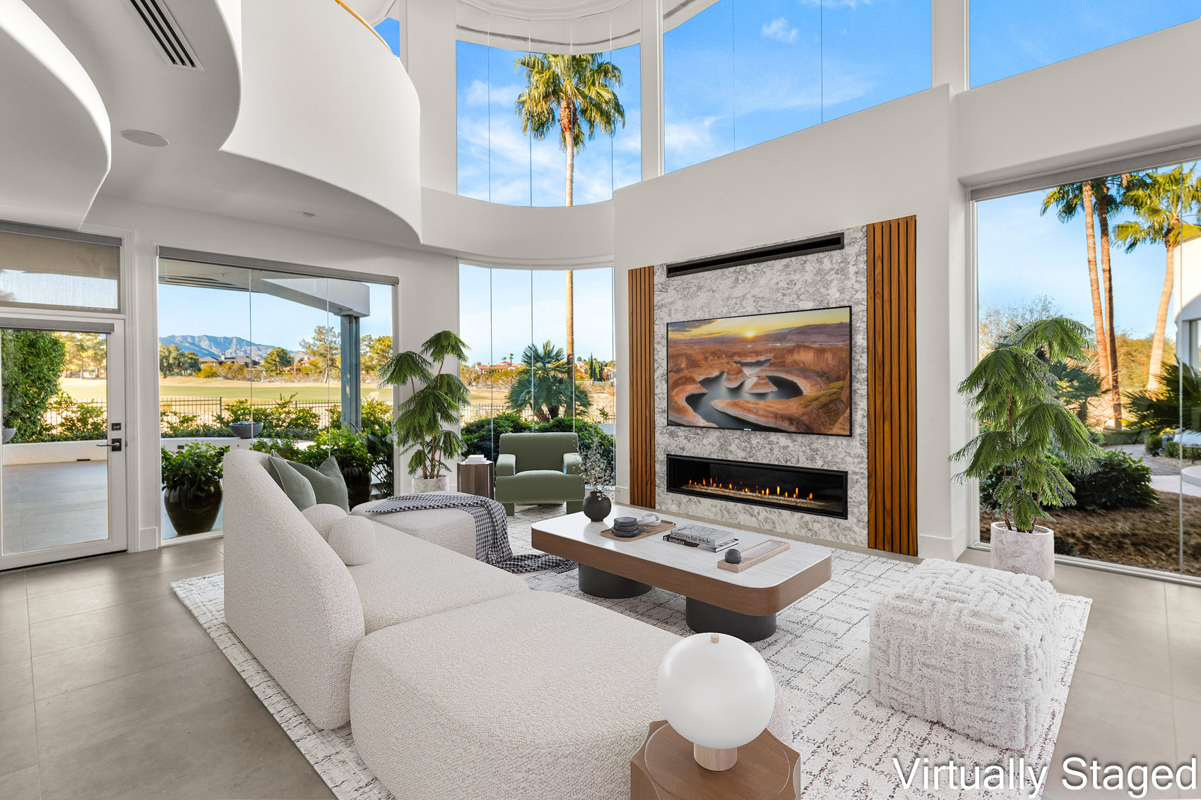 A dramatic entry welcomes you with soaring ceilings and towering picture windows framing unobstructed vistas of a double fairway and the surrounding mountain ridges. Natural light floods the expansive great room, where refined finishes, sculptural lighting, and effortless indoor-outdoor flow make the space equally suited for grand entertaining or serene everyday living.