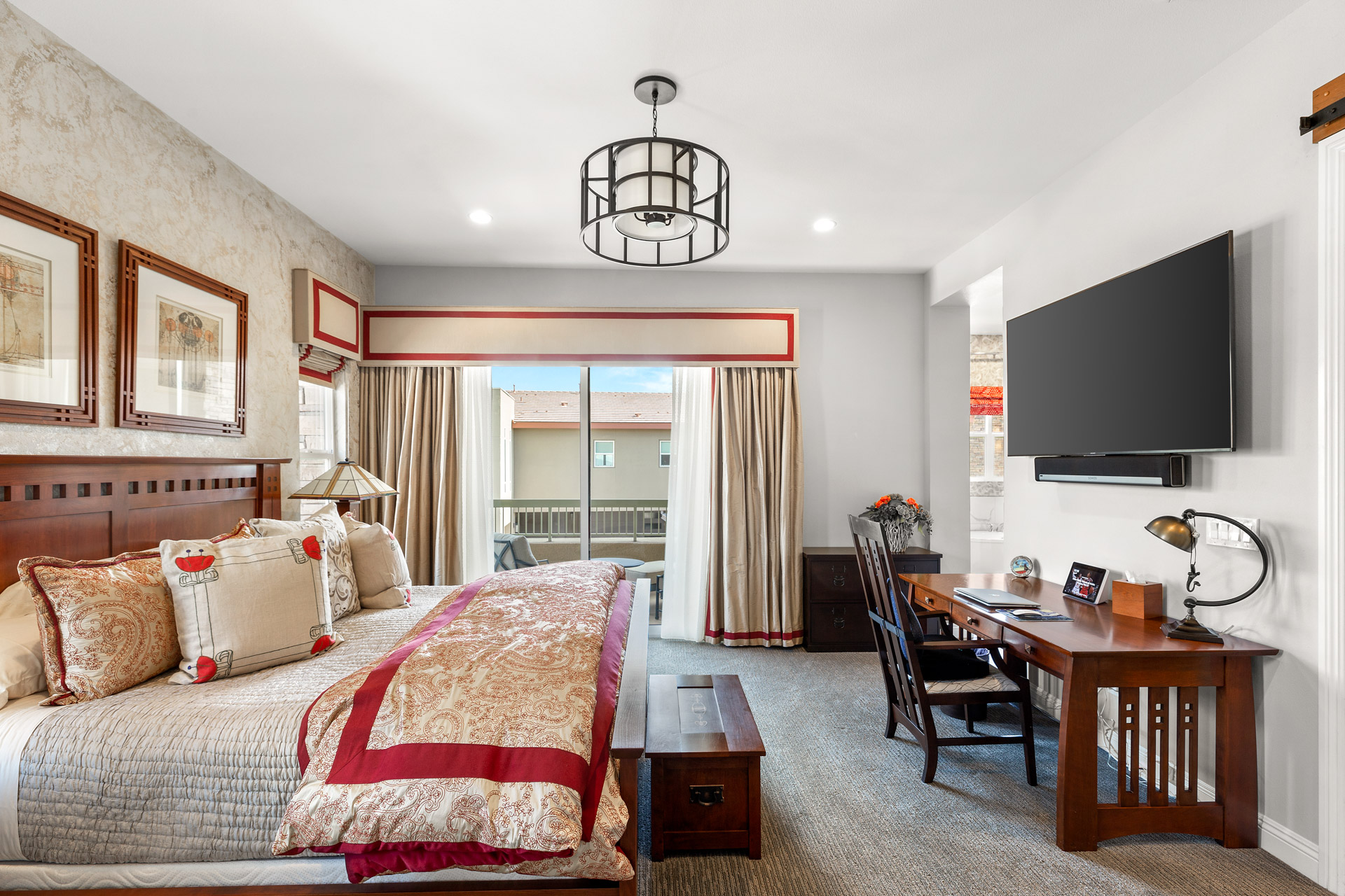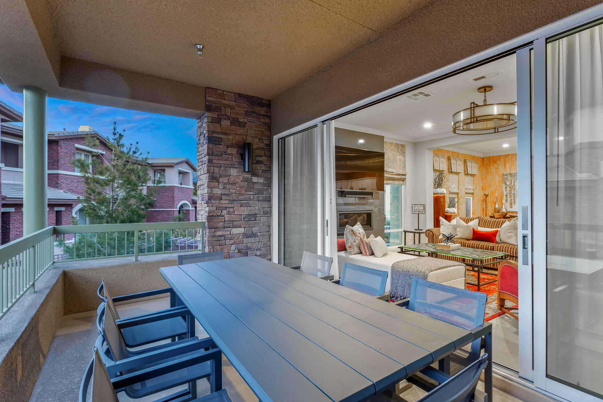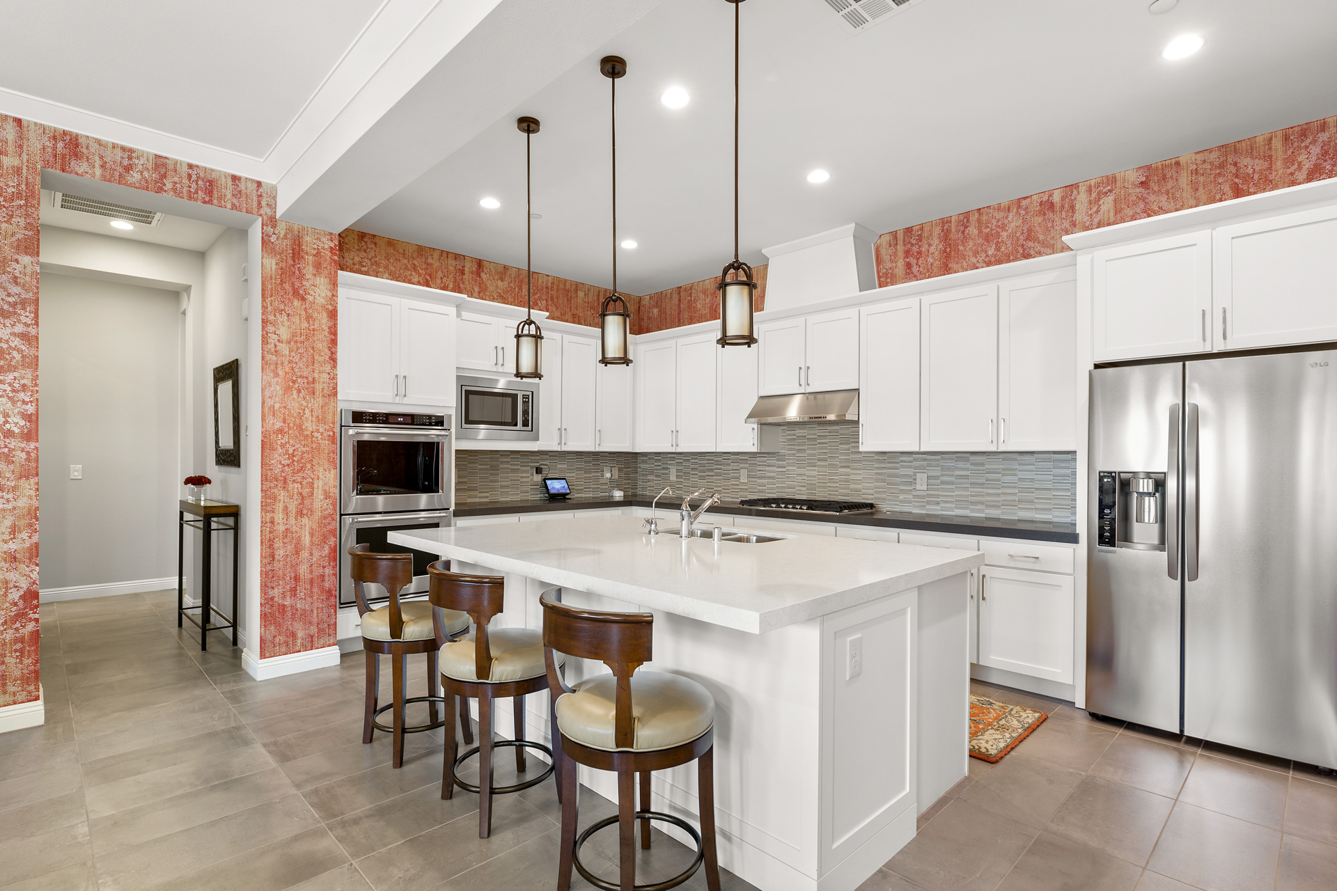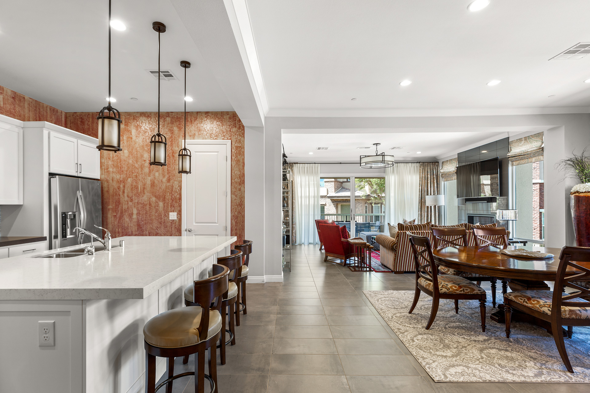 The main living space centers around a sleek fireplace wall perfect for a large-screen television to be placed above sandwiched between large windows that fill the space with natural light. The adjacent dining area is large enough for a table that comfortably seats at least six people. The well-designed kitchen, with double ovens and a built-in microwave, features a separate cooktop and hood, a large island sink, and bar seating for informal meals. Large tile flooring is used throughout the space, and colorful accent walls add spice to the living space. The condo also includes garage parking for two vehicles with elevator access to the main living area.