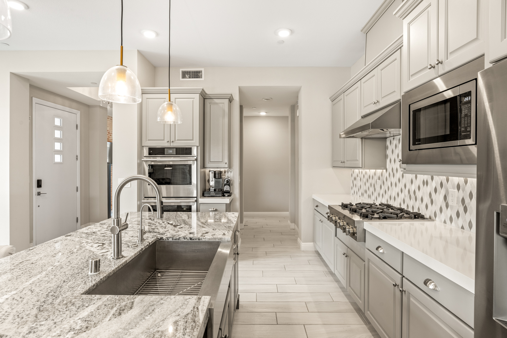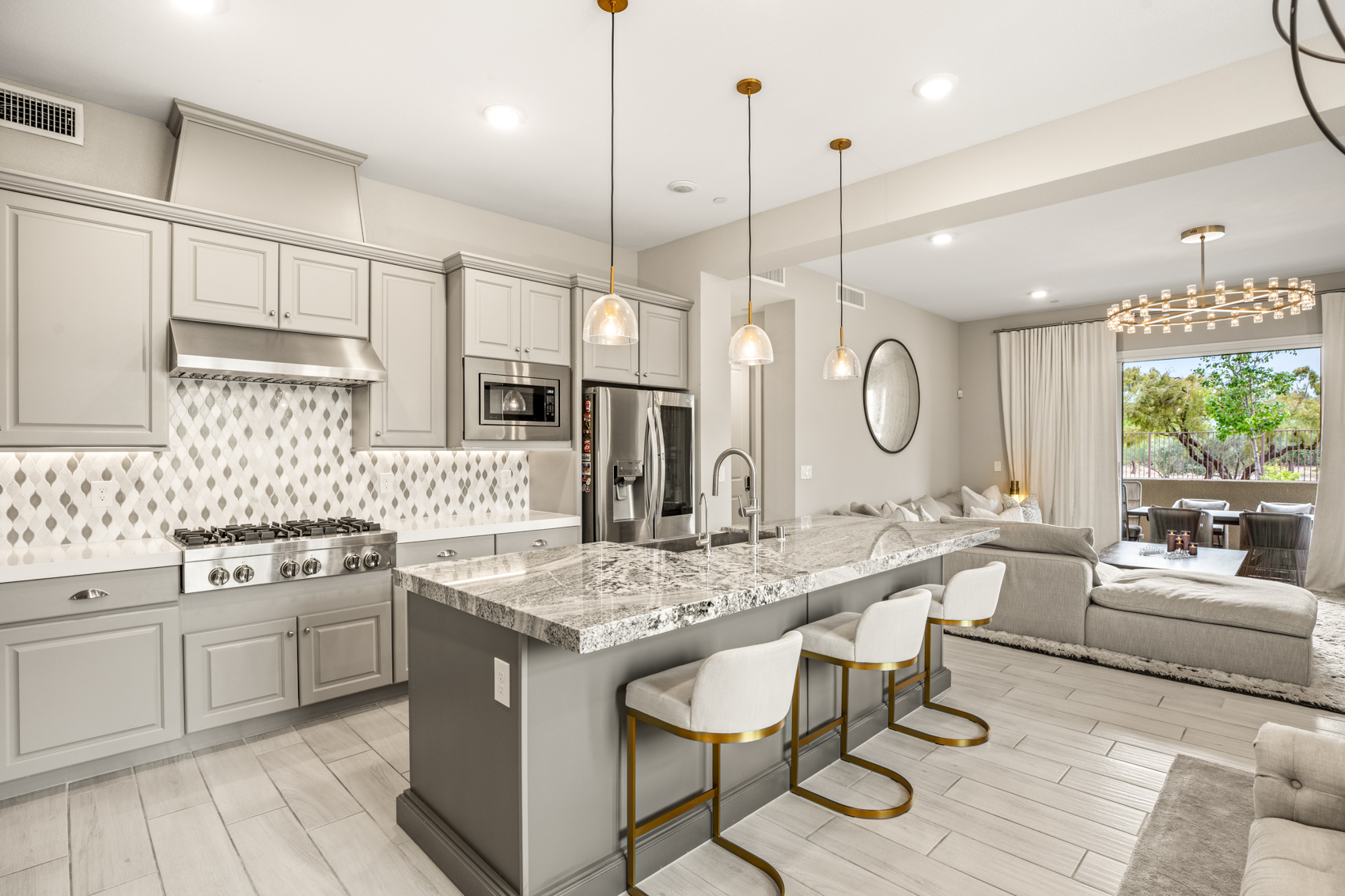 Spanning 2,037 square feet, the home features three spacious bedrooms and two beautifully appointed baths, thoughtfully designed to balance comfort and elegance. At the heart of the home, the gourmet kitchen impresses with premium stainless steel appliances, double ovens, sleek cabinetry, and generous counter space—perfectly suited for both everyday living and culinary pursuits. Thoughtfully curated finishes and designer upgrades elevate every space, while a private two-car garage adds convenience and privacy. Set within one of Summerlin’s most prestigious guard-gated communities, residents enjoy a lifestyle defined by manicured landscapes, sweeping views, and a sense of quiet exclusivity.